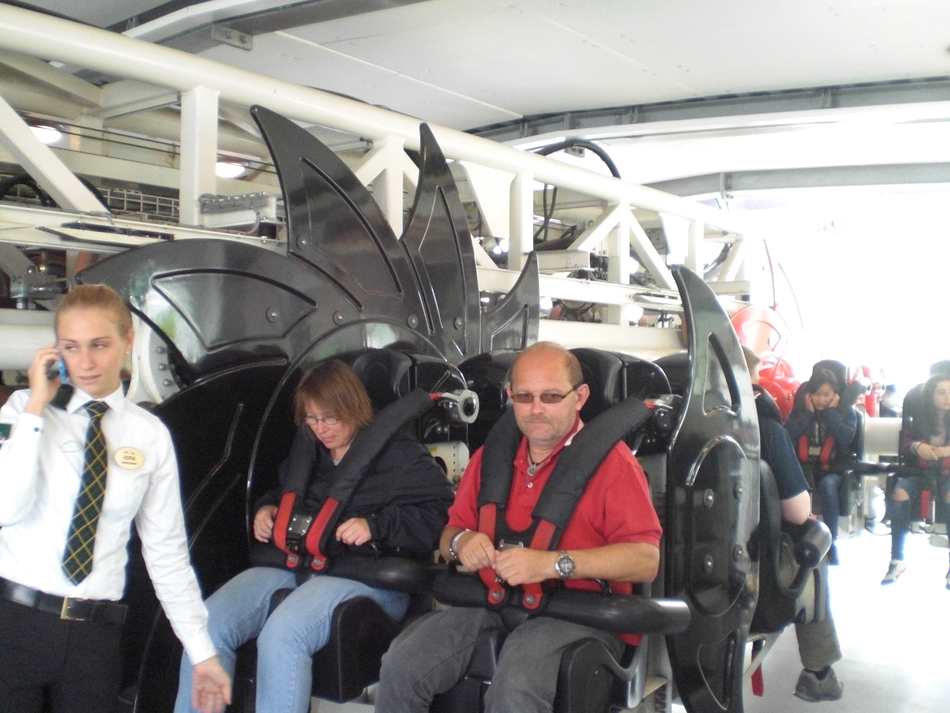 Ich meine, dass es meine erste Anlage dieses Typs war, Arthur dürfte ja nicht in diesen Bereich fallen. Nach ca. 15 Minuten Wartezeit konnten wir in dem Zug Platz nehmen. Es gibt nur einen, da das Layout ohne Zwischenbremse durchfahren wird. Im Zug Platz genommen, sinkt man etwas tief in den Sitz ein, was ungewohnt, aber nicht störend war. Sehr schön fand ich die sehr angenehmen Schoßbügel. Warum kann
