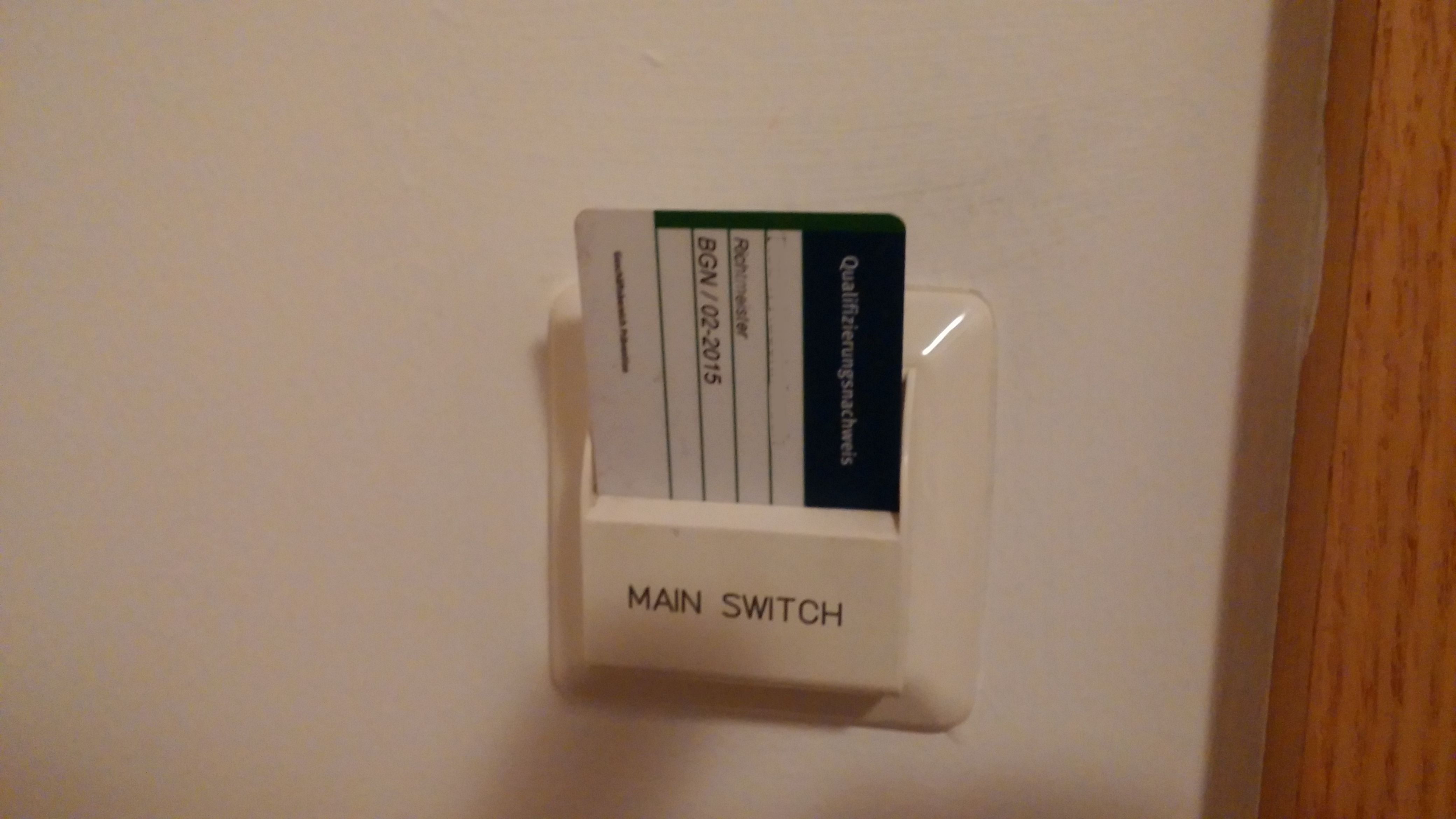Einfach mal ausprobiert und festgestellt: In diese nervigen Kartenleser in Hotelzimmern, in die man seine Schlüsselkarte reinstecken muss, um überhaupt Strom im Zimmer zu haben, kann man auch einfach irgendeine andere scheckkartengroße Karte reinstecken!