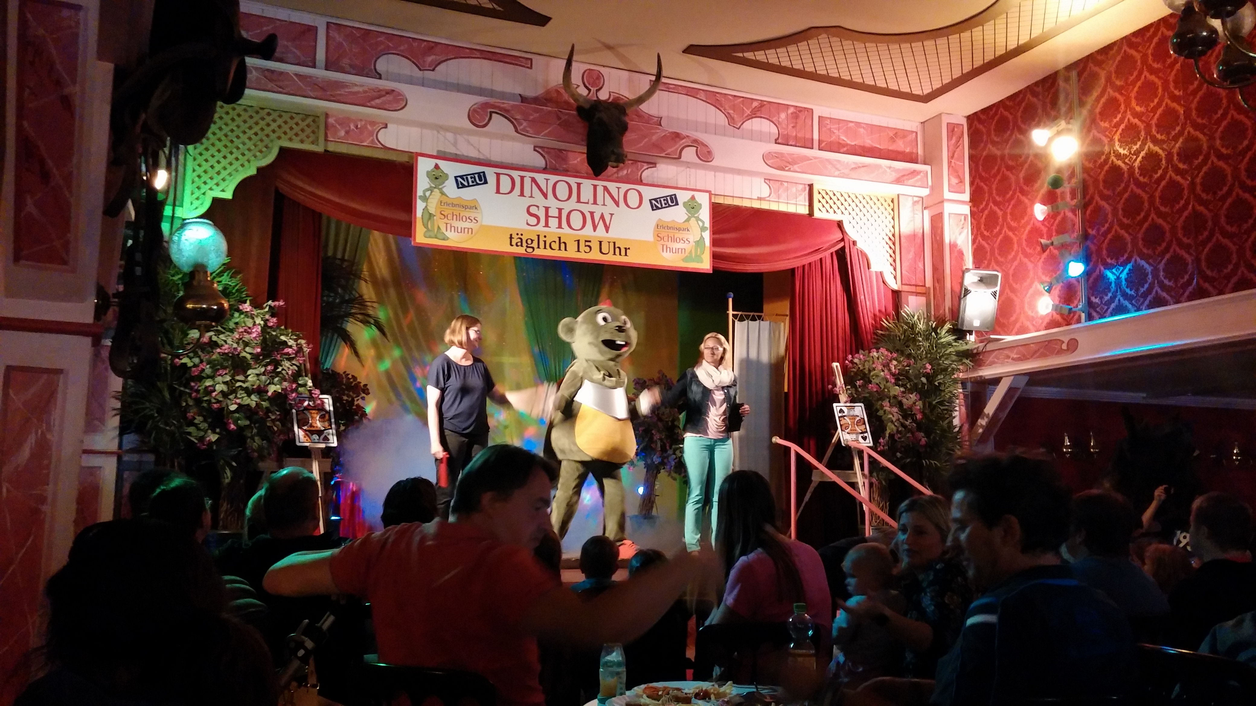 Das Parkmaskottchen zaubert hier höchstpersönlich. Und redet dabei. Auch höchstpersönlich. Sprich: Der Darsteller hat irgendwo in seinem Ganzkörper-Dinokostüm-Kopf noch ein Mikrofon. Sieht kaum was, hat Handschuhe an, zaubert dabei und geht mit oft ziemlich frechen Sprüchen auch noch dauernd auf's Publikum ein - vor der Leistung habe ich ziemliche Hochachtung.