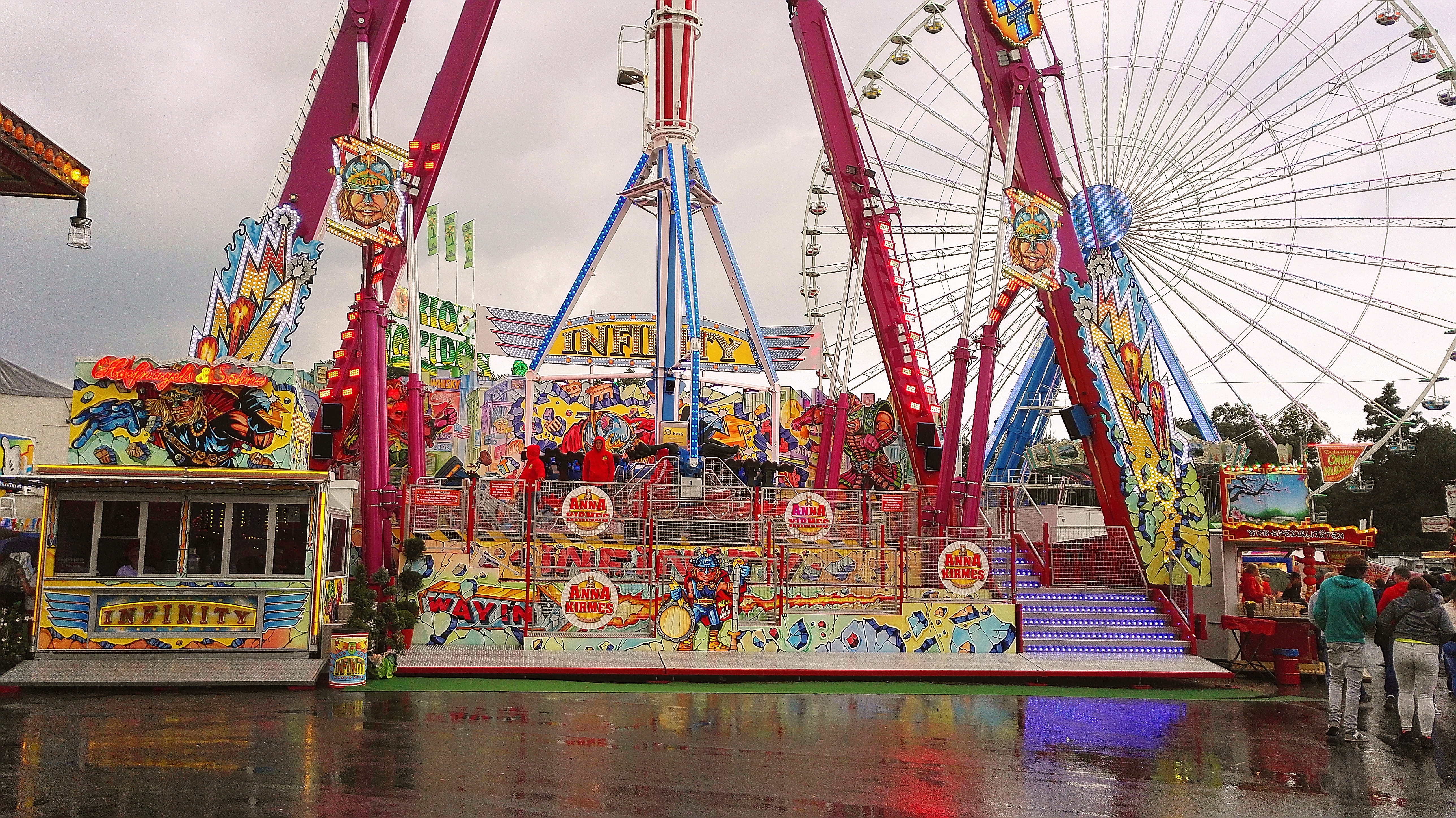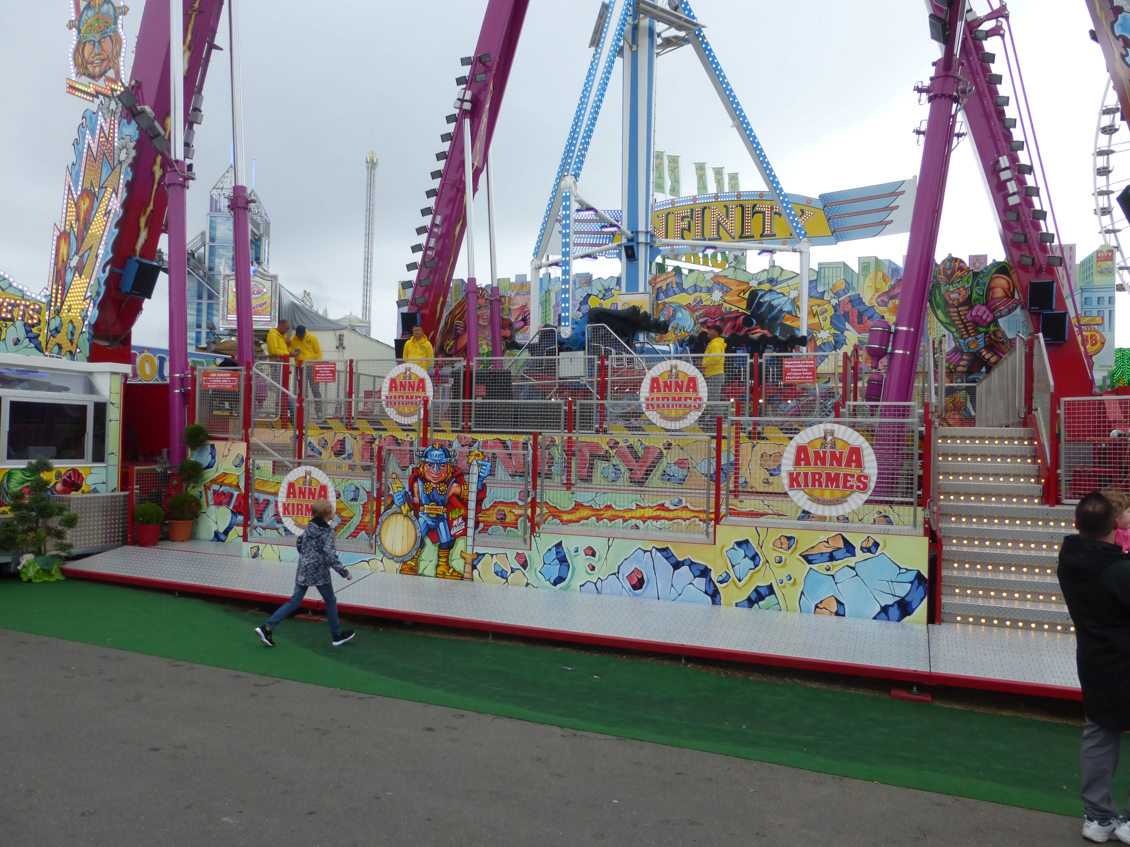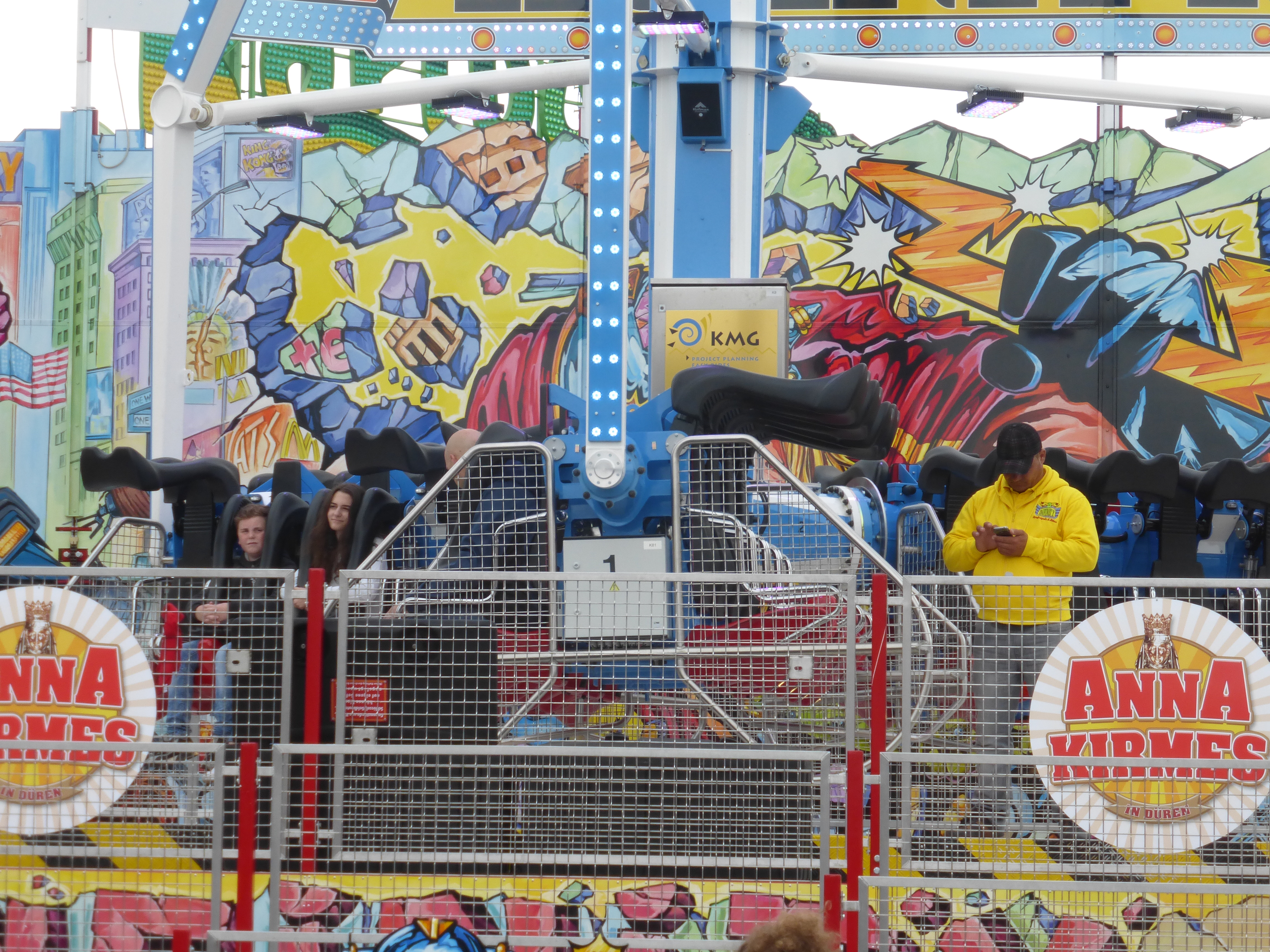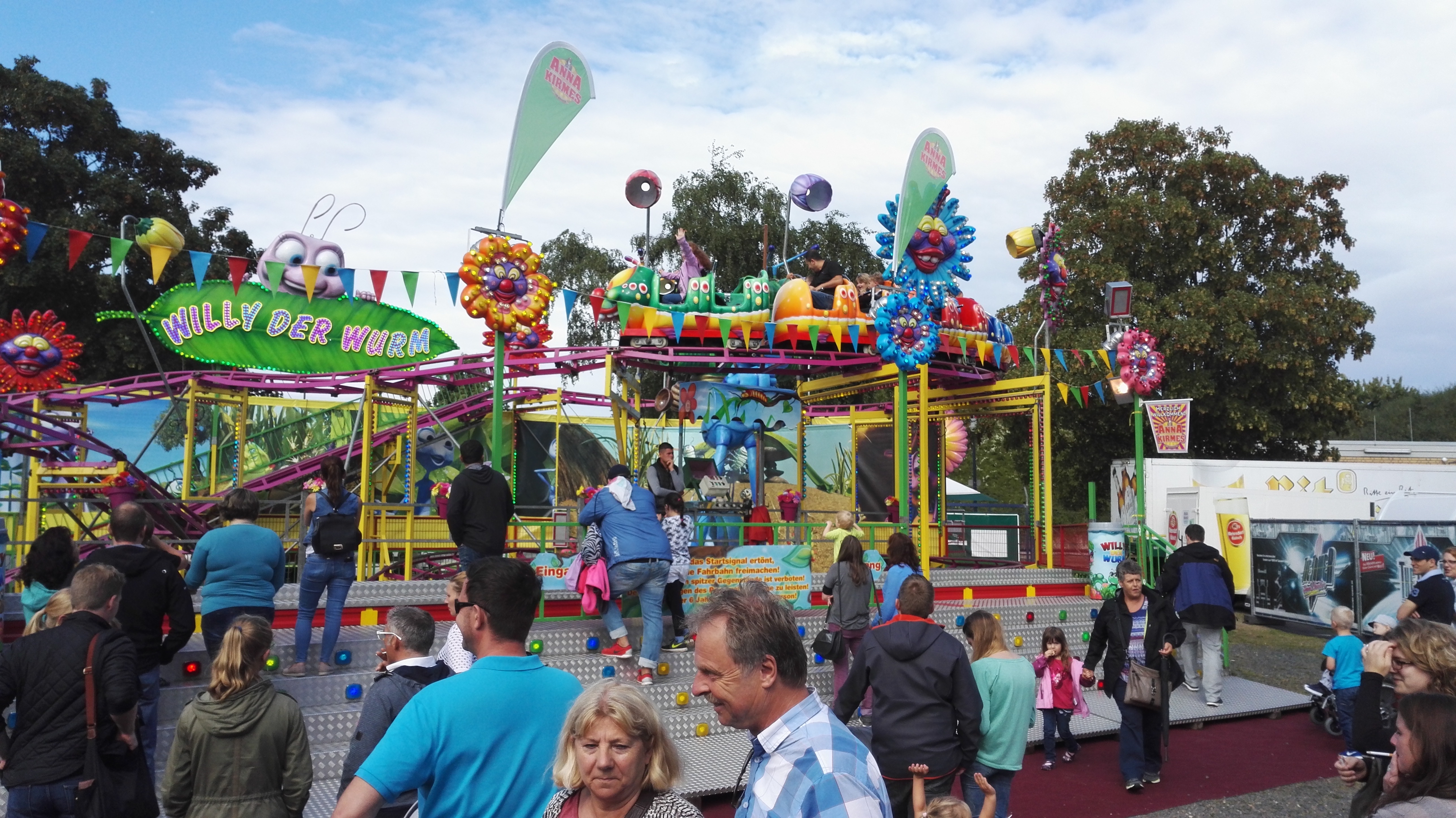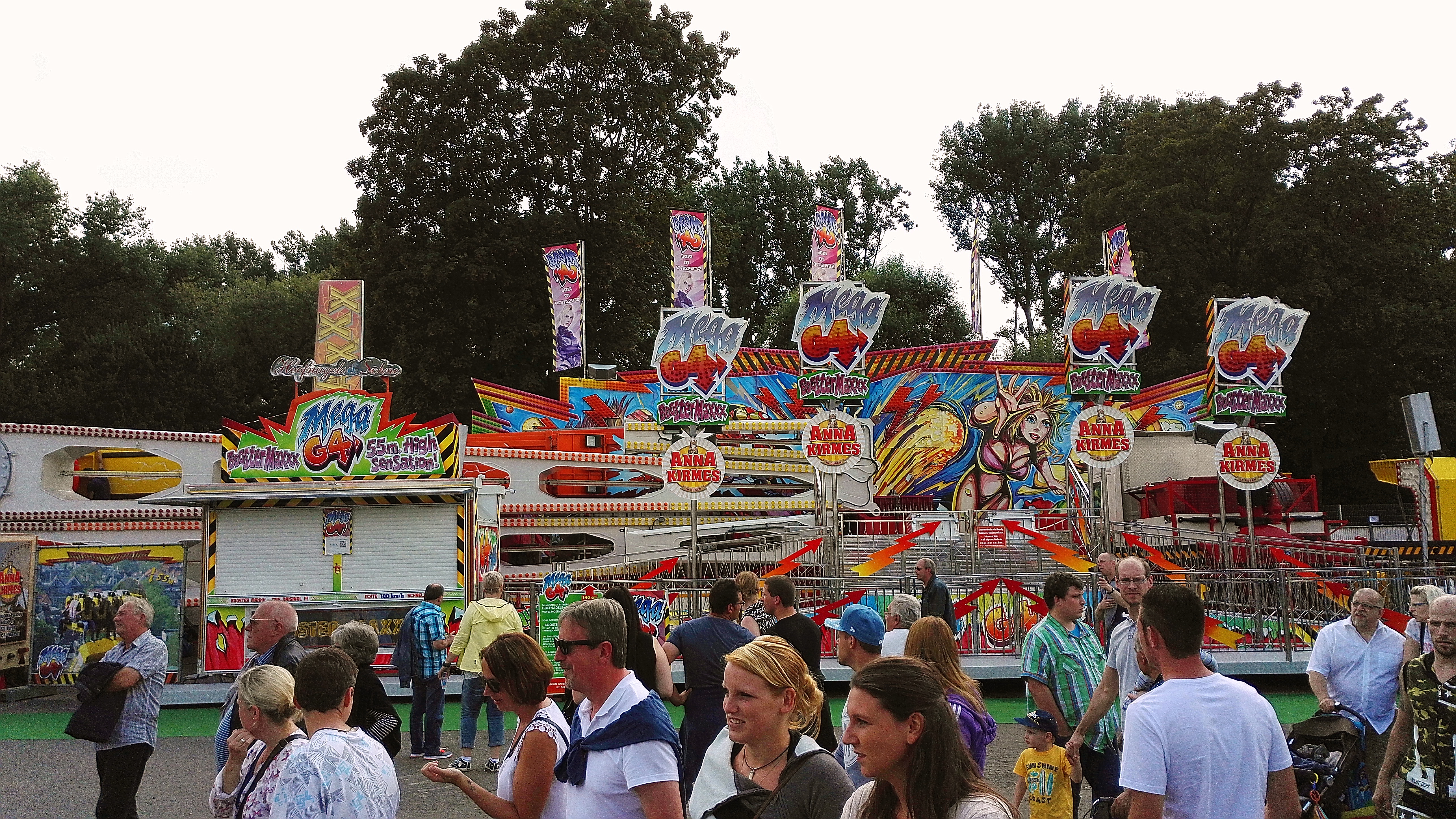 habe gestern am Familientag einen schönen Nachmittag auf der Anna-Kirmes verlebt. Die Preise der Fahrgeschäfte (und der Gastro) waren super und luden zum vergnügten Fahren ein: den Skyfall gab es für 3 Euro mit konsequent 2 Fällen, Infinity auch 3 Euro, ebenso der Booster G4 für 3 Euro. Der Familientag in Düren ist eine Bank! Diese Thrillrides waren im Nachmittagsbereich schwach besucht, wohingegen die Kiddierides, der Flipper!!!, Rio Rapidos und die beiden Autoscooter gut frequentiert waren. Erwartungsgemäß schwer hatte es der Avenger im Schatten des Infinity. Der Drifting-Coaster fuhr im 7-Chaisen-Betrieb und wurde neugierig vom Publikum getestet. Ich fand den schon beim Zusehen scheiße, was für eine knarziger Kasten. Sicherlich lag es auch am durchwachsenen Wetter in den Morgenstunden, dass viele Besucher am Nachmittag noch abgehalten hatte. Doch das Wetter war stabil, bestes Jäckchen-Wetter, Glück gehabt. Das änderte sich schlagartig gegen 18.00, dann strömten die Dürener auf ihre geliebte Anna-Kirmes und auch der der Infintiy war sofort voll belegt gewesen von der Teenager-Zielgruppe. Diese hatte dann wohl ausgechilled und ausgeschlafen:) Düren scheint mir aber generell eine Abendveranstalung zu sein. Übrigens, für 30 Euro kann man eine Infinity 5-Chip-Collection kaufen, sehr edel, aber nicht gerade billig. Macht euch ein Bild vom Familientag anhand der Fotos.