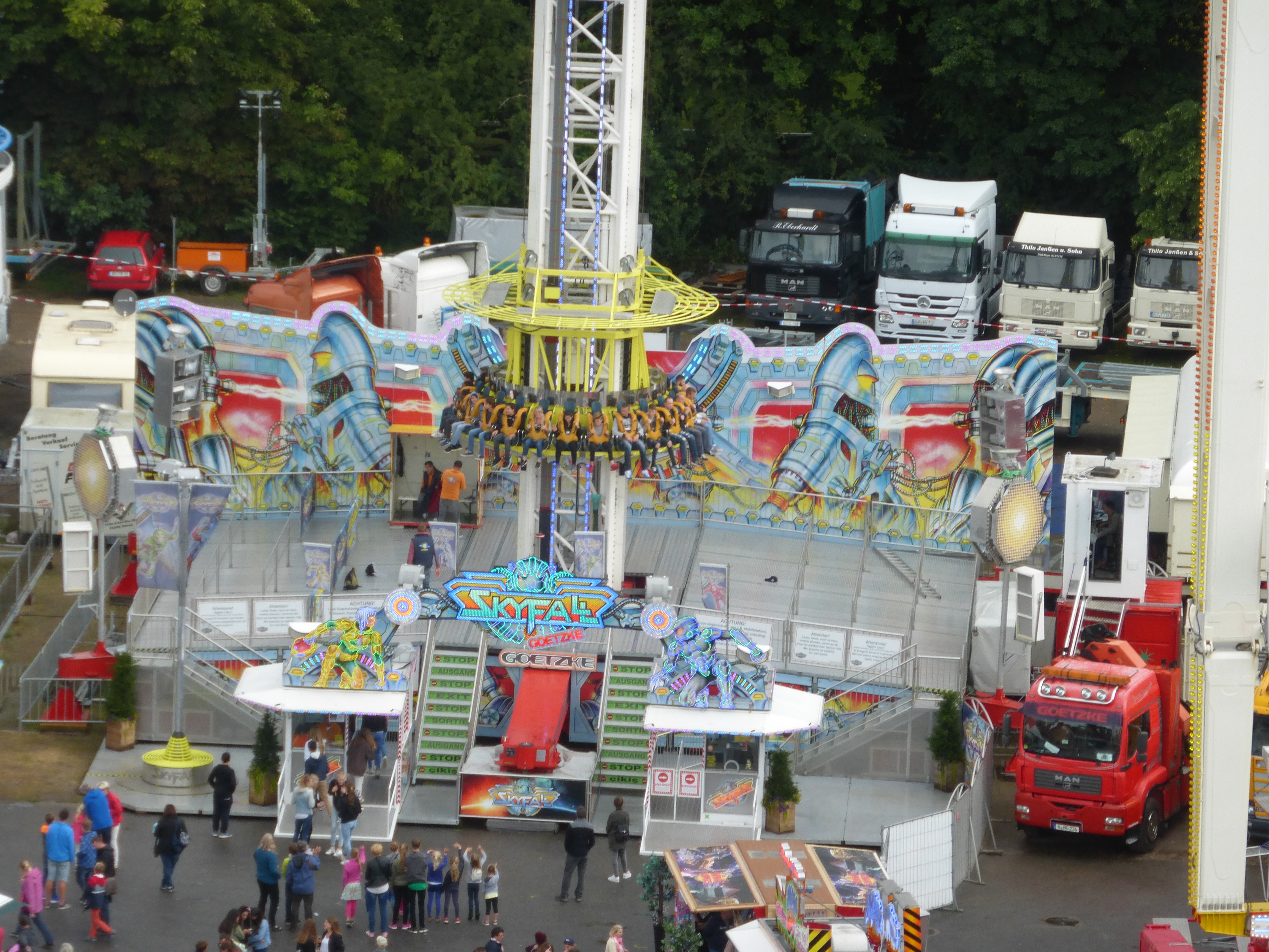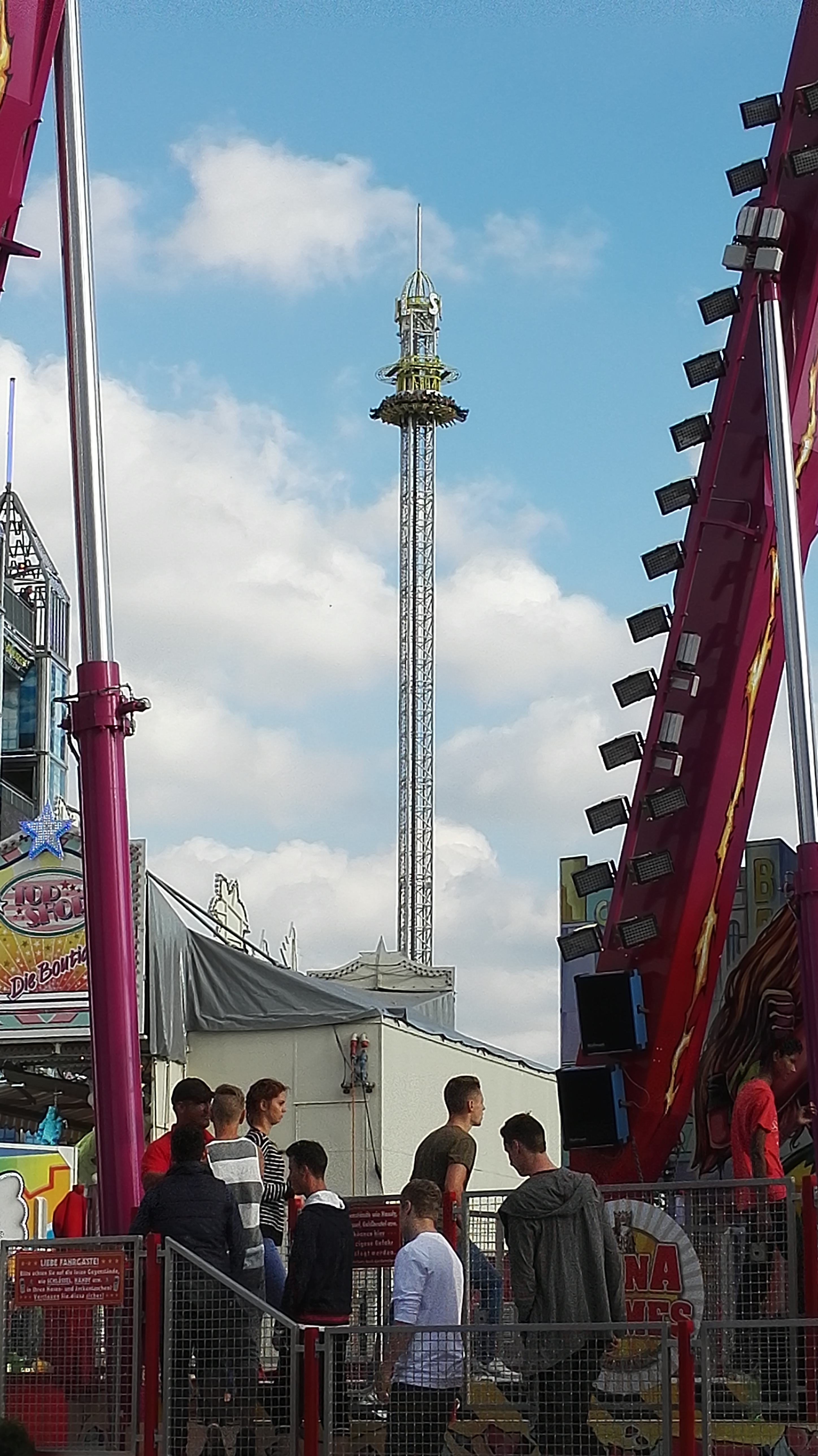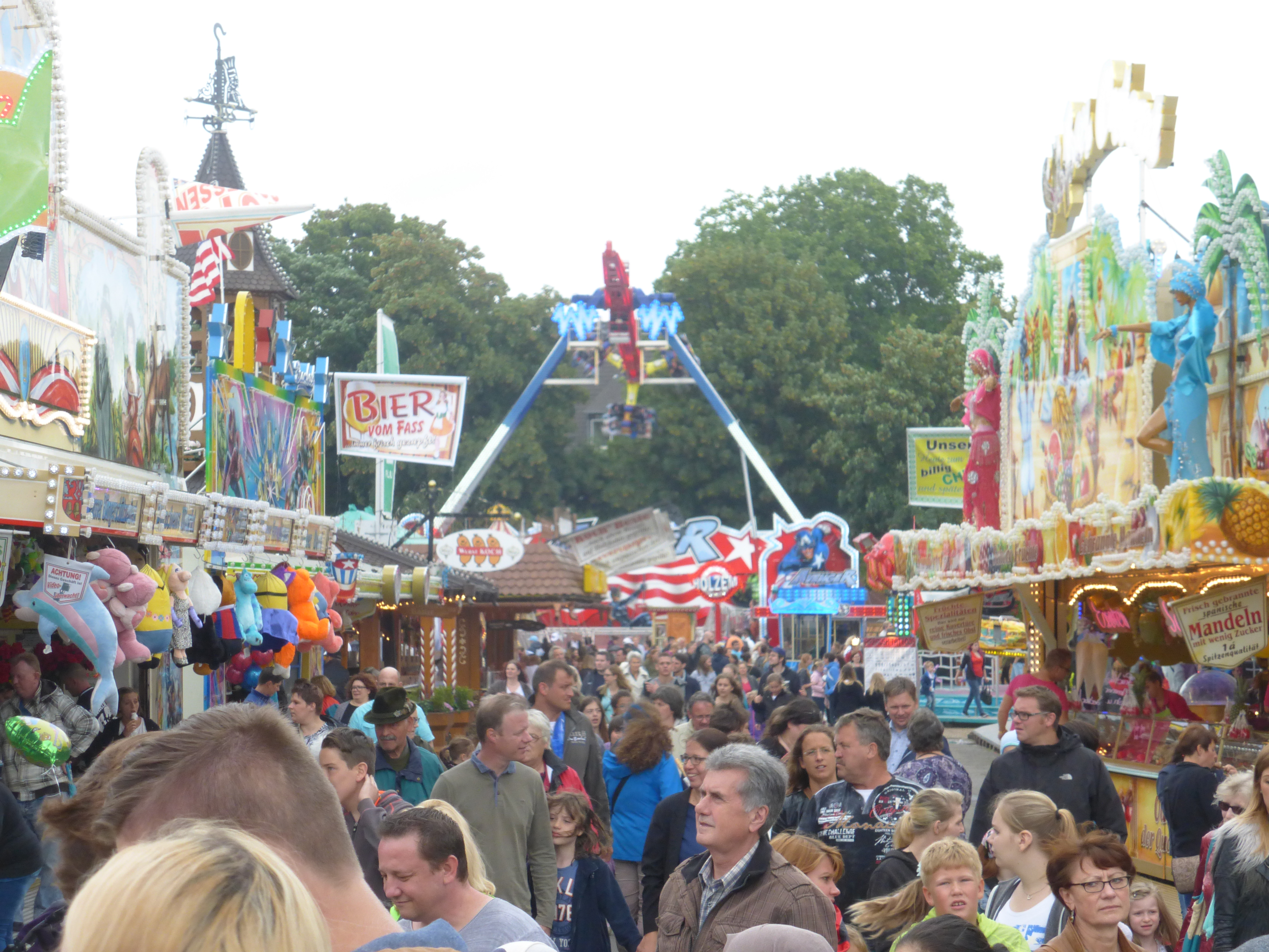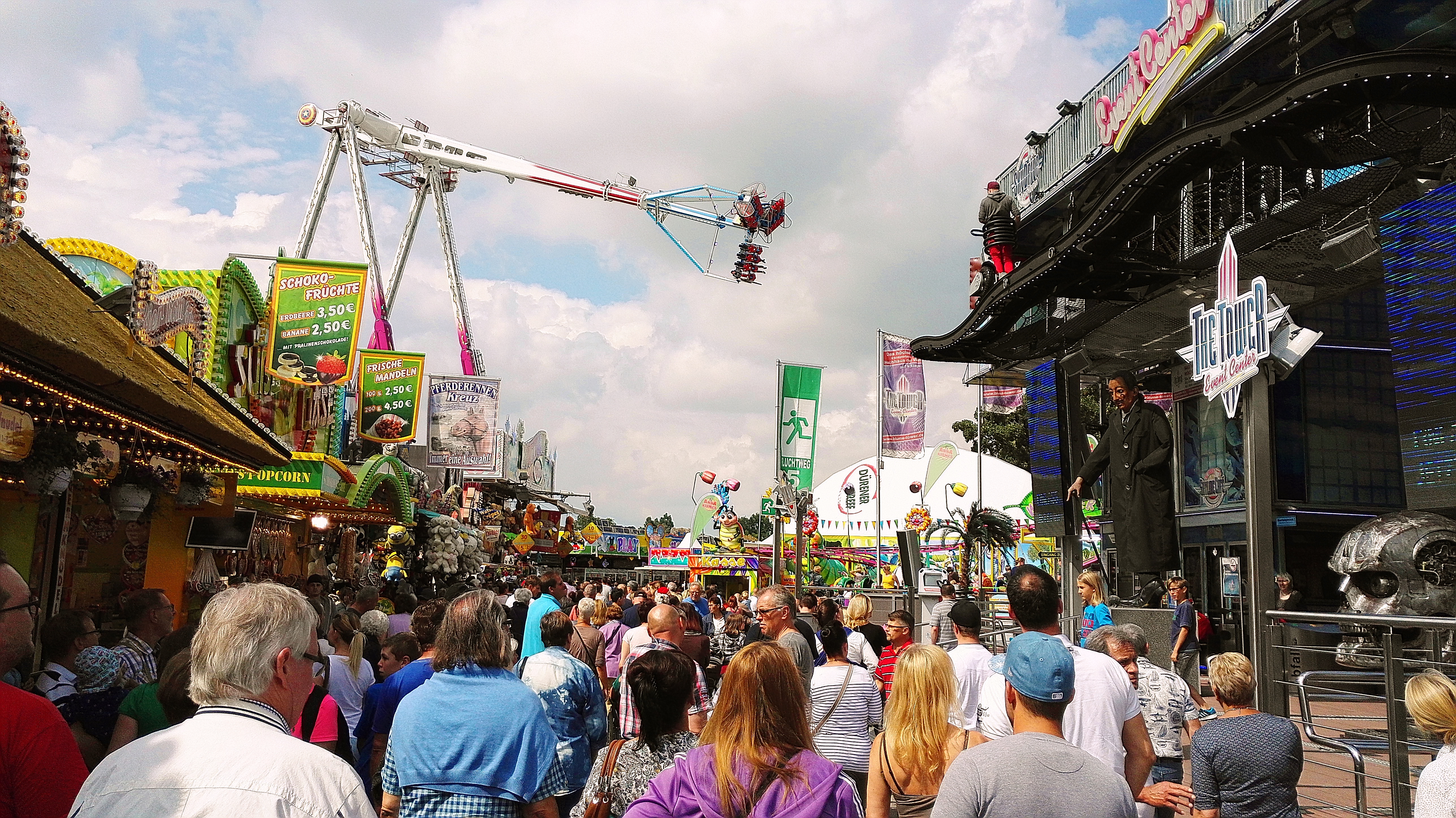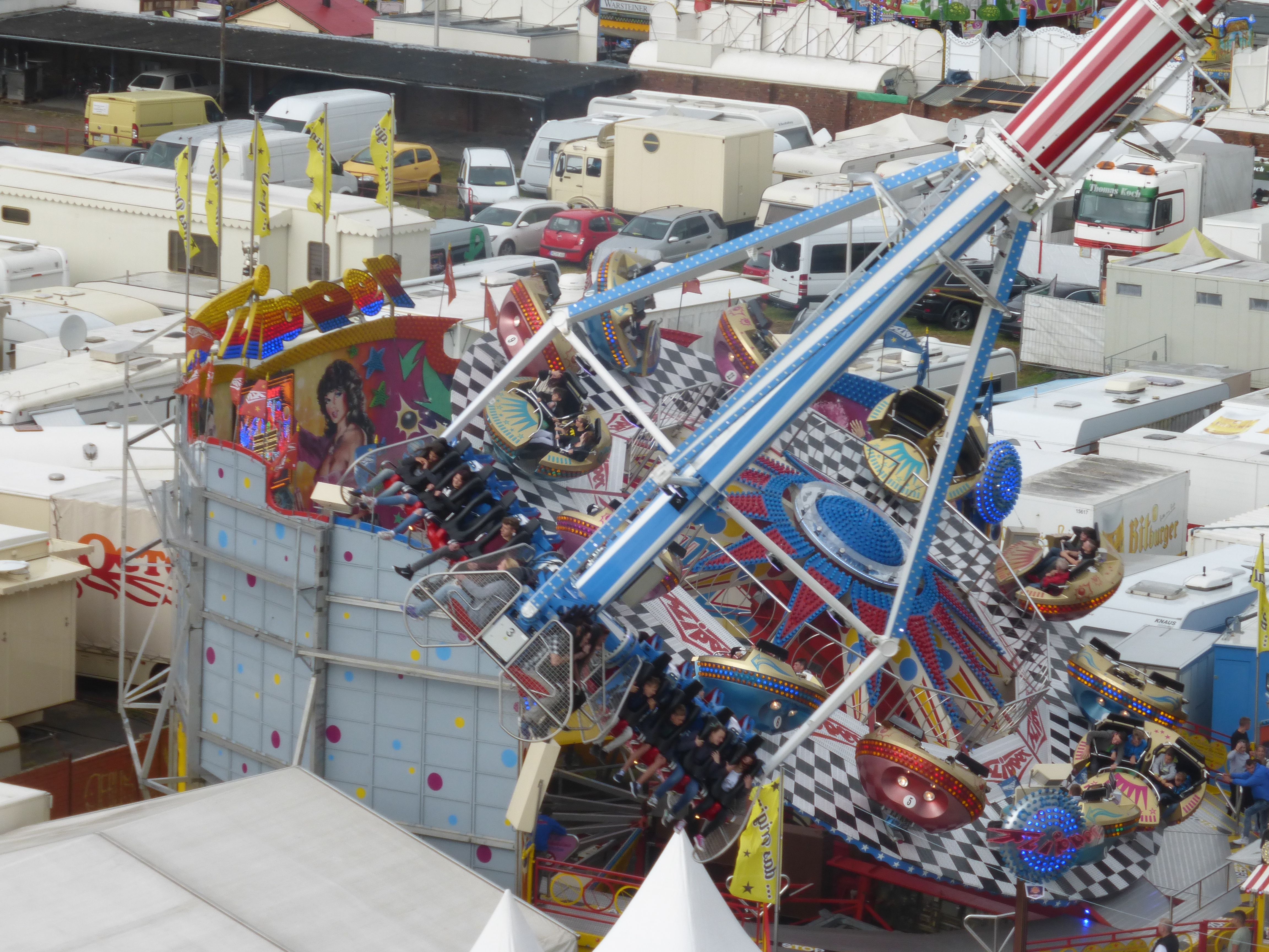 habe gestern am Familientag einen schönen Nachmittag auf der Anna-Kirmes verlebt. Die Preise der Fahrgeschäfte (und der Gastro) waren super und luden zum vergnügten Fahren ein: den Skyfall gab es für 3 Euro mit konsequent 2 Fällen, Infinity auch 3 Euro, ebenso der Booster G4 für 3 Euro. Der Familientag in Düren ist eine Bank! Diese Thrillrides waren im Nachmittagsbereich schwach besucht, wohingegen die Kiddierides, der Flipper!!!, Rio Rapidos und die beiden Autoscooter gut frequentiert waren. Erwartungsgemäß schwer hatte es der Avenger im Schatten des Infinity. Der Drifting-Coaster fuhr im 7-Chaisen-Betrieb und wurde neugierig vom Publikum getestet. Ich fand den schon beim Zusehen scheiße, was für eine knarziger Kasten. Sicherlich lag es auch am durchwachsenen Wetter in den Morgenstunden, dass viele Besucher am Nachmittag noch abgehalten hatte. Doch das Wetter war stabil, bestes Jäckchen-Wetter, Glück gehabt. Das änderte sich schlagartig gegen 18.00, dann strömten die Dürener auf ihre geliebte Anna-Kirmes und auch der der Infintiy war sofort voll belegt gewesen von der Teenager-Zielgruppe. Diese hatte dann wohl ausgechilled und ausgeschlafen:) Düren scheint mir aber generell eine Abendveranstalung zu sein. Übrigens, für 30 Euro kann man eine Infinity 5-Chip-Collection kaufen, sehr edel, aber nicht gerade billig. Macht euch ein Bild vom Familientag anhand der Fotos.