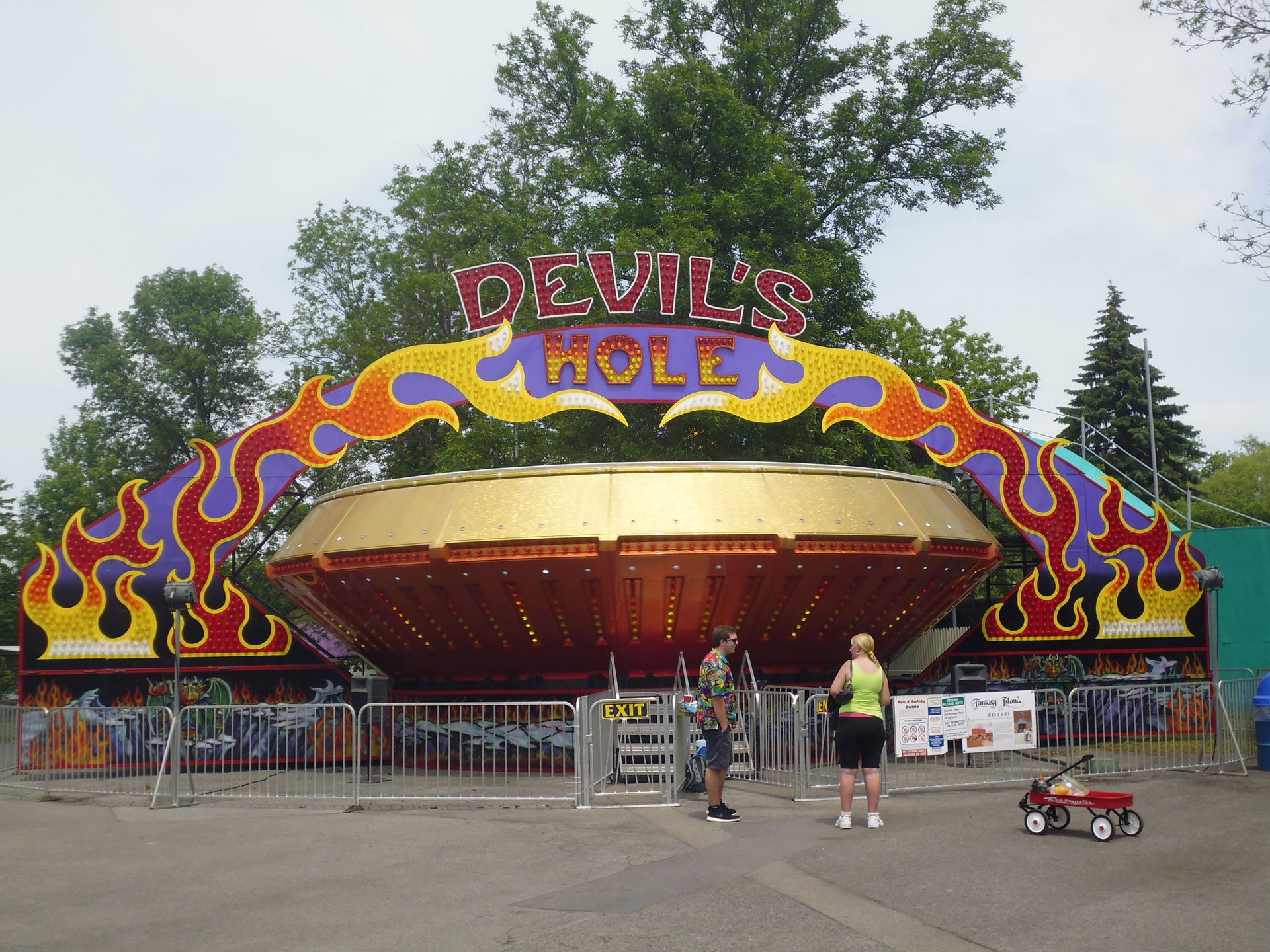 Auch vorhanden war hier eine Premiere für mich, ein Starship namens Devil's Hole. Vom Fahrerlebnis und dem Druck her weniger spektakulär als ein Round-up oder ein Huss UFO, aber das wird selbstredend durch die kuriose Innengestaltung der Zentrifuge wieder wettgemacht. Besonders die musikalische 80er-Synthie-Pop-Musikbegleitung durch den DJ/Ride-OP in der Mitte und die leicht "hochfahrenden" Schrägwände, gegen die man sich lehnen muss, sind natürlich extrem speziell und einfach kultig!