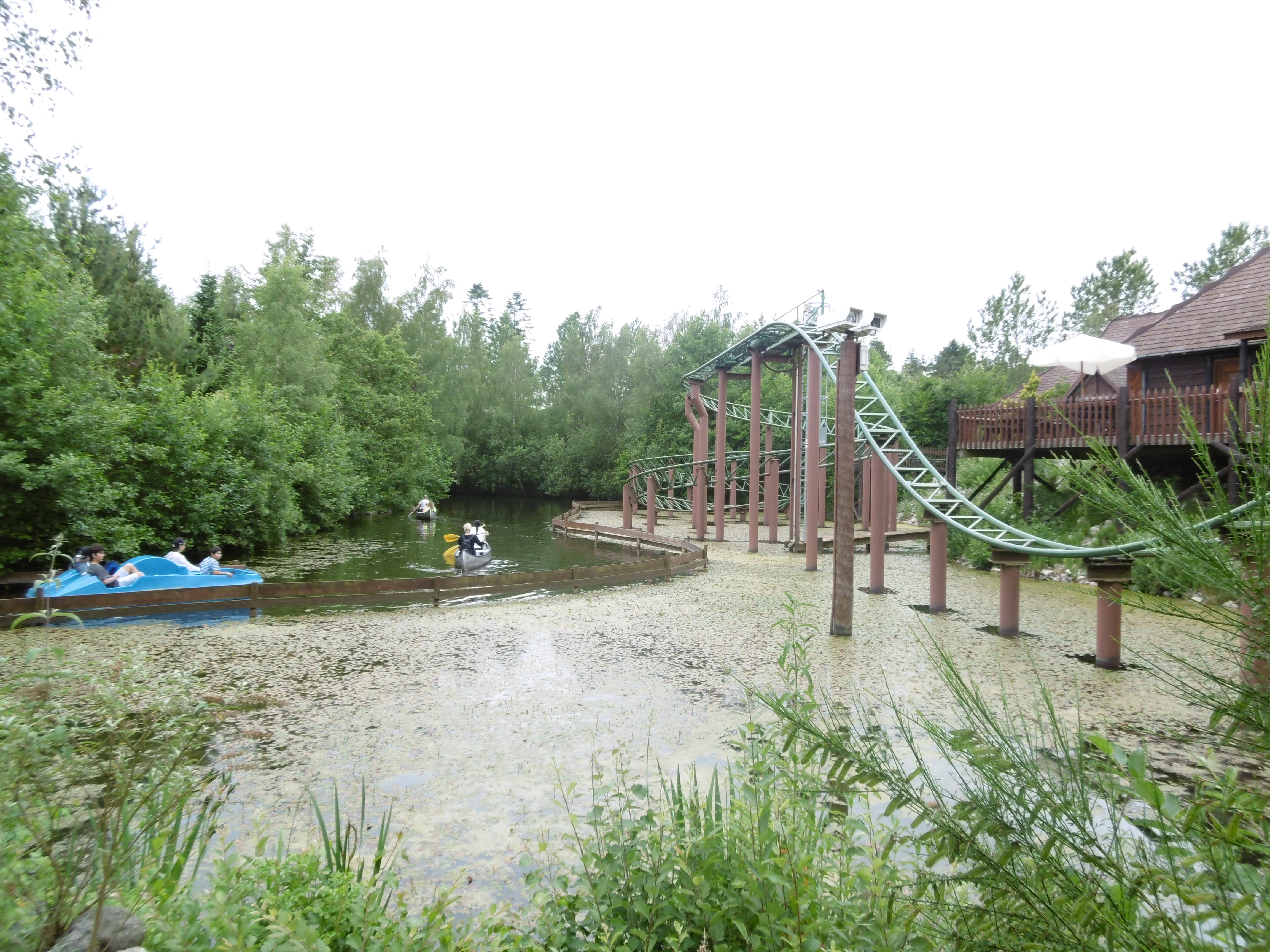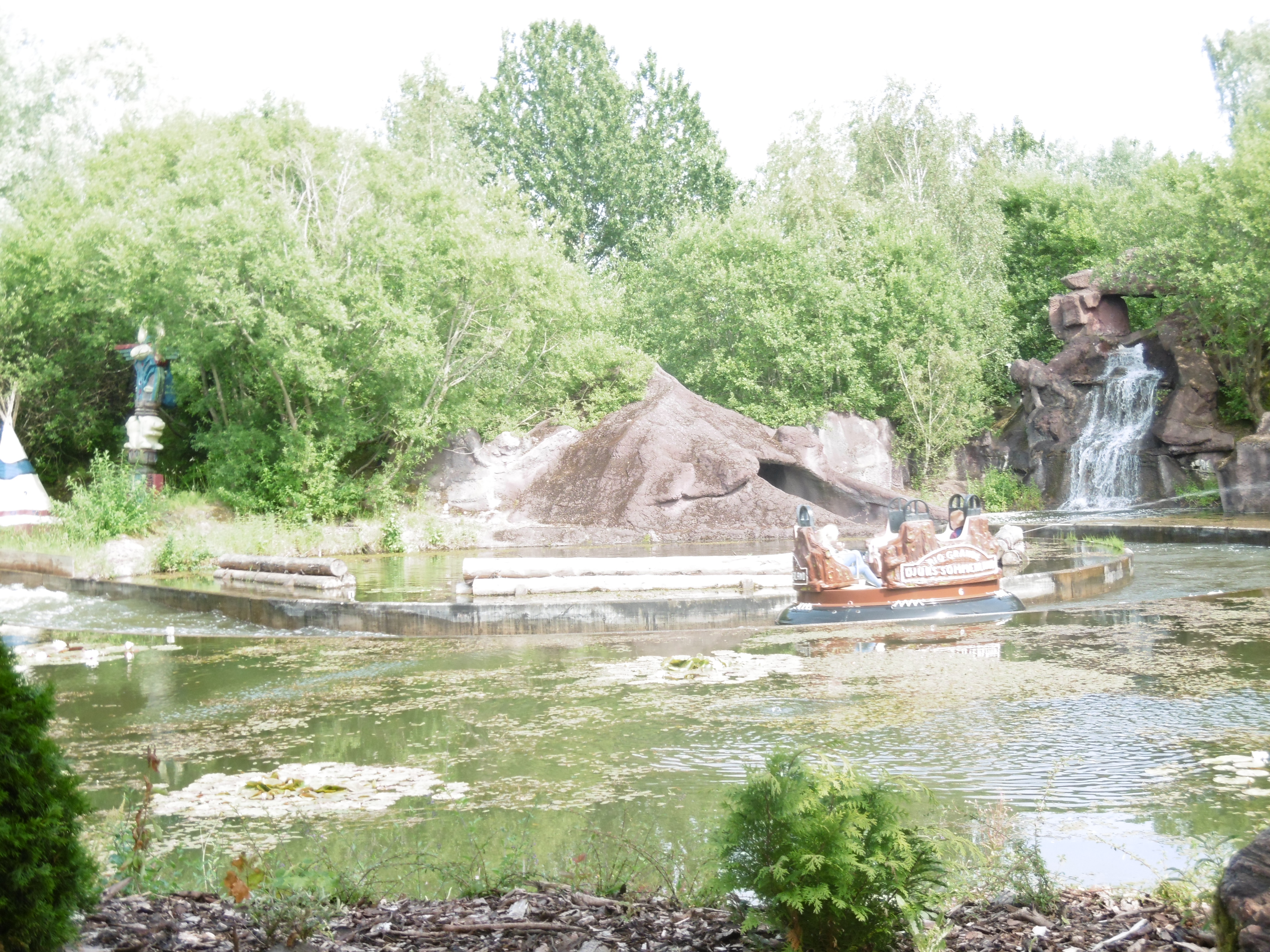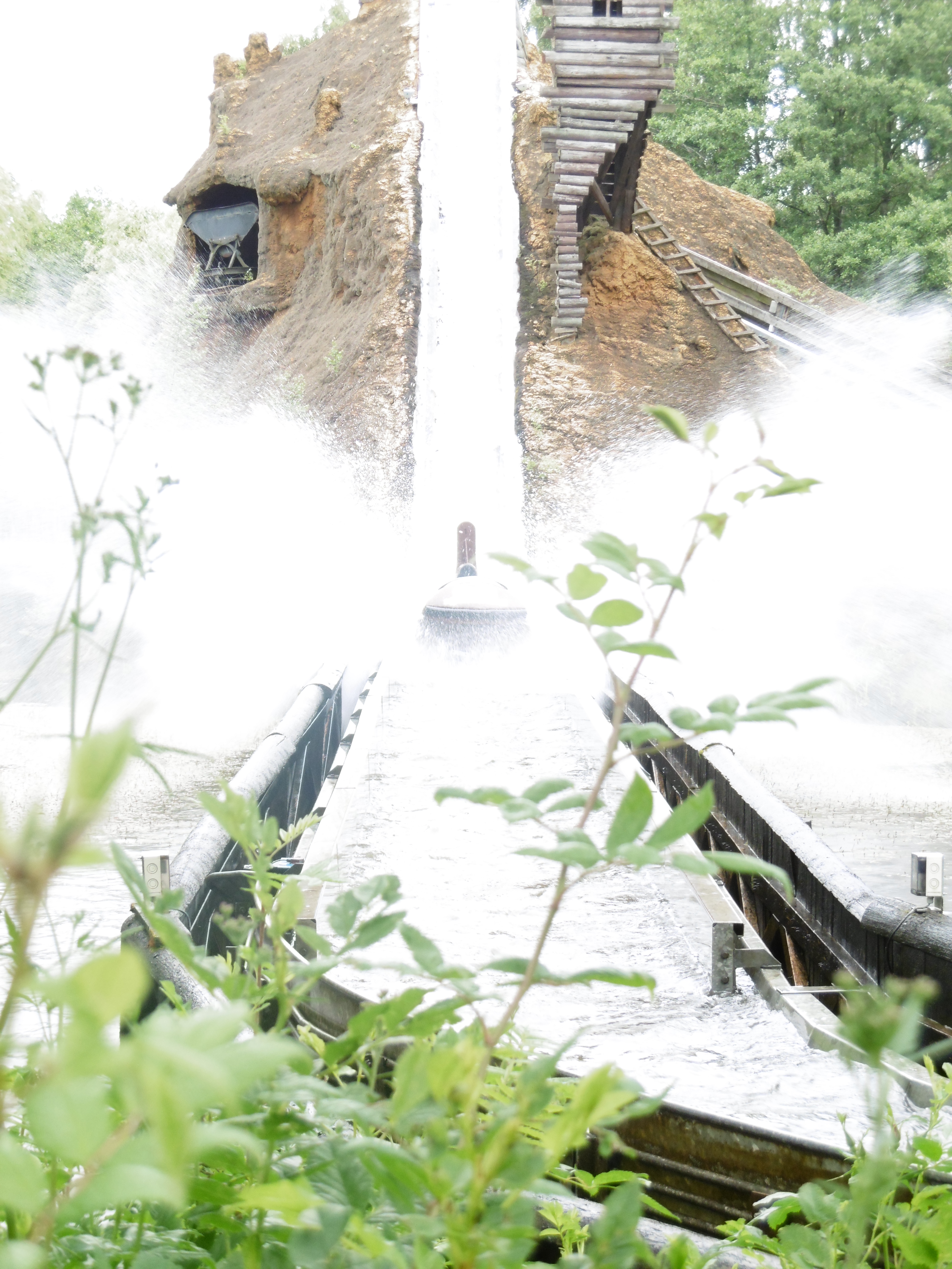 Diesen kann man zu Fuß erreichen oder durch eine Abkürzung in die kleine Senke, in der der Log flume steht, hinunterrutschen. Dort besteigt man dann unter den Augen eines doch sehr jung wirkenden Mitarbeiters (vermutlich der Sohn des Herrn hinter dem Steuerpult) eines der Boote. Die Wasserqualität kann man am besten mit den Worten von Holger beschreiben: "Eine bodenständige Wildwasserbahn. Das Wasser hat nämlich einen erdigen Charakter." Weder dieses, noch die etwas komisch wirkende Thematisierung des Bergs hielt uns jedoch von einer Fahrt (in nun größerer Gruppe) ab und so ging es auf eine Fahrt mit dem Hersteller Interlink durch die nette Natur. Die beiden großen Schussfahrten sind dabei nicht sonderlich bespritzend, wohingegen die mittlere Abfahrt mit einer Bremsstrecke von einer Länge zwischen minimal und nicht vorhanden glänzt. So kam es, dass dies trotz kaum erhöhter Abfahrt die nasseste Stelle ist und man durch die schnell folgende Kurve im Boot gut herumgeschleudert wird. Dieses Erlebnis gab es auf der Tour schon ein weiteres Mal, weswegen ich etwas darauf eingestellt gewesen war.