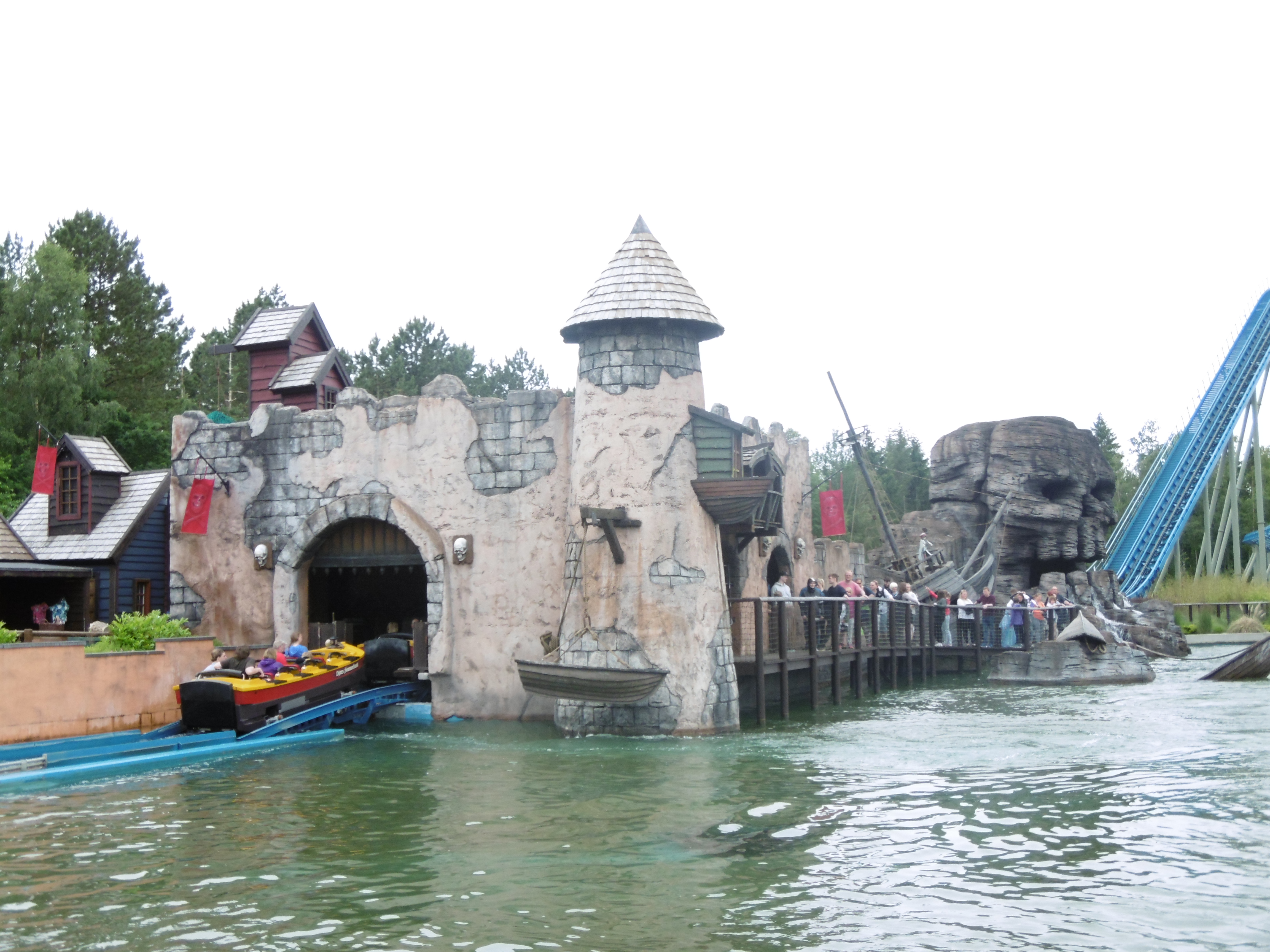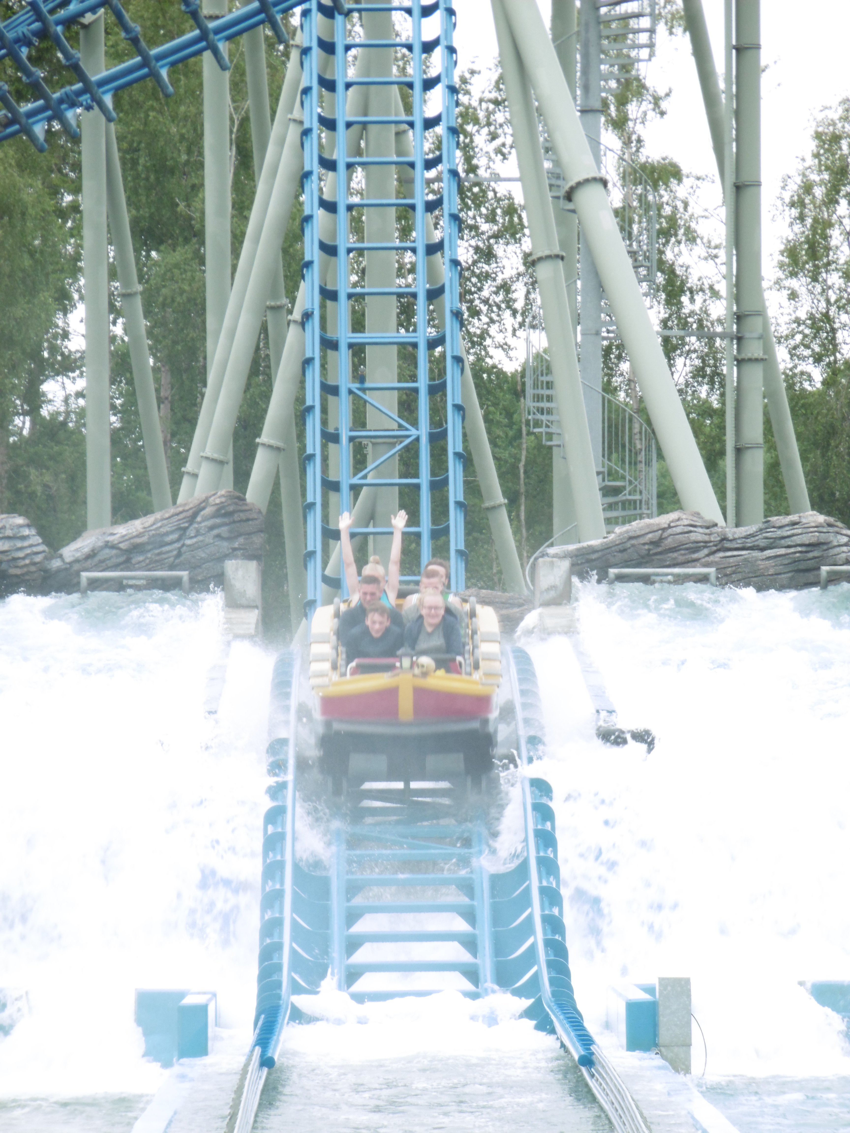 Erwähnenswert sind hierbei das erste Wellenbecken und die folgende Welle, die nicht über die Sitze, sondern darunter zwischen Sitzschale und Boot hineingeschwappt kam. Dieses Bild der Wassermassen hat sich gut eingebrannt und Kevin konnte danach den Tag mit nassen Schuhen verbringen. Mich selbst hat es erst ganz zum Schluss der Fahrt erwischt, als man durch eine kleine Häuserzeile fährt und ein netter Damenanimatronic ein teuflisches Gelächter verbunden mit einem entleerenden Eimer Wasser ausstieß. Es war ein schönes Rafting, das von der Warteschlange an über die Station und der Fahrt hinweg nett gestaltet war.