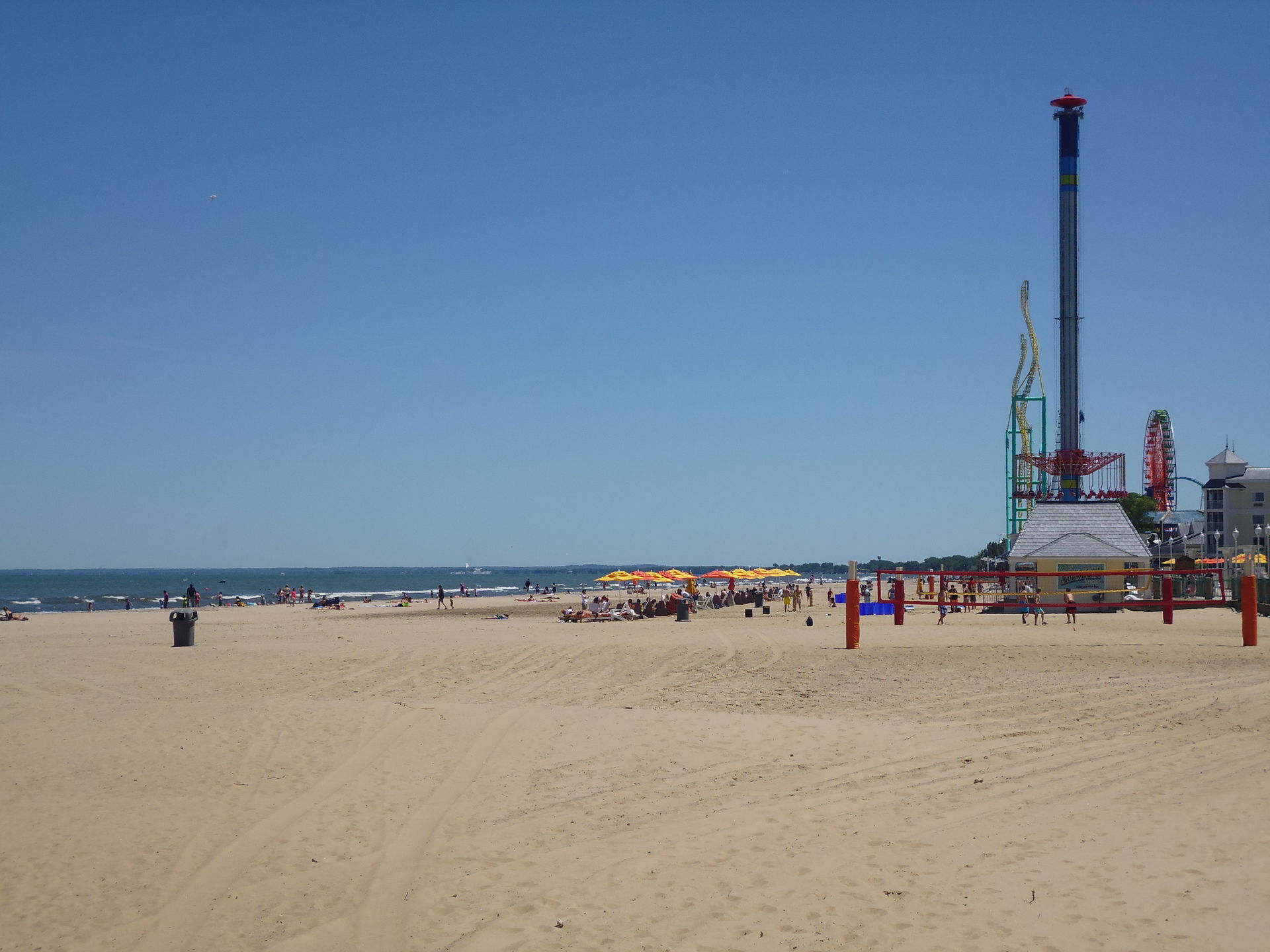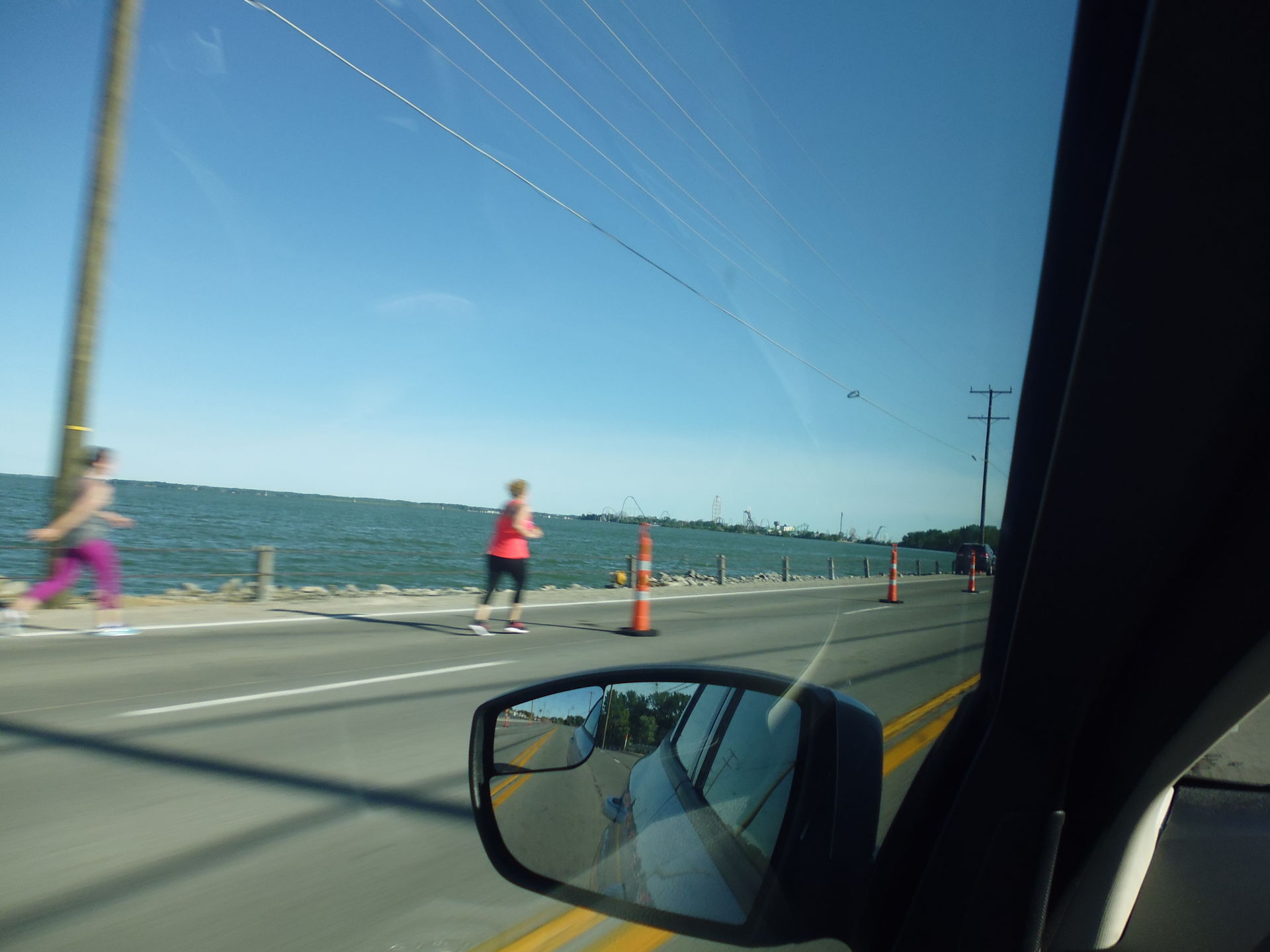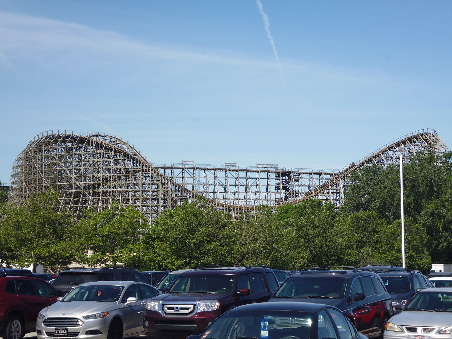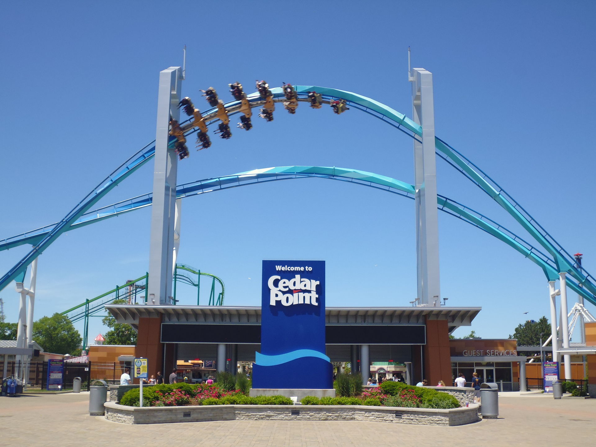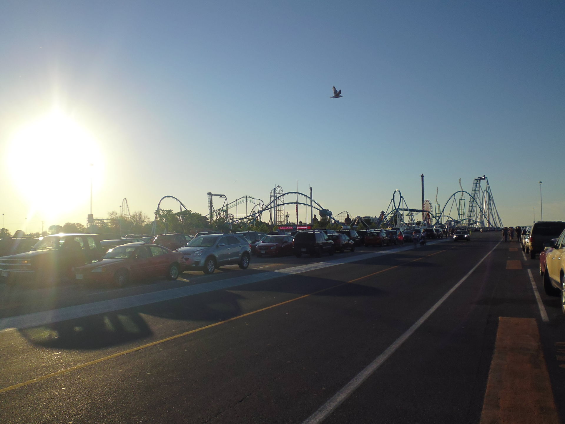 Wohlan! In Sandusky eingetroffen und bald wieder sabbernd über den Causeway auf die mir inzwischen seltsam vertraute Halbinsel hinausfahrend, tut sich bei bestem Sonnenschein wieder einmal die altbekannte Achterbahn-Skyline von Cedar Point auf! Nur stellte es sich dieses Jahr als schwierig heraus, sie fotografisch festzuhalten, da bei den jeweils besten Lichtverhältnissen dazu zwei morgendliche Laufveranstaltungen stattfanden und man deswegen abschnittweise auf dem rechten Pannenstreifen fahren musste.