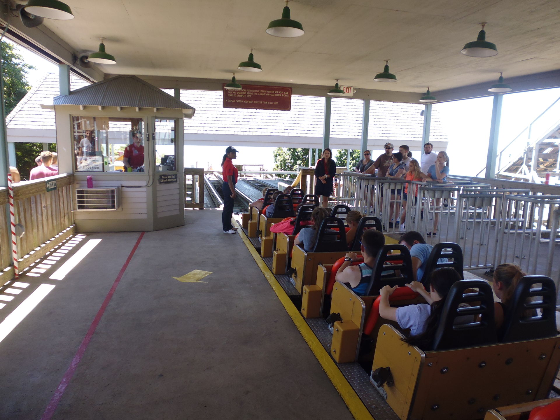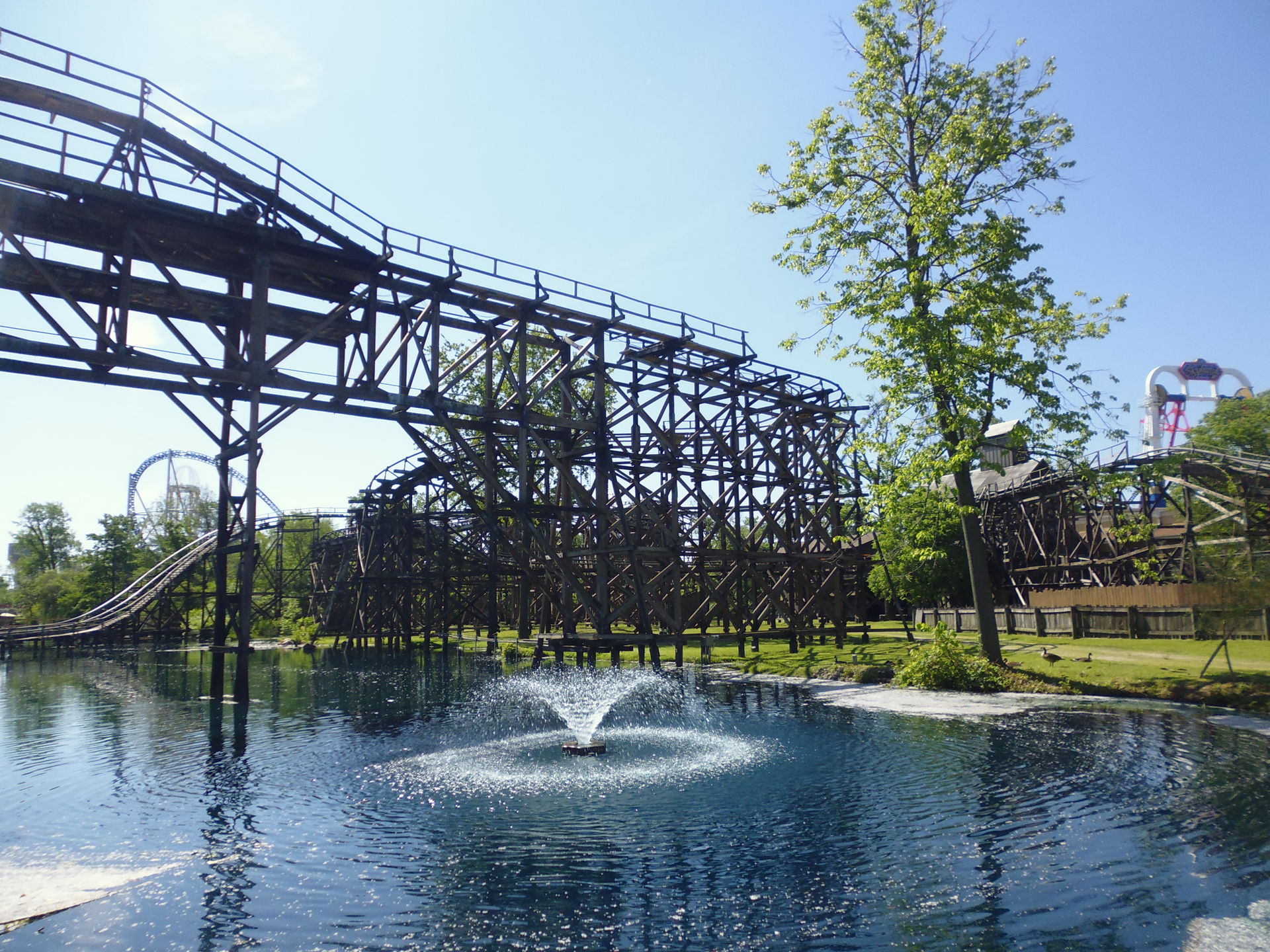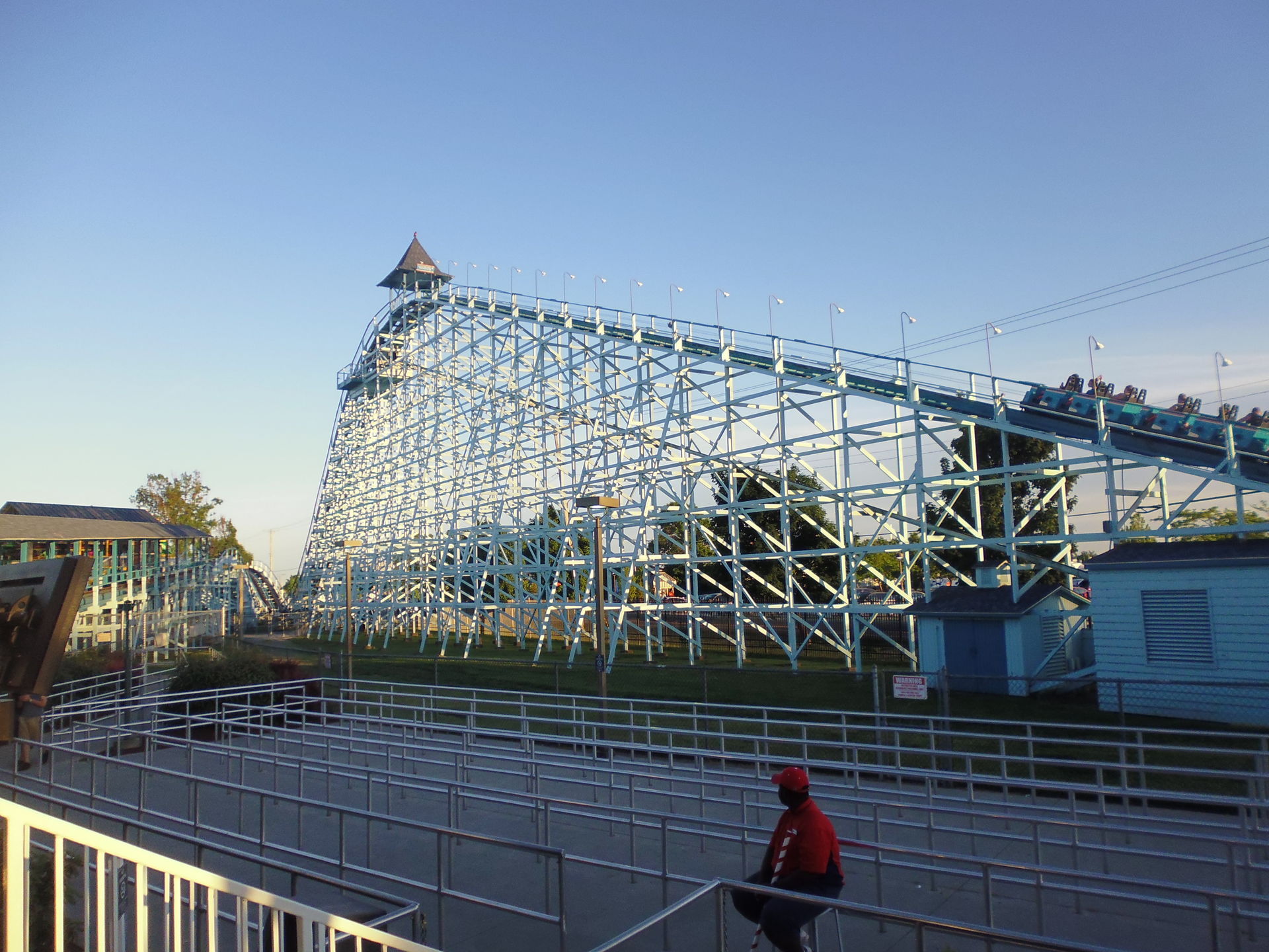 Auch beim Holz-Klassiker Blue Streak war der Wartebereich nun herrlich leer, während aber trotzdem noch beide Züge fuhren. Auch diese Bahn ist dank Valravn nun kein versteckter Geheimtipp mehr. Trotz der günstigen Umstände musste bei der ersten Fahrt gut zehn Minuten gewartet werden, weil offenbar jemand eine Kamera oder sonst einen verbotenen Gegenstand auf die Bahn geschmuggelt hat, den ein den Lifthill hochkraxelnder Mitarbeiter dann umständlich abholen gehen musste, bevor es weiterging. Parkgäste eben.