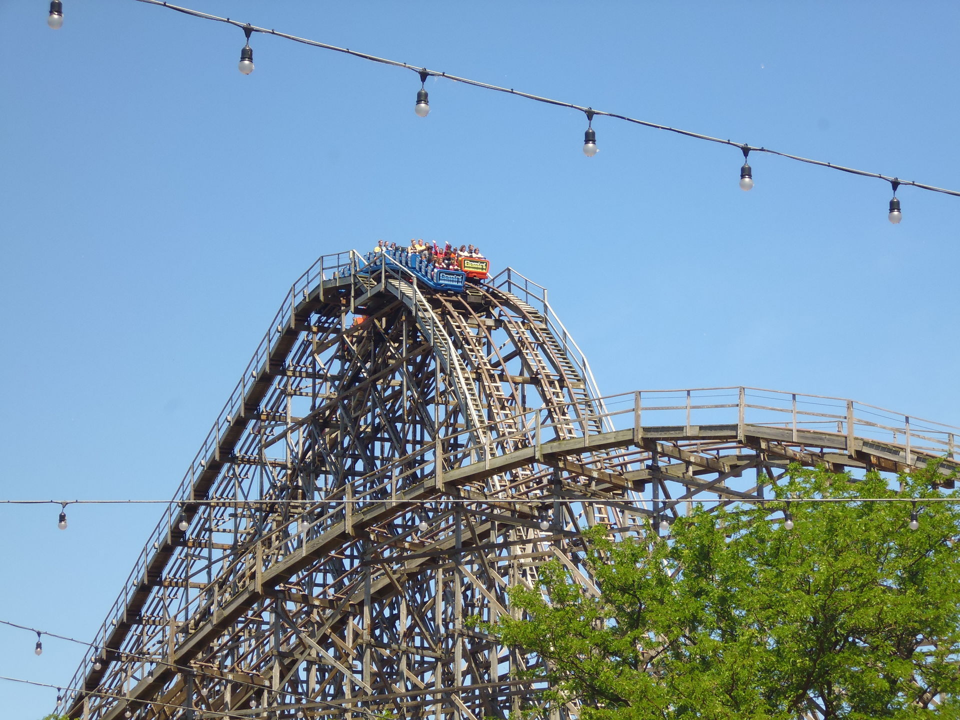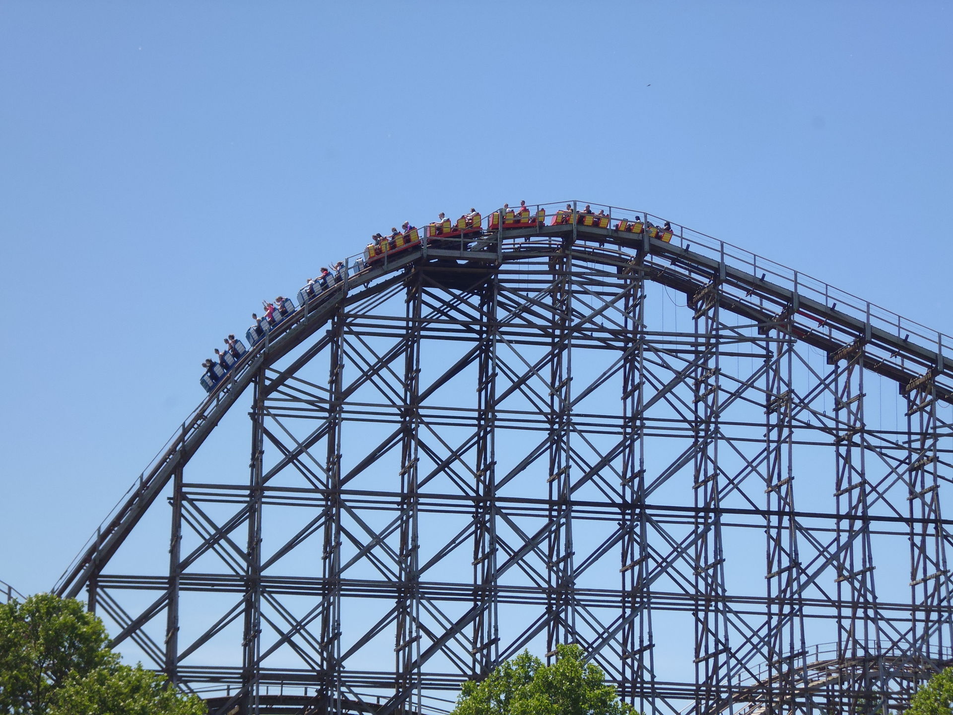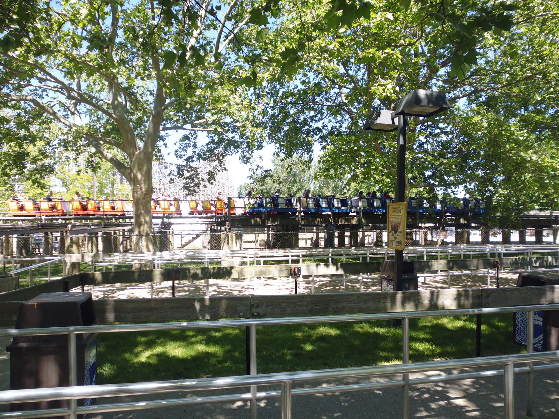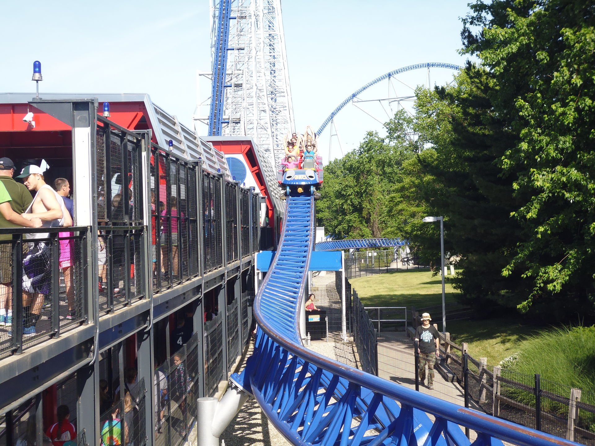 Auch beim Holz-Klassiker Blue Streak war der Wartebereich nun herrlich leer, während aber trotzdem noch beide Züge fuhren. Auch diese Bahn ist dank Valravn nun kein versteckter Geheimtipp mehr. Trotz der günstigen Umstände musste bei der ersten Fahrt gut zehn Minuten gewartet werden, weil offenbar jemand eine Kamera oder sonst einen verbotenen Gegenstand auf die Bahn geschmuggelt hat, den ein den Lifthill hochkraxelnder Mitarbeiter dann umständlich abholen gehen musste, bevor es weiterging. Parkgäste eben.