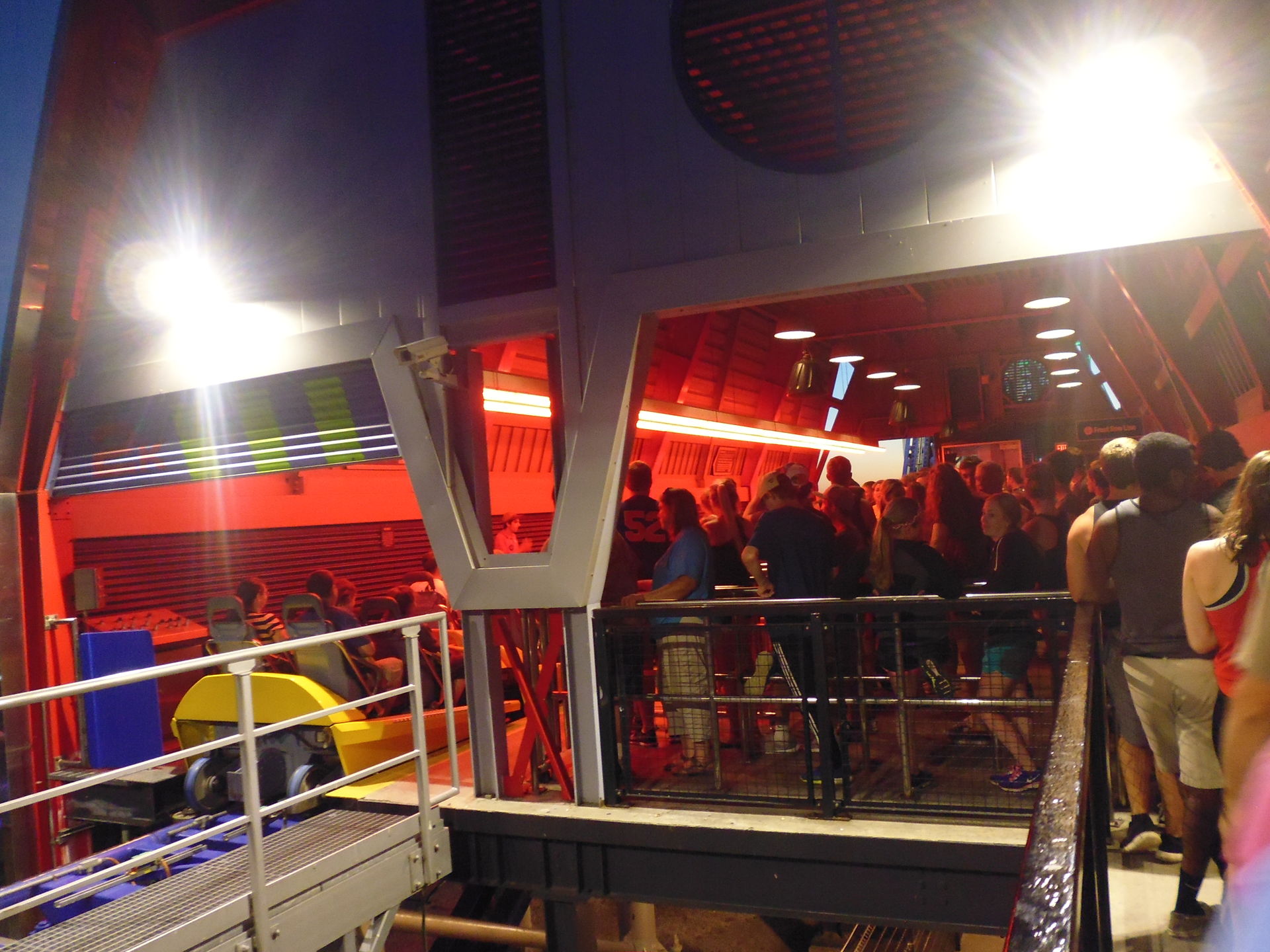 Ähnlich wie am Morgen zum Early Entry reichte die Schlange ein klein wenig über die letzte Rampe vor der Station hinaus, was etwa 15-20 Minuten Wartezeit entsprach.