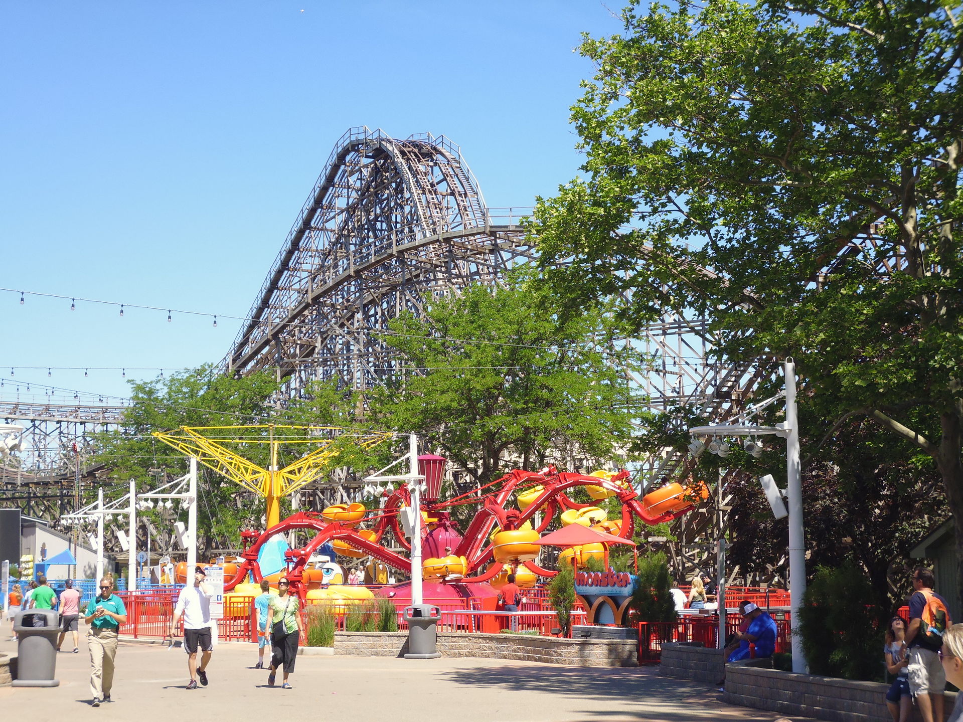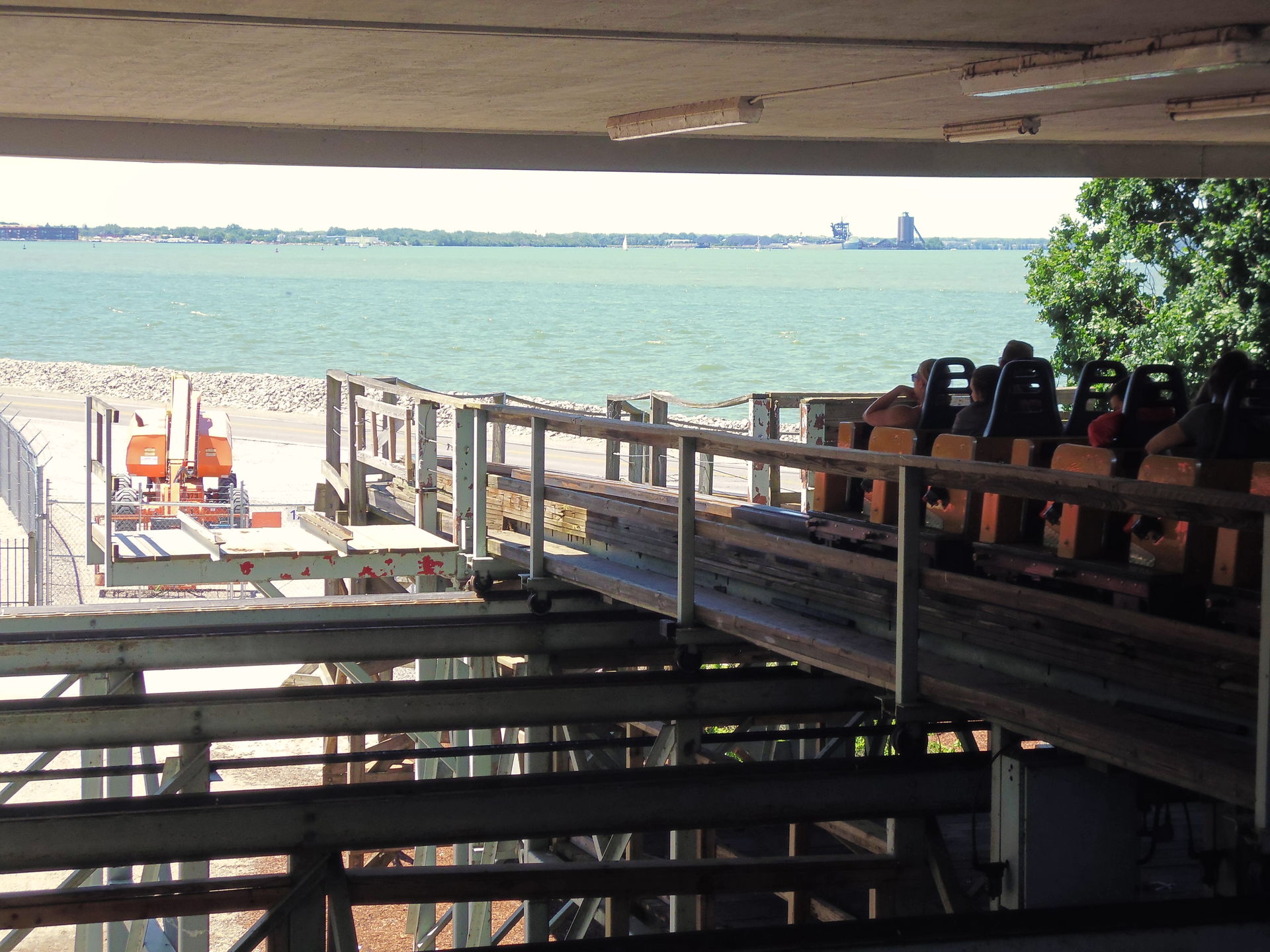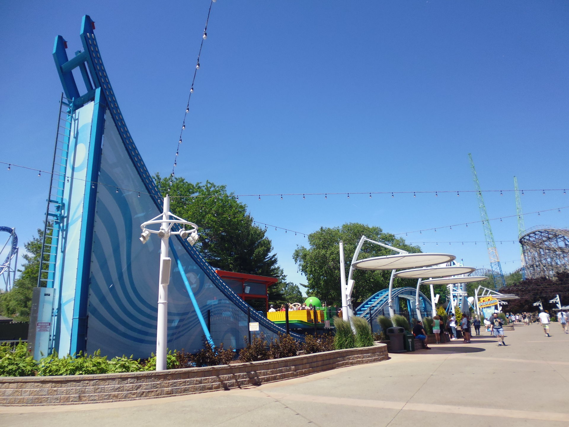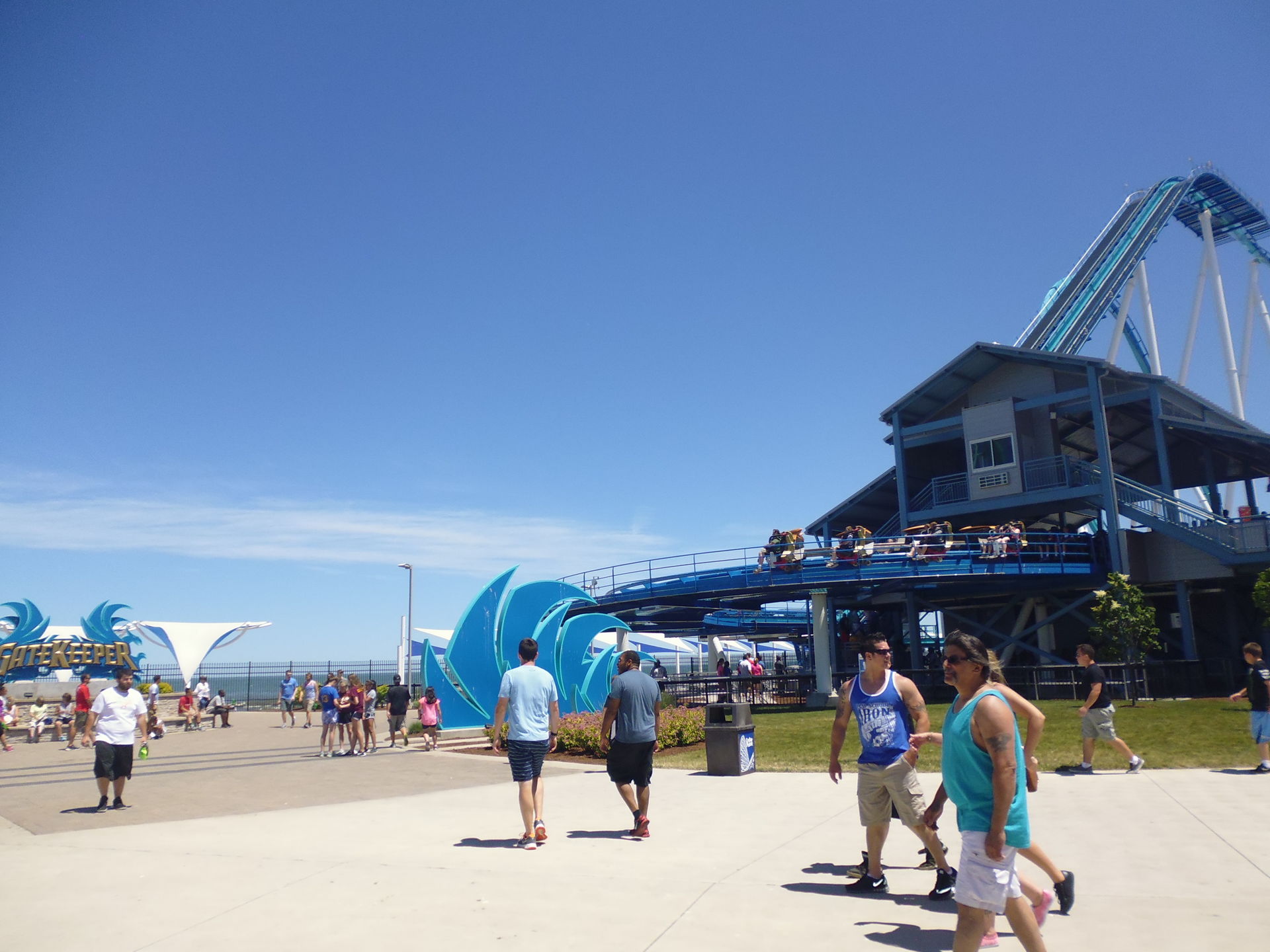 Und was für eine Fahrt er zu beiden Seiten bietet! Sind alle Passagiere korrekt festgezurrt geht es durch eine 180°-Kurve und dann den rund 50 Meter hohen Lifthill entlang der Küste rauf. Auch hier überkommt einen in der Morgensonne und so direkt am schönen Eriesee ein unbeschreibliches Glücksgefühl! Zwar steht die Bahn zur Parkseite hin reichlich schmucklos quasi im Hinterhof diverser Mainstreet-Gebäude und verläuft grossteils über eine, so nehme ich aufgrund älterer Luftbilder an, ehemalige Parkierfläche. Aber irgendwie ist es trotzdem toll, dass man diese bislang ja eher vernachlässigte Ecke zwischen Parkeingang und Strand mit einer Bahn von solchem Kaliber aufgewertet hat. Ganz zu schweigen natürlich von der hier erstmals so durchgeführten Interaktion mit dem Eingang, die eine völlige Neugestaltung desselben zur Folge hatte und mitunter ja auch in anderen Cedar-Fair-Parks zu einer wirklich ausserordentlich publikumswirksamen Anwendung kam.