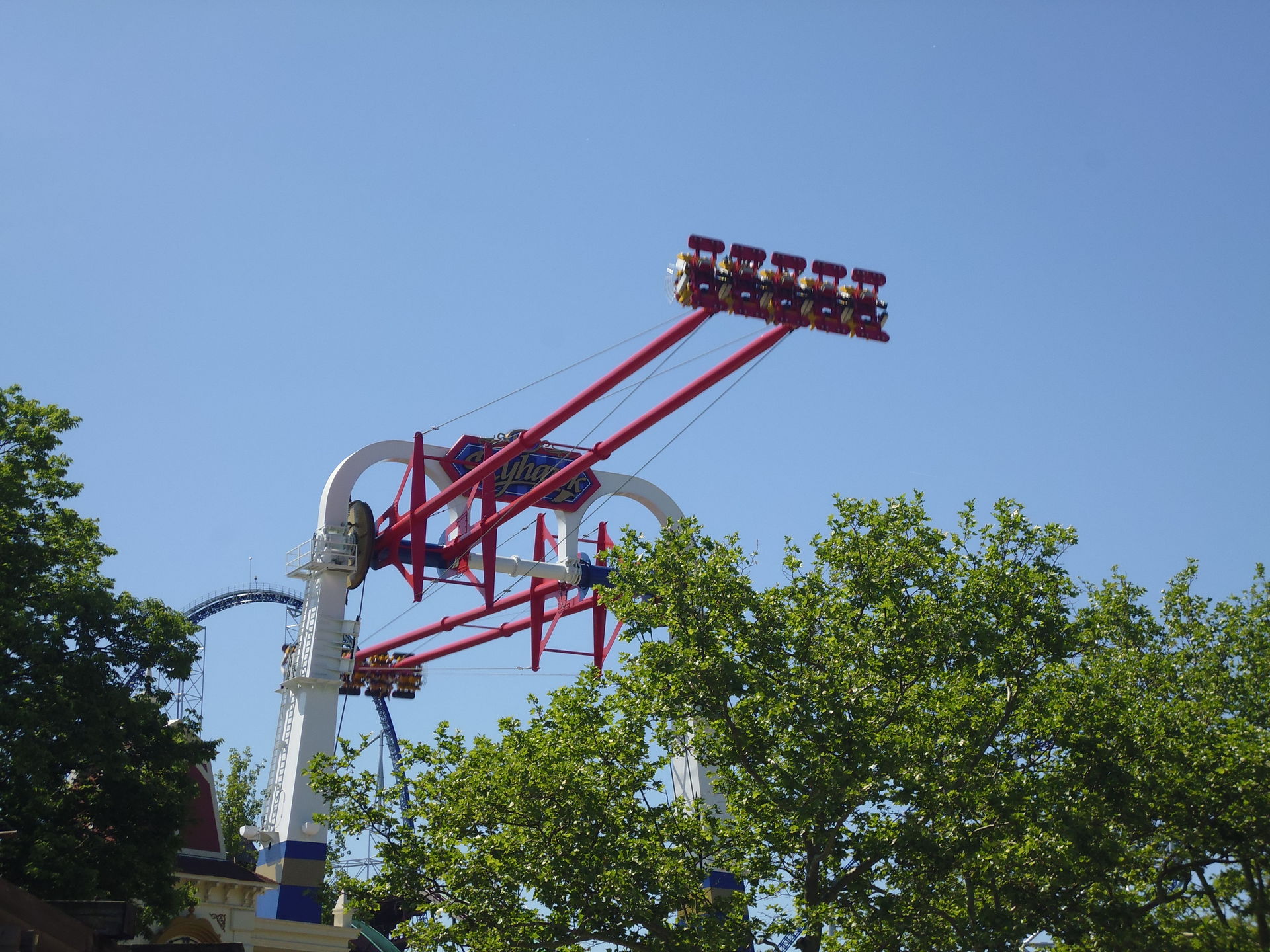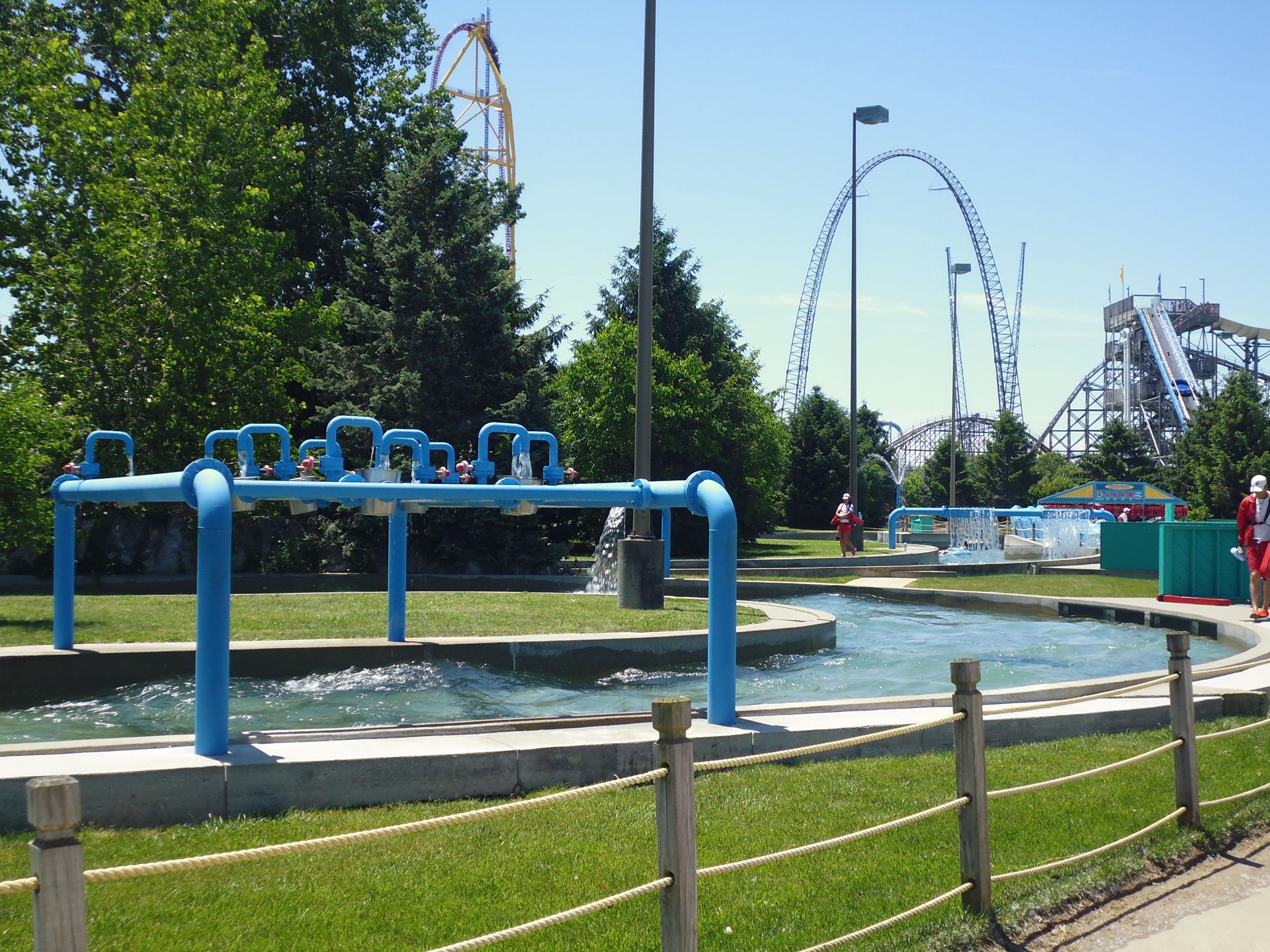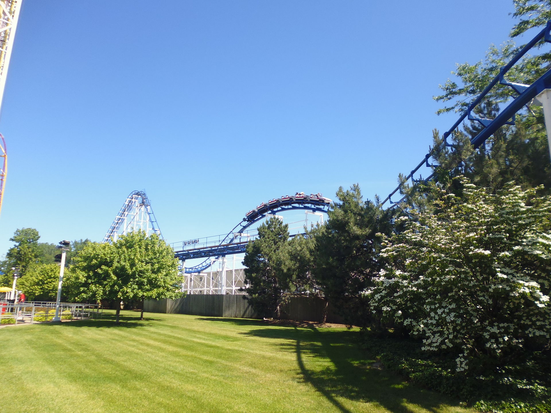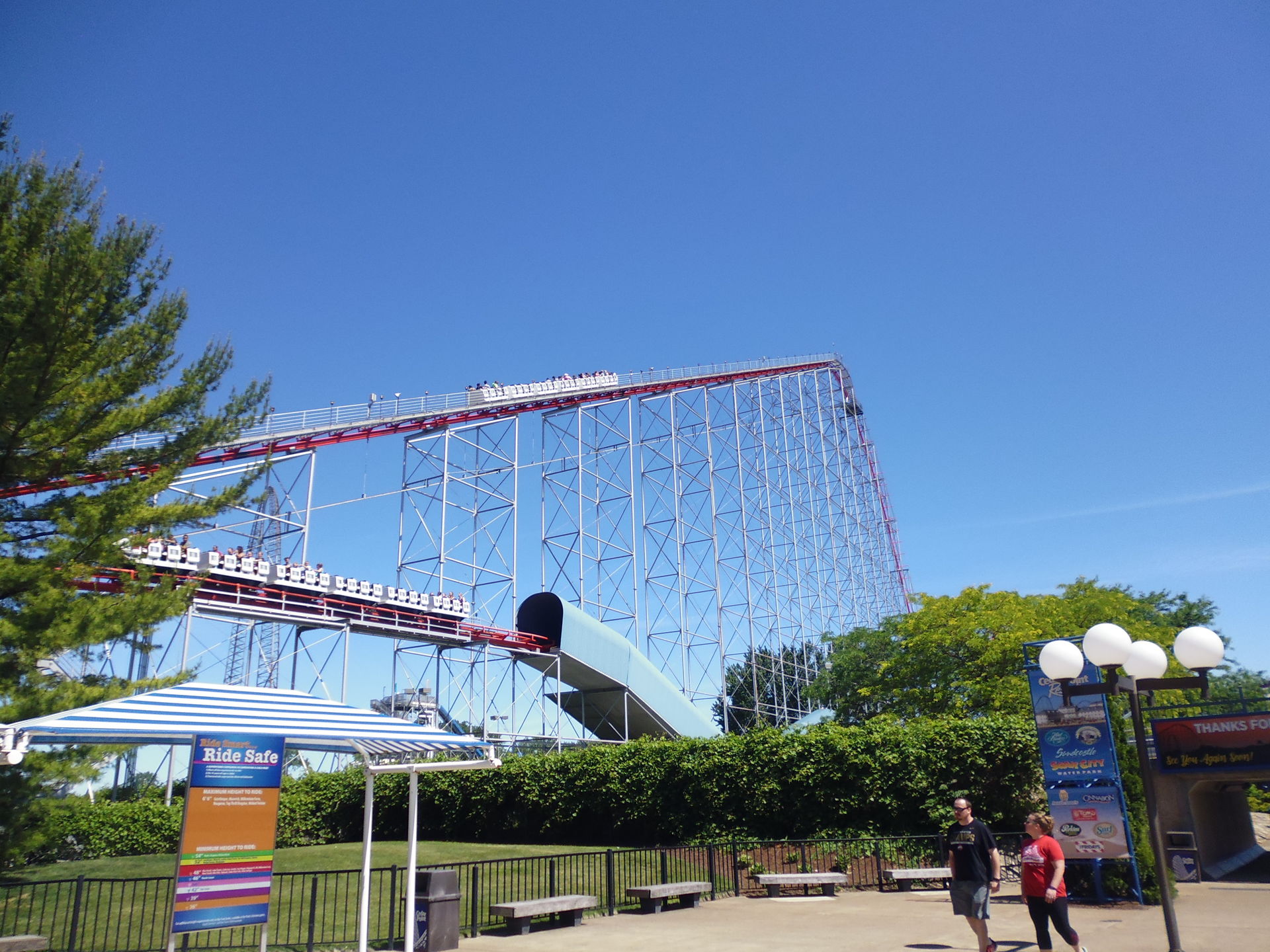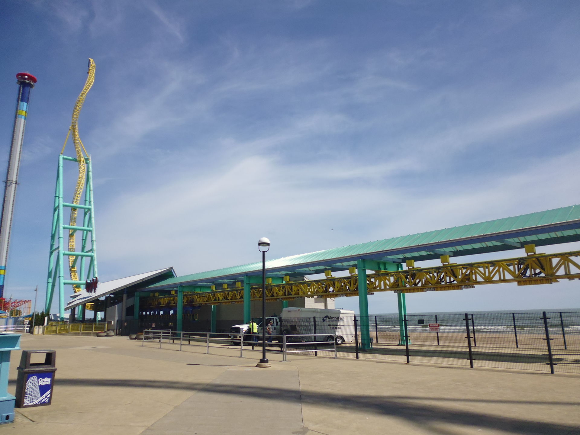 Und was für eine Fahrt er zu beiden Seiten bietet! Sind alle Passagiere korrekt festgezurrt geht es durch eine 180°-Kurve und dann den rund 50 Meter hohen Lifthill entlang der Küste rauf. Auch hier überkommt einen in der Morgensonne und so direkt am schönen Eriesee ein unbeschreibliches Glücksgefühl! Zwar steht die Bahn zur Parkseite hin reichlich schmucklos quasi im Hinterhof diverser Mainstreet-Gebäude und verläuft grossteils über eine, so nehme ich aufgrund älterer Luftbilder an, ehemalige Parkierfläche. Aber irgendwie ist es trotzdem toll, dass man diese bislang ja eher vernachlässigte Ecke zwischen Parkeingang und Strand mit einer Bahn von solchem Kaliber aufgewertet hat. Ganz zu schweigen natürlich von der hier erstmals so durchgeführten Interaktion mit dem Eingang, die eine völlige Neugestaltung desselben zur Folge hatte und mitunter ja auch in anderen Cedar-Fair-Parks zu einer wirklich ausserordentlich publikumswirksamen Anwendung kam.