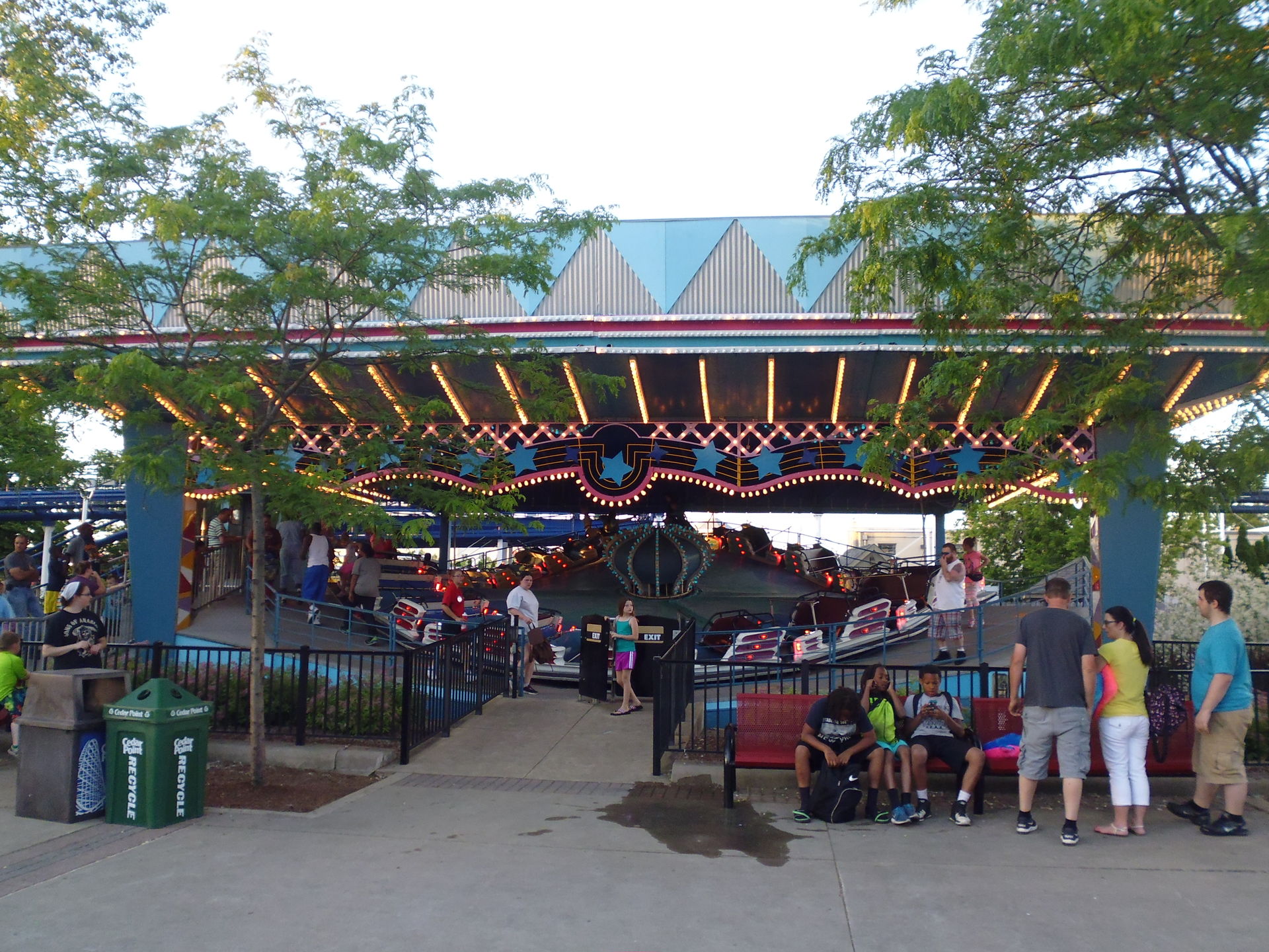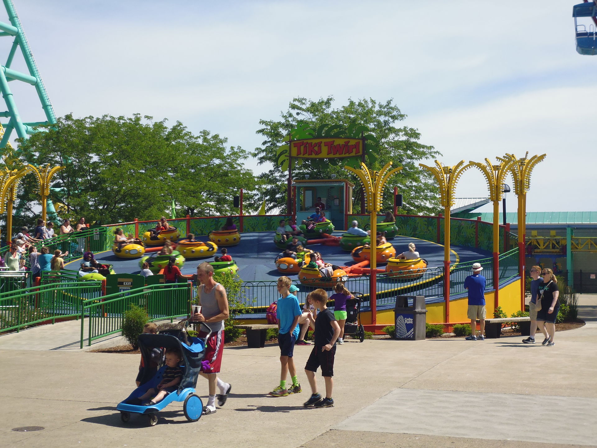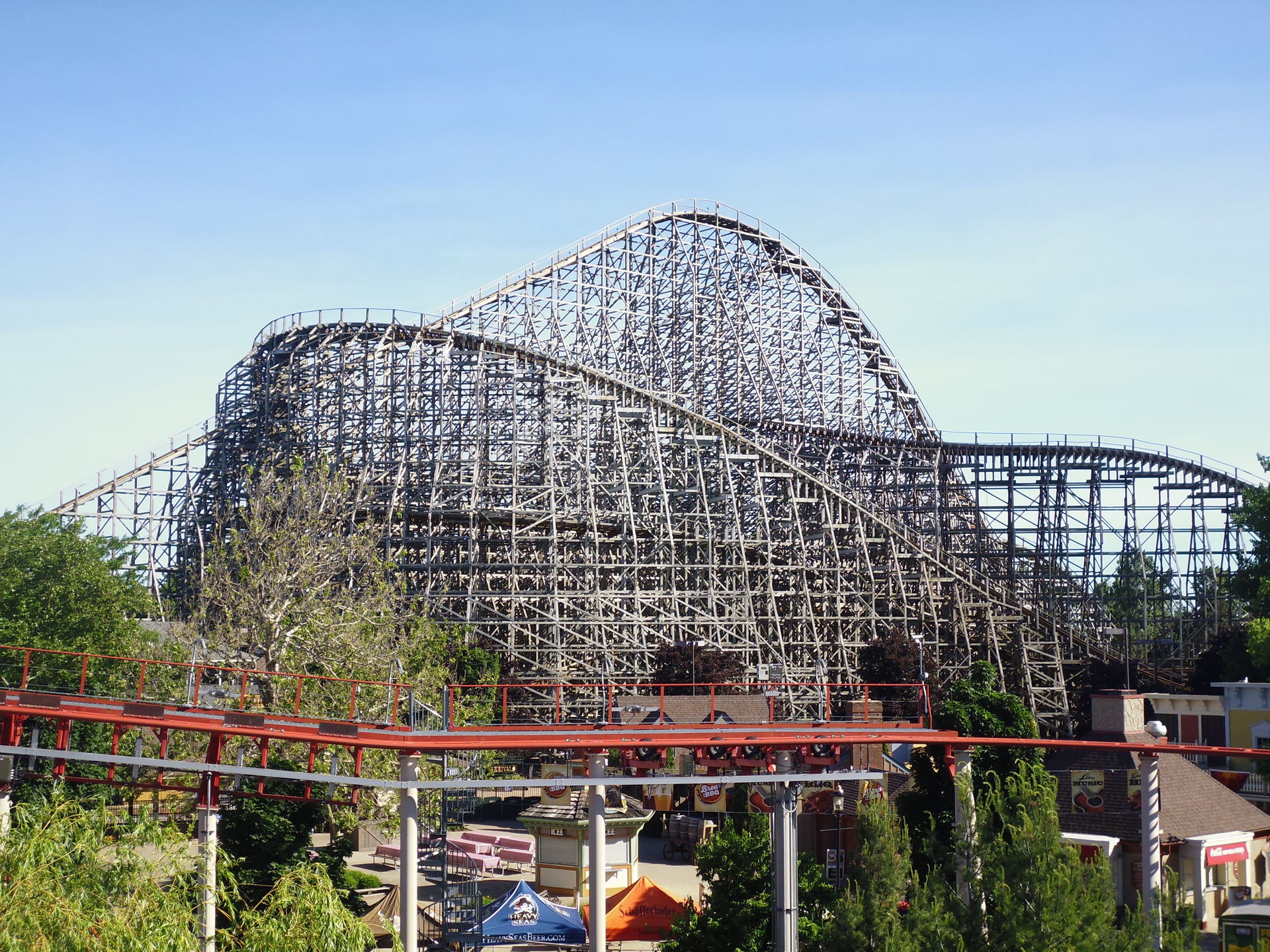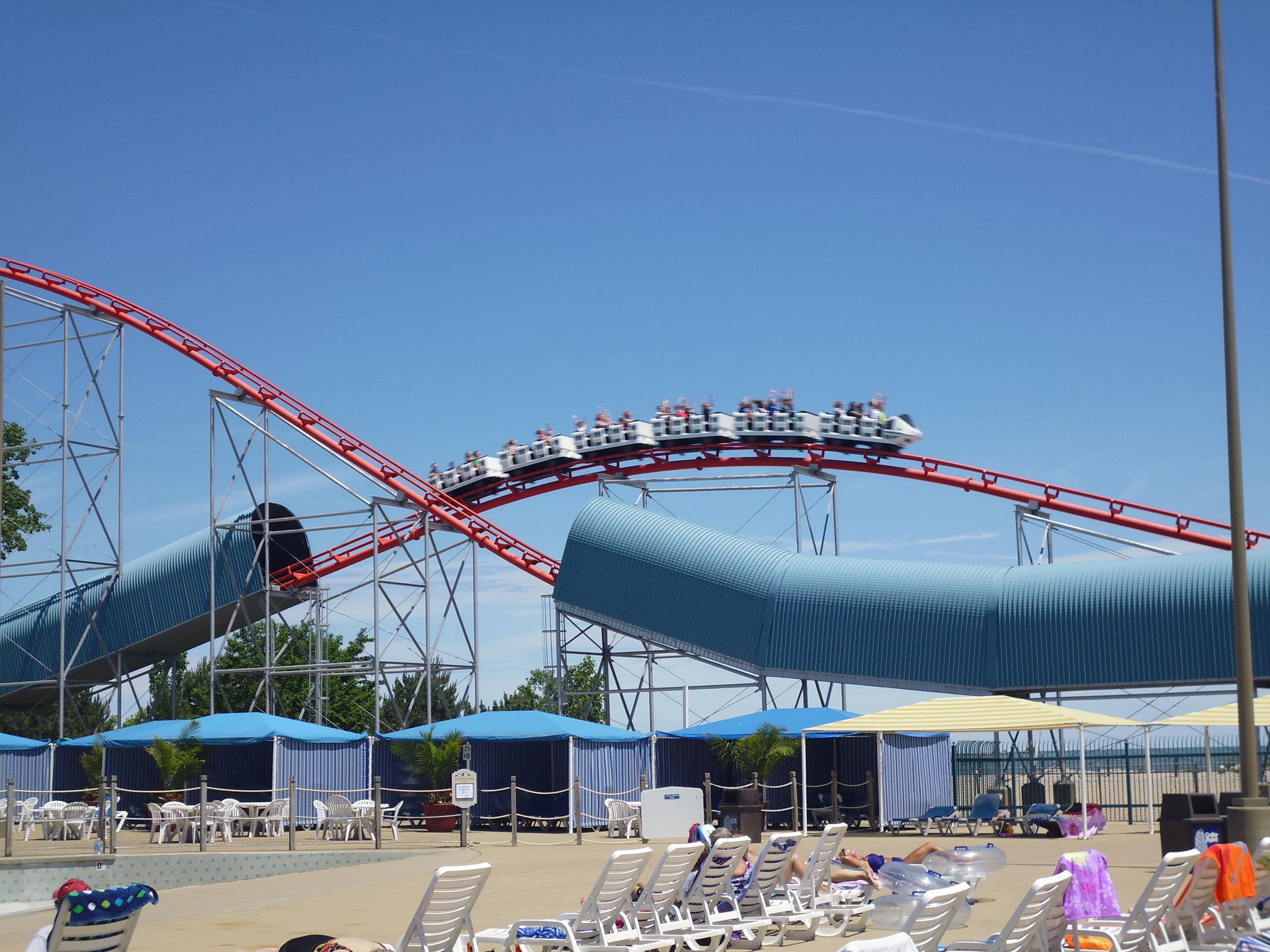 Und was für eine Fahrt er zu beiden Seiten bietet! Sind alle Passagiere korrekt festgezurrt geht es durch eine 180°-Kurve und dann den rund 50 Meter hohen Lifthill entlang der Küste rauf. Auch hier überkommt einen in der Morgensonne und so direkt am schönen Eriesee ein unbeschreibliches Glücksgefühl! Zwar steht die Bahn zur Parkseite hin reichlich schmucklos quasi im Hinterhof diverser Mainstreet-Gebäude und verläuft grossteils über eine, so nehme ich aufgrund älterer Luftbilder an, ehemalige Parkierfläche. Aber irgendwie ist es trotzdem toll, dass man diese bislang ja eher vernachlässigte Ecke zwischen Parkeingang und Strand mit einer Bahn von solchem Kaliber aufgewertet hat. Ganz zu schweigen natürlich von der hier erstmals so durchgeführten Interaktion mit dem Eingang, die eine völlige Neugestaltung desselben zur Folge hatte und mitunter ja auch in anderen Cedar-Fair-Parks zu einer wirklich ausserordentlich publikumswirksamen Anwendung kam.