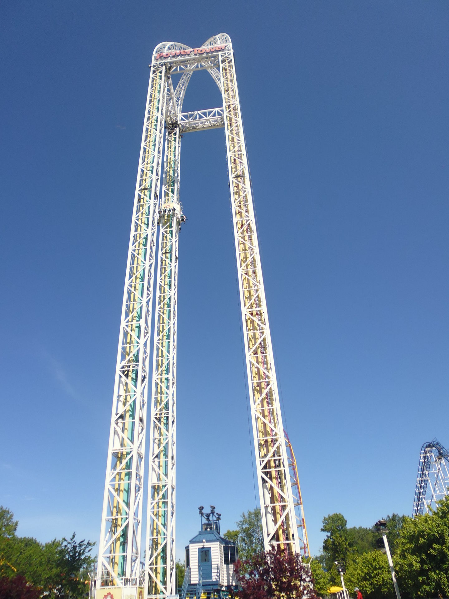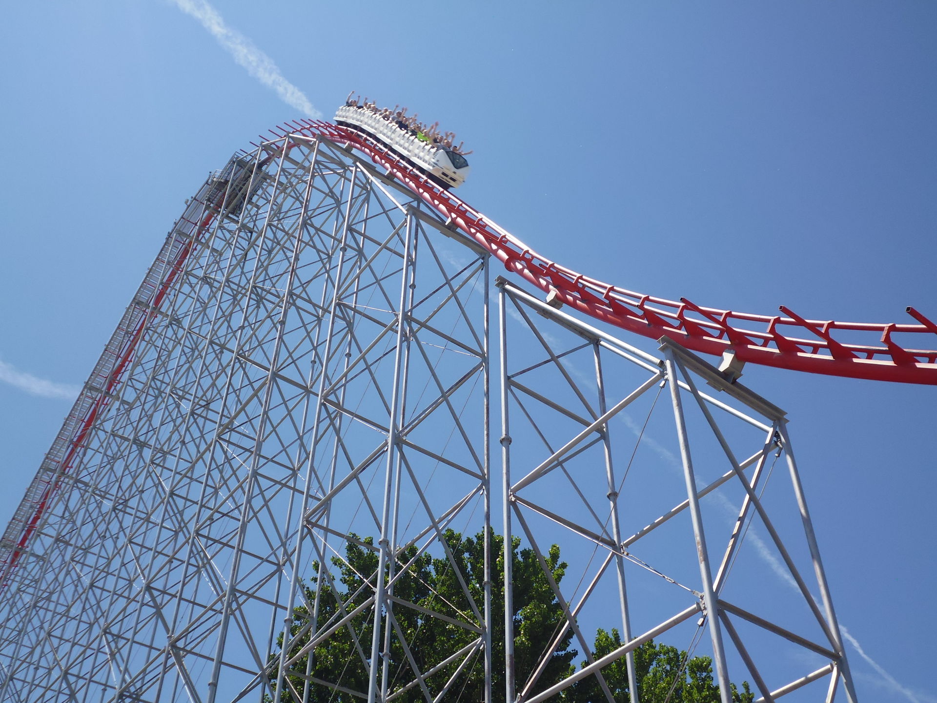 Zur diesjährigen Jungfernfahrt auf der guten Millie sass ich also präzise auf einem der Sitze, wo sich die grösste Stärke der Bahn absolut ungefiltert geniessen lässt. Nachdem alle Gurte und Bügel durchgecheckt waren hakten wir uns in den Mitnehmer ein und schon beförderte uns der schnelle Kabellift in einem 45°-Winkel auf die unwirkliche Starthöhe von 91.4 Metern. Die Aussicht auf den in der Morgensonne glitzernden Eriesee... Die laue Brise, die sich mit zunehmender Höhe bereits jetzt zu regelrechten Böenattacken wandelt... Das durch die filigrane Stützkonstruktion ausgelöste Schwindelgefühl... Die kurz vorm Erreichen des höchsten Punkts sogar noch zunehmende Liftgeschwindigkeit... Und nach Passieren des Leuchtmasts an der Spitze der viel zu rasch eingeleitete Neigevorgang, bei welchem unter nun merklich lauter werdenden Jubelschreien der 36 Passagiere schliesslich ein 80°-Winkel erreicht wird, in welchem man letztendlich in die Bügel hochgehoben und mit Tränen in den Augen in die gähnende Tiefe rast...! Ich wiederhole mich: geradezu ausserirdisch schön, dieser nach wie vor zu den weltbesten Exemplaren zählende