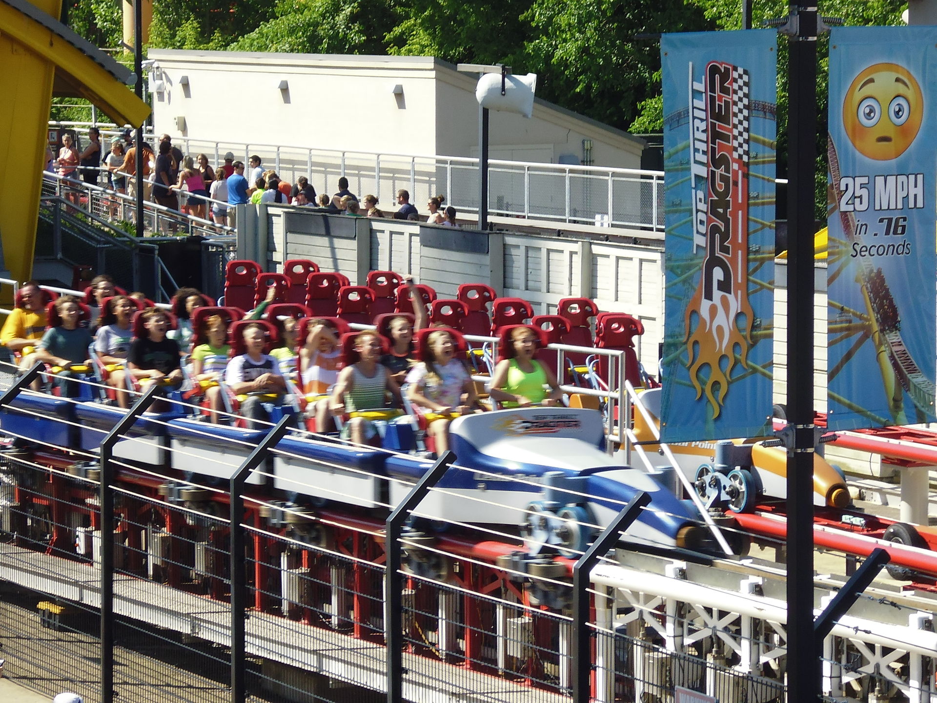 Wenig später war es dann soweit und ich konnte im zweiten Zug des Tages in der Backrow Platz nehmen! Zum Gewaltserlebnis Top Thril Dragster muss glaube ich nicht mehr viel geschrieben werden. Das langsame Nach-vorn-Rollen auf die Startstrecke, wo einen der Anblick des eben nach wie vor viel zu kurz wirkenden Launchbereichs angesichts des richtig gigantisch monströs hohen und ja auch zu überwindenden Turms dahinter so richtig das schon längst verloren geglaubte Fürchten wieder lehrt. Die Gewissheit, dass der bald folgende Katapultstart wahrhaft extreme Krafteinwirkungen nach sich ziehen wird, wenn man es tatsächlich über den 129 Meter hohen Senkrechtturm vor einem schaffen will... Unbeschreiblich, was das für ein Kribbelgefühl auslöst - auch nach all den Jahren Thrillseeking und ganz nebenbei ja auch mehreren Fahrten auf dem Ding ein unverändert nervös machender Anspannungszustand.