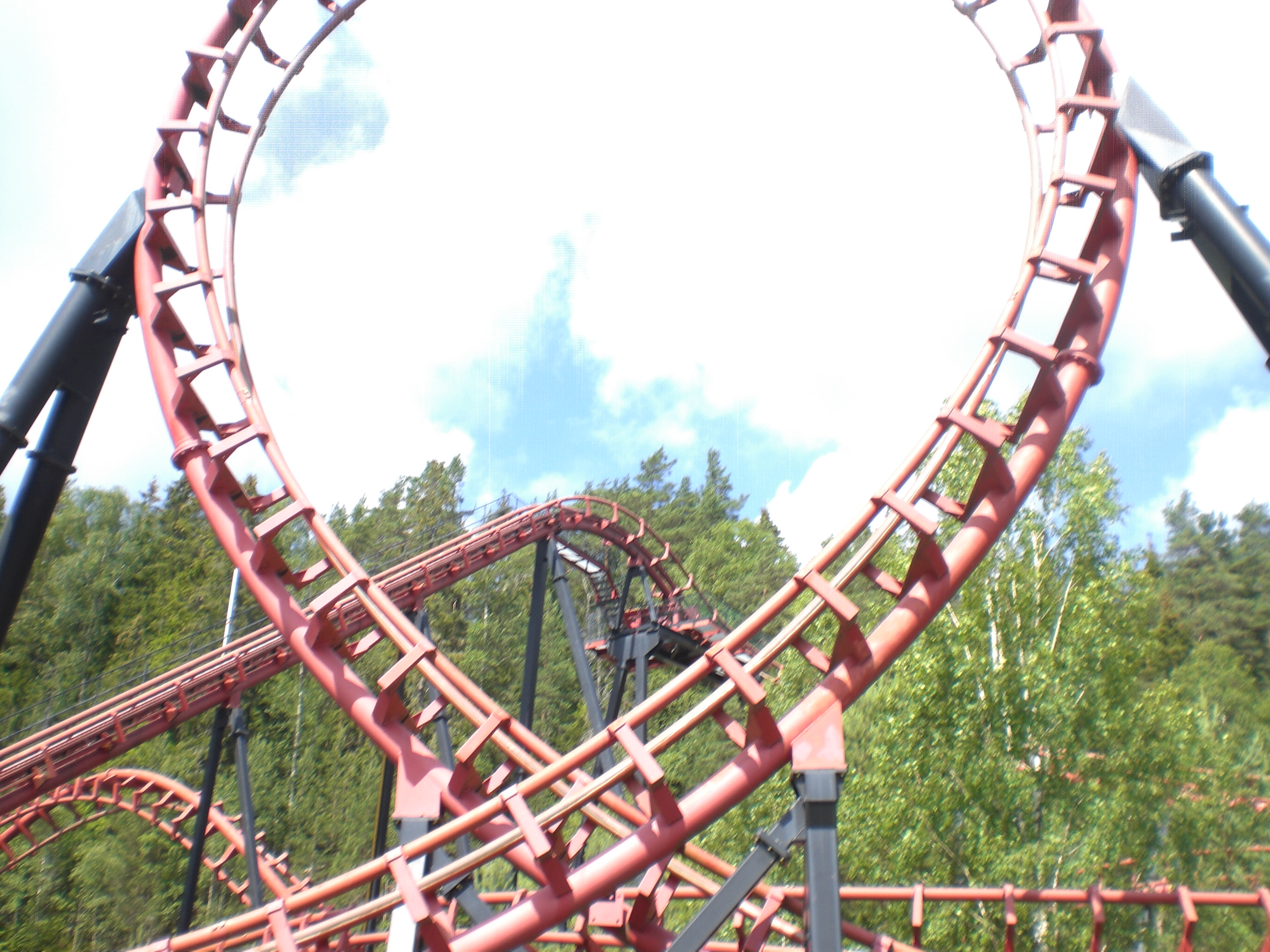 Inversion. Danach werden noch mehrere Inversionen, ein paar Kurven und ein oder zwei Airtimehügel überfahren. Auf jeden Fall war schon einmal sehr positiv, dass die Fahreigenschaften auf dem kompletten Layout sehr gut waren. Also trotz 10 Jahre Betriebs fuhr sich Speed Monster genau so sanft wie