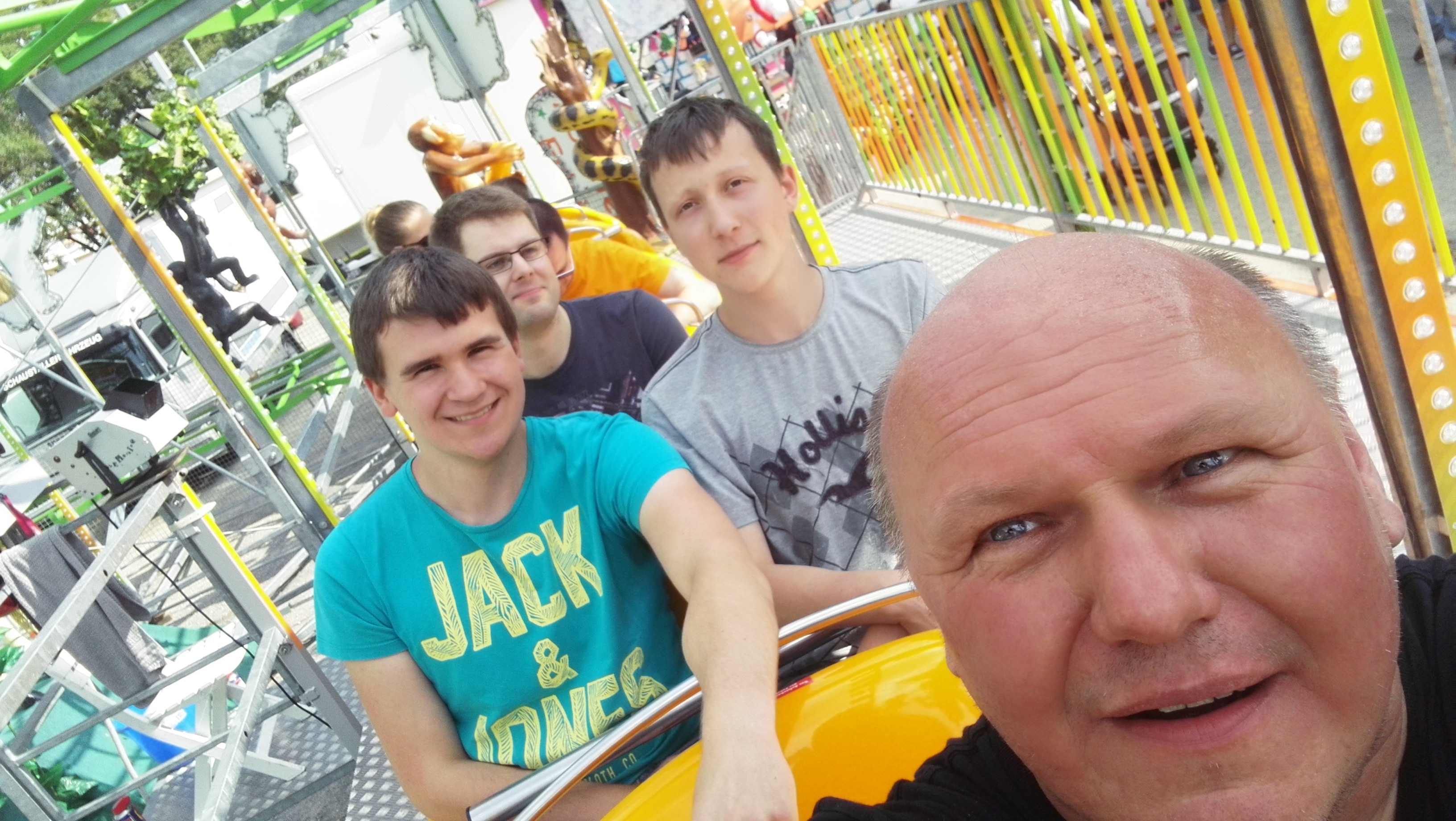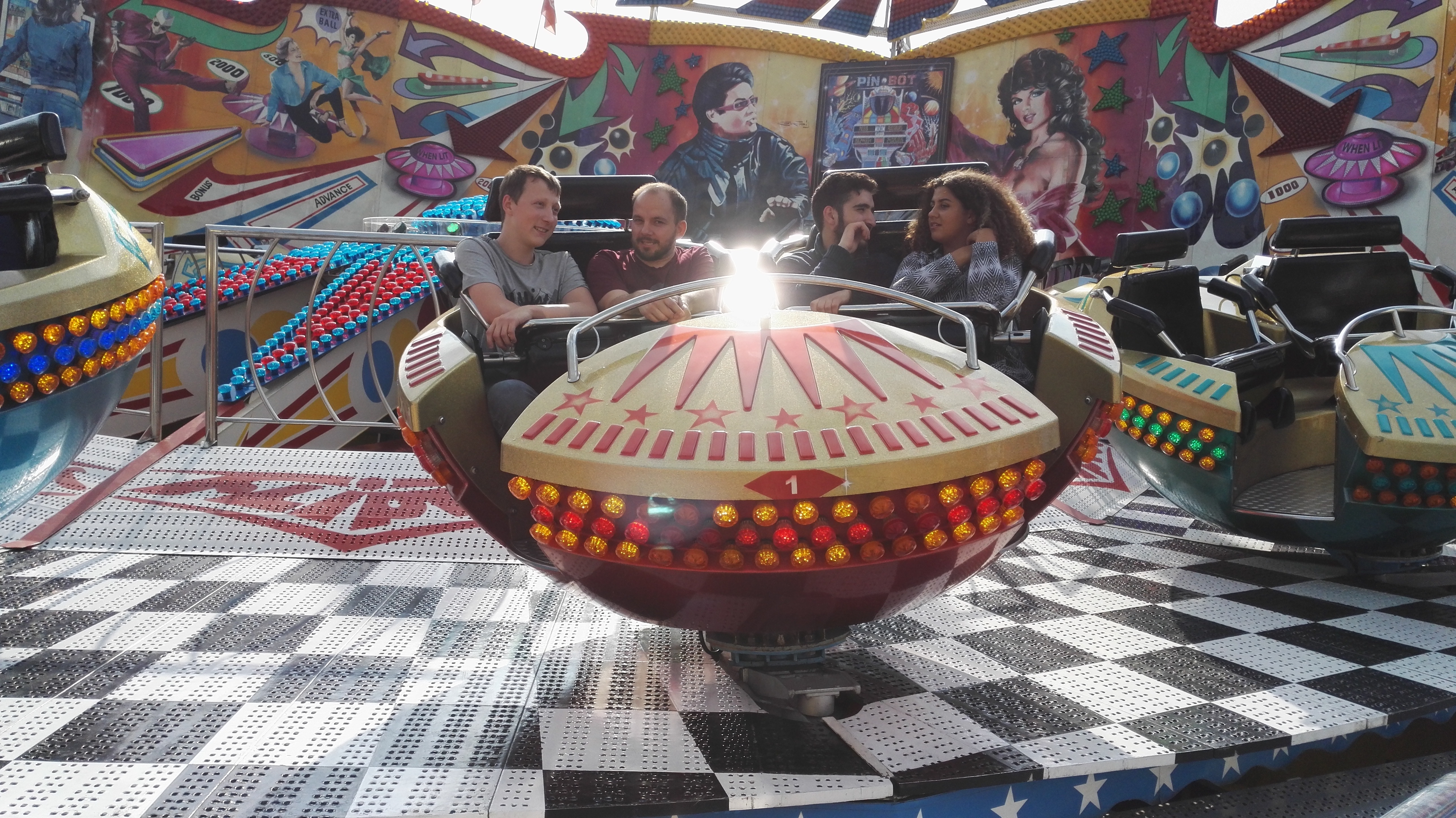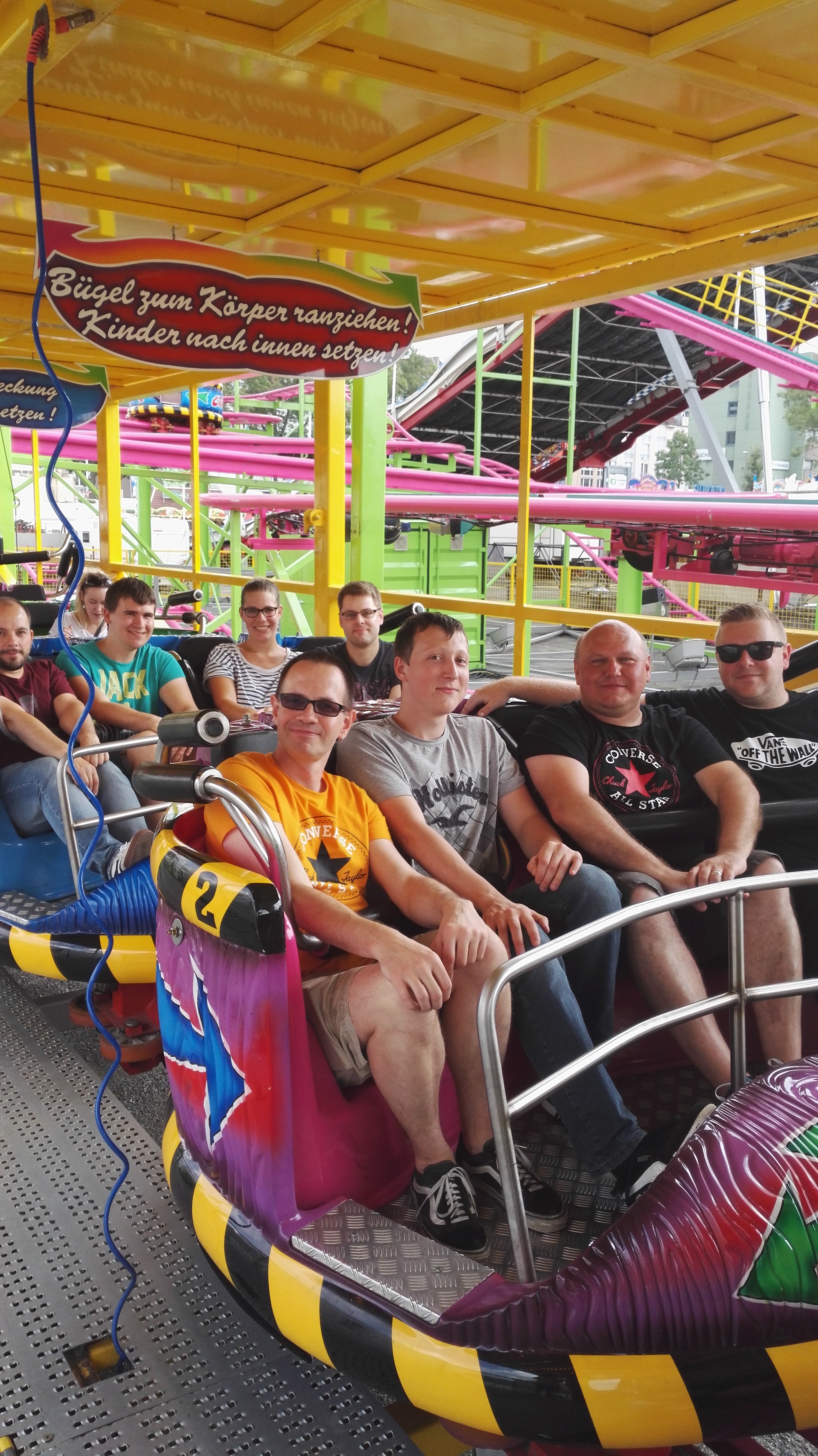 In zwei Runden schlenderte die Gruppe über den Platz und besuchte dabei den Crazy Jungle, Flipper, Crazy Mouse und Booster Maxxx. Gesellig wurden Pommes gespeist, Getränke genossen und "Neuling"-Geschichten gehört.