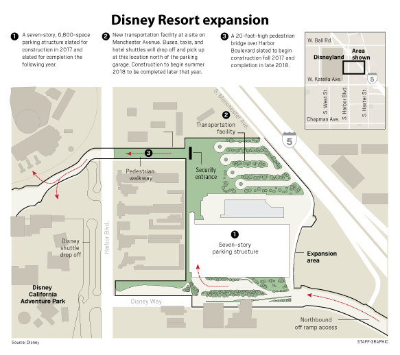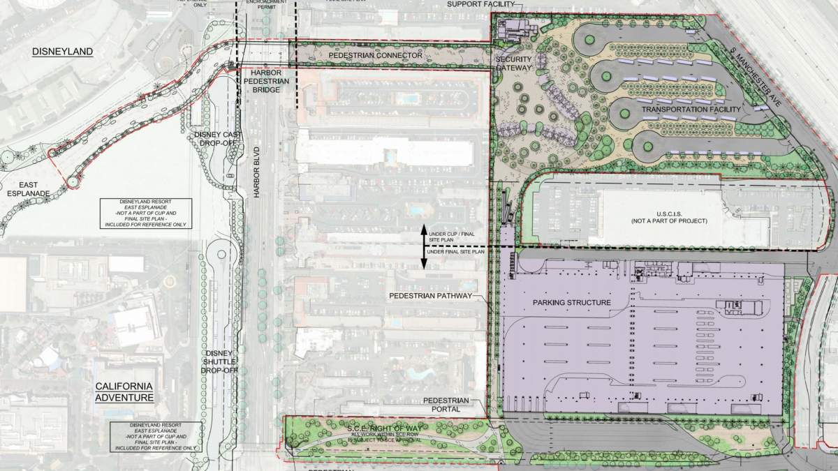 Das Parkhaus und der neue Busbahnhof werden mit einem neuen Gehweg und einer Fußgängerbrücke über den Harbor Boulevard mit den beiden Parks bzw. dem Vorplatz dazwischen verbunden. Der Verbindungsweg dazwischen soll an der Stelle entstehen, wo sich aktuell noch das "The Carousel Inn and Suites Hotel" befindet. Disney hat das Hotel samt Grundstück letztes Jahr für 32 Mio. Dollar erworben.