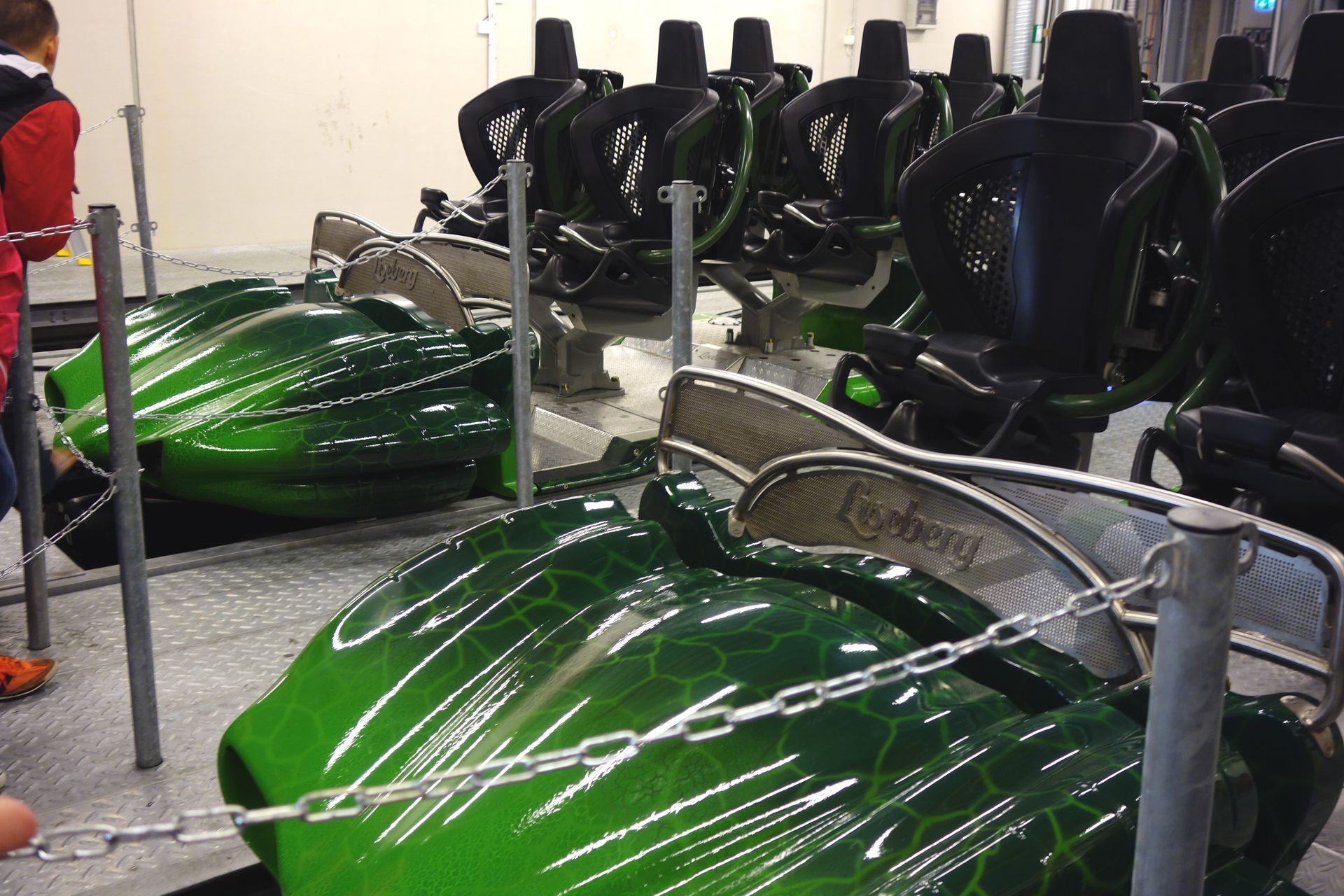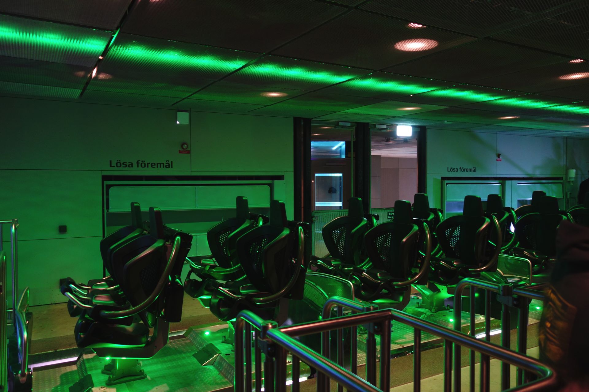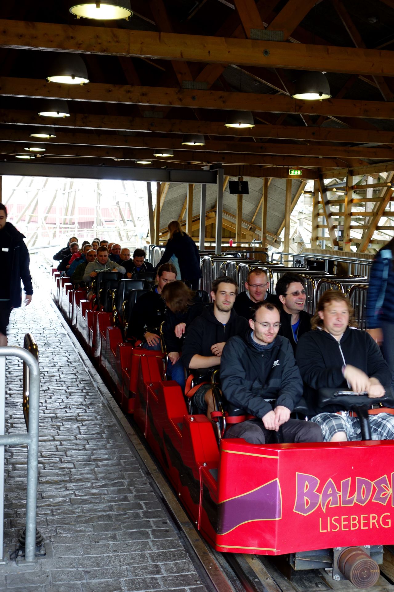 Bereits jetzt, kurz nach Parköffnung, reichte die Schlange bis über den Wartebereich hinaus auf den vorbeiführenden Weg. Wir stellten uns aber dennoch an, denn bei einer Kapazität von 2000 Personen in der Stunde sollte auch dieser Ansturm schnell abgebaut werden können. Tatsächlich war der Wartebereich gar nicht vollständig geöffnet, sodass wir schon bald im großen Stationsgebäude am Fuße des Lisebergs waren. Dort geht es vorbei am geschickt versteckten Verschiebegleis bis in den eigentlichen Bahnhof, wo wir nach etwa 20-25 Minuten bereits in einen der fünf Züge einsteigen konnten (wobei glaube ich nur 4 im Einsatz waren, bin mir da aber nicht mehr sicher). Alex und Kevin gingen direkt zur letzten Reihe, wo sie eine oder zwei Fahrten länger warten mussten, Nicolas und ich bevorzugten für unsere Premierenfahrt die erste Reihe in der Lokomotive. Abfertigungstechnisch geht es auch hier zu wie am Fließband. Einfahren, aussteigen, einsteigen, Bügel schließen (ohne Kontrolle), Abfahrt, nächster Zug. Stets begleitet von einem charakteristischen Klackern, das während der letzten Minuten im Wartebereich erheblich zum Spannungsaufbau beiträgt.