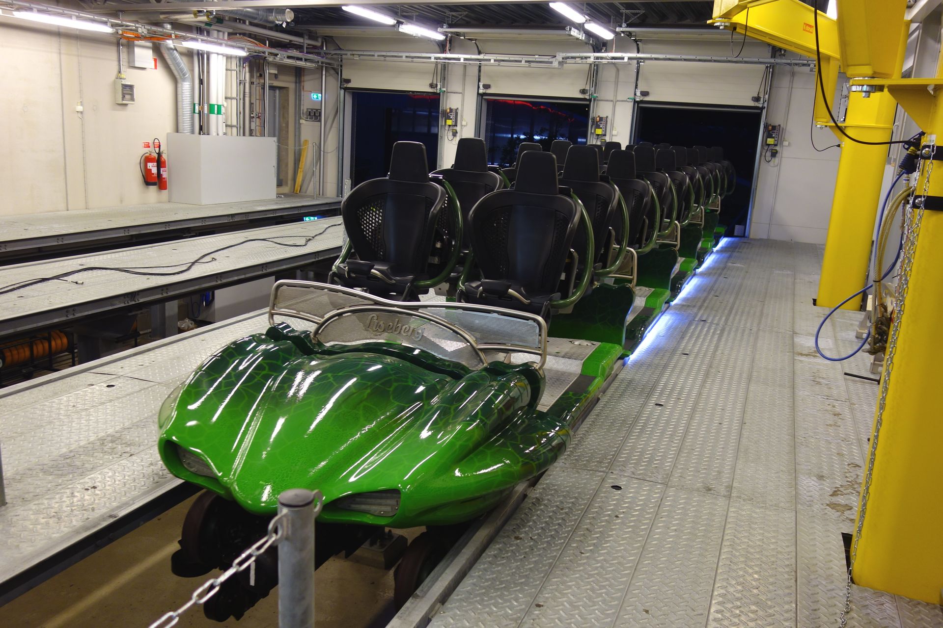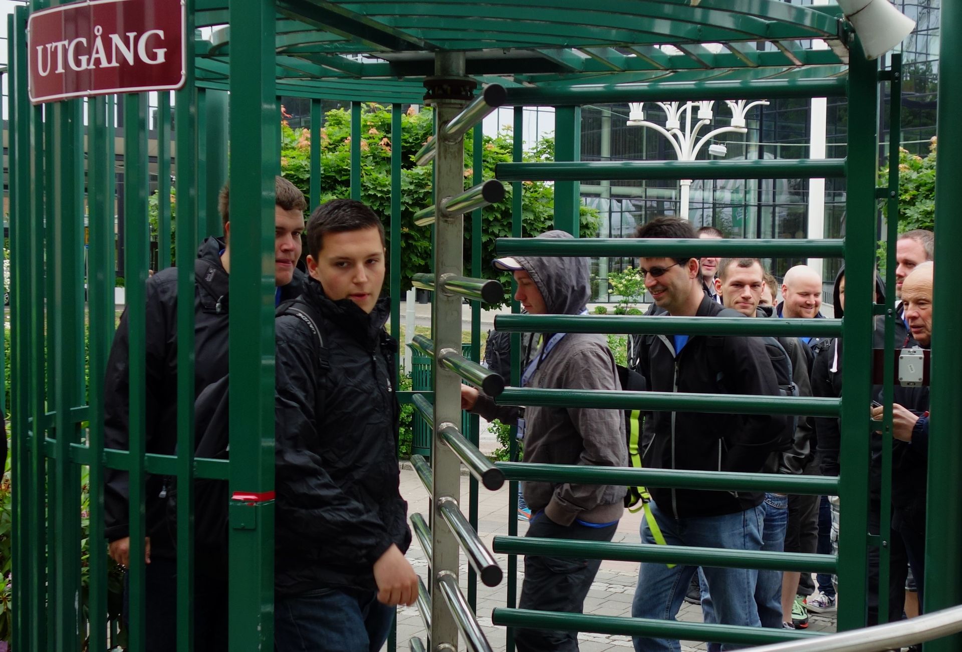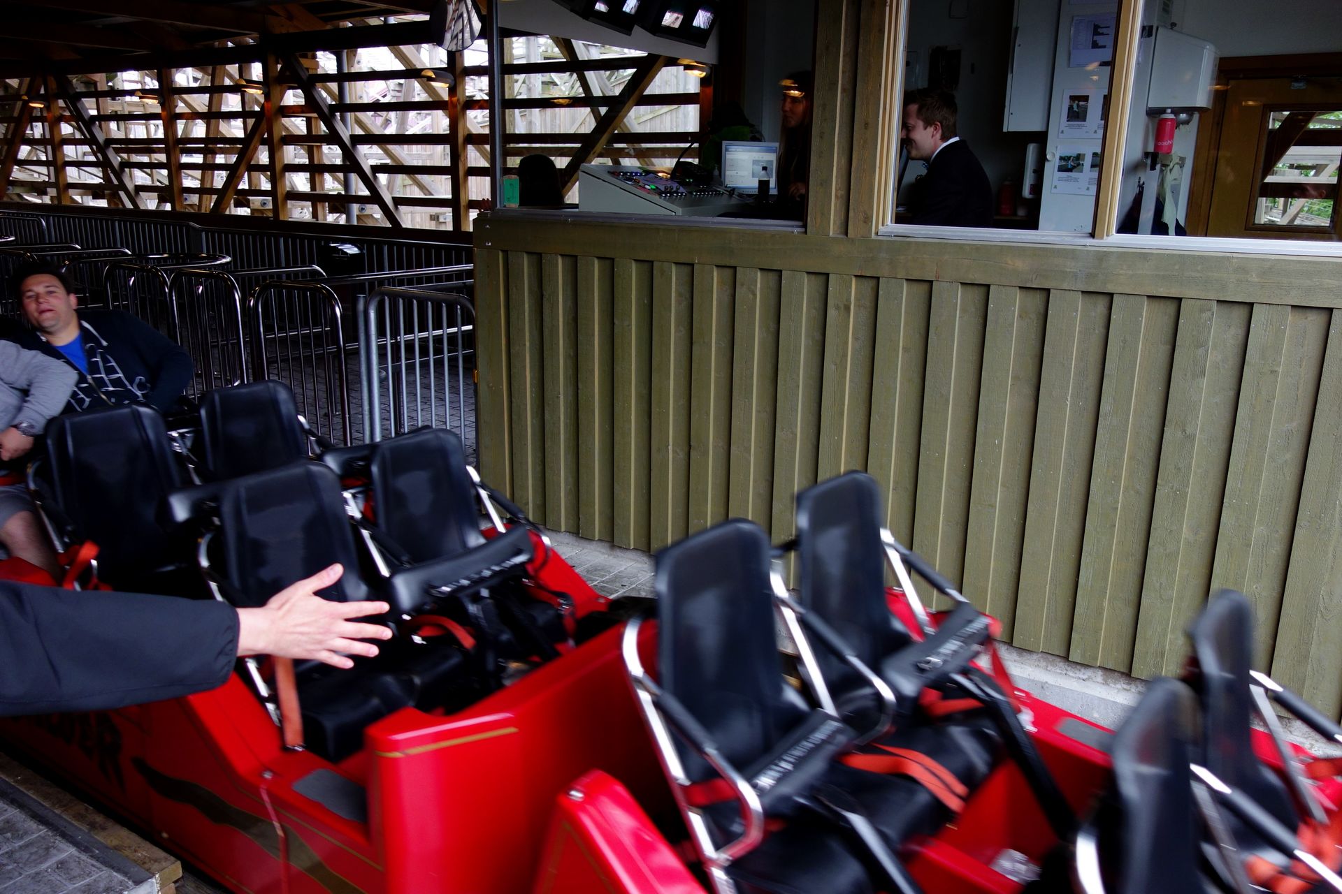 Bereits jetzt, kurz nach Parköffnung, reichte die Schlange bis über den Wartebereich hinaus auf den vorbeiführenden Weg. Wir stellten uns aber dennoch an, denn bei einer Kapazität von 2000 Personen in der Stunde sollte auch dieser Ansturm schnell abgebaut werden können. Tatsächlich war der Wartebereich gar nicht vollständig geöffnet, sodass wir schon bald im großen Stationsgebäude am Fuße des Lisebergs waren. Dort geht es vorbei am geschickt versteckten Verschiebegleis bis in den eigentlichen Bahnhof, wo wir nach etwa 20-25 Minuten bereits in einen der fünf Züge einsteigen konnten (wobei glaube ich nur 4 im Einsatz waren, bin mir da aber nicht mehr sicher). Alex und Kevin gingen direkt zur letzten Reihe, wo sie eine oder zwei Fahrten länger warten mussten, Nicolas und ich bevorzugten für unsere Premierenfahrt die erste Reihe in der Lokomotive. Abfertigungstechnisch geht es auch hier zu wie am Fließband. Einfahren, aussteigen, einsteigen, Bügel schließen (ohne Kontrolle), Abfahrt, nächster Zug. Stets begleitet von einem charakteristischen Klackern, das während der letzten Minuten im Wartebereich erheblich zum Spannungsaufbau beiträgt.