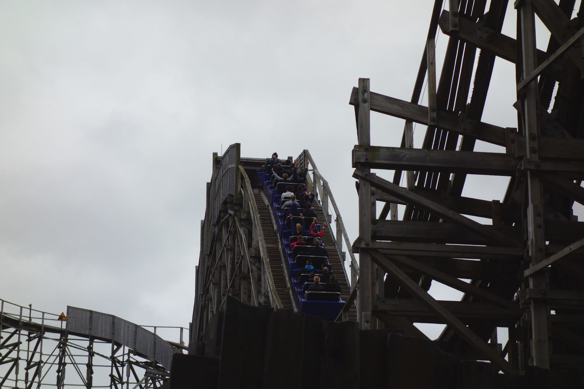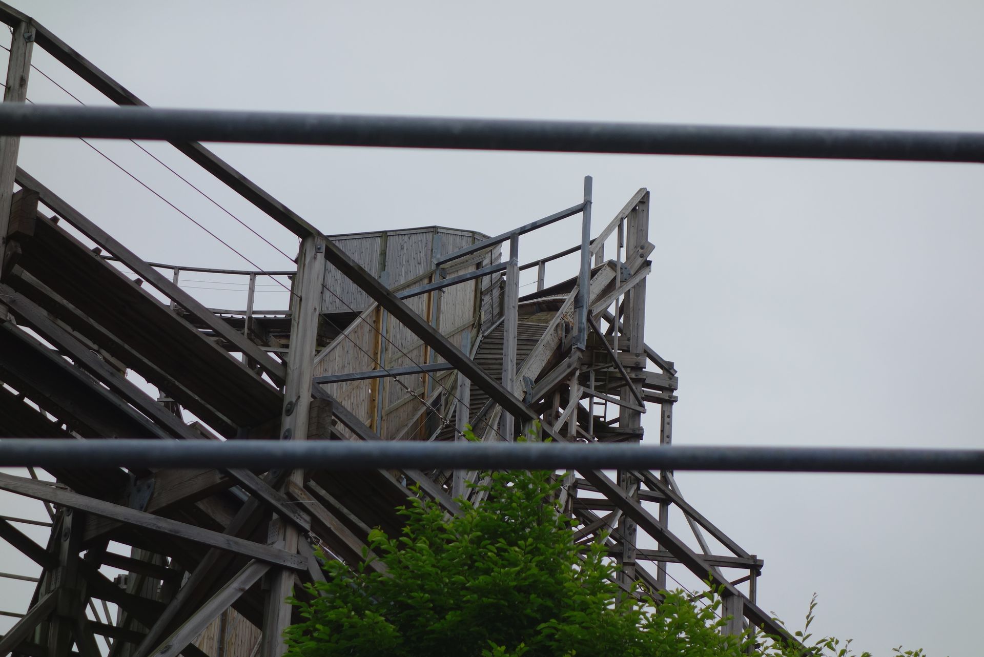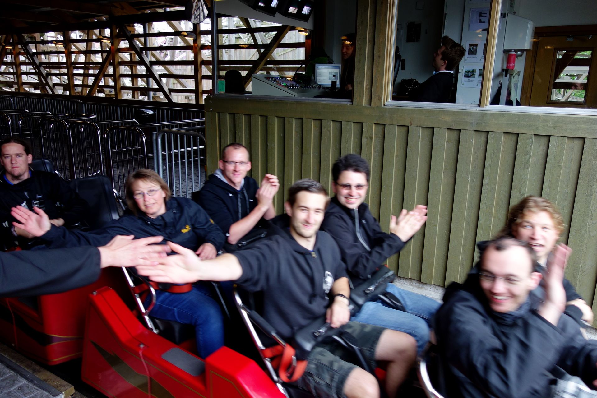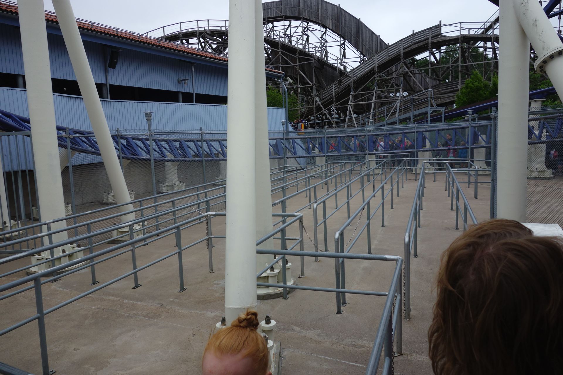 Die ERT dauerte wie gesagt eine knappe Stunde, wobei das kühle Wetter tatsächlich anstrengender war als die Bahn an sich. Nach den beiden ersten Tourtagen waren wir alle doch irgendwie auf höhere Temperaturen eingestellt. Dennoch war es ein super Tageseinstieg, den einige von uns eigentlich direkt auf dem benachbarten Mini-Launcher Kanonen fortsetzen wollten. Doch nach den beobachteten Testfahrten hatte man wohl Probleme festgestellt und eine zeitnahe Öffnung verschoben. Unsere kampferprobte Truppe wanderte stattdessen also zunächst zur ältesten Achterbahn des Parks, wo wir erstmals Bekanntschaft mit dem normalen Publikum schlossen...