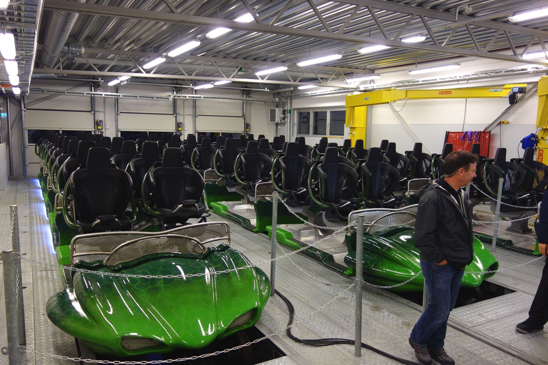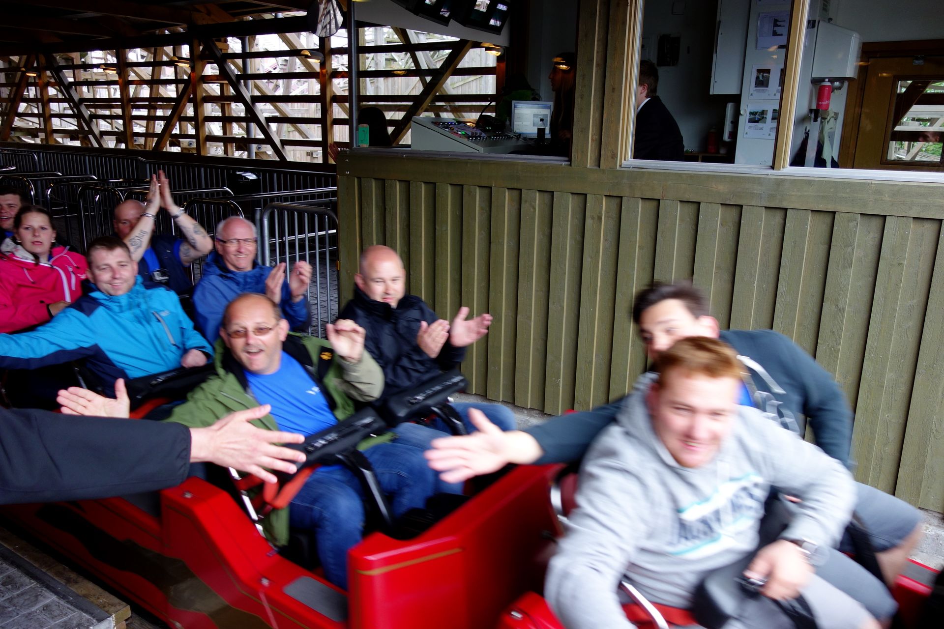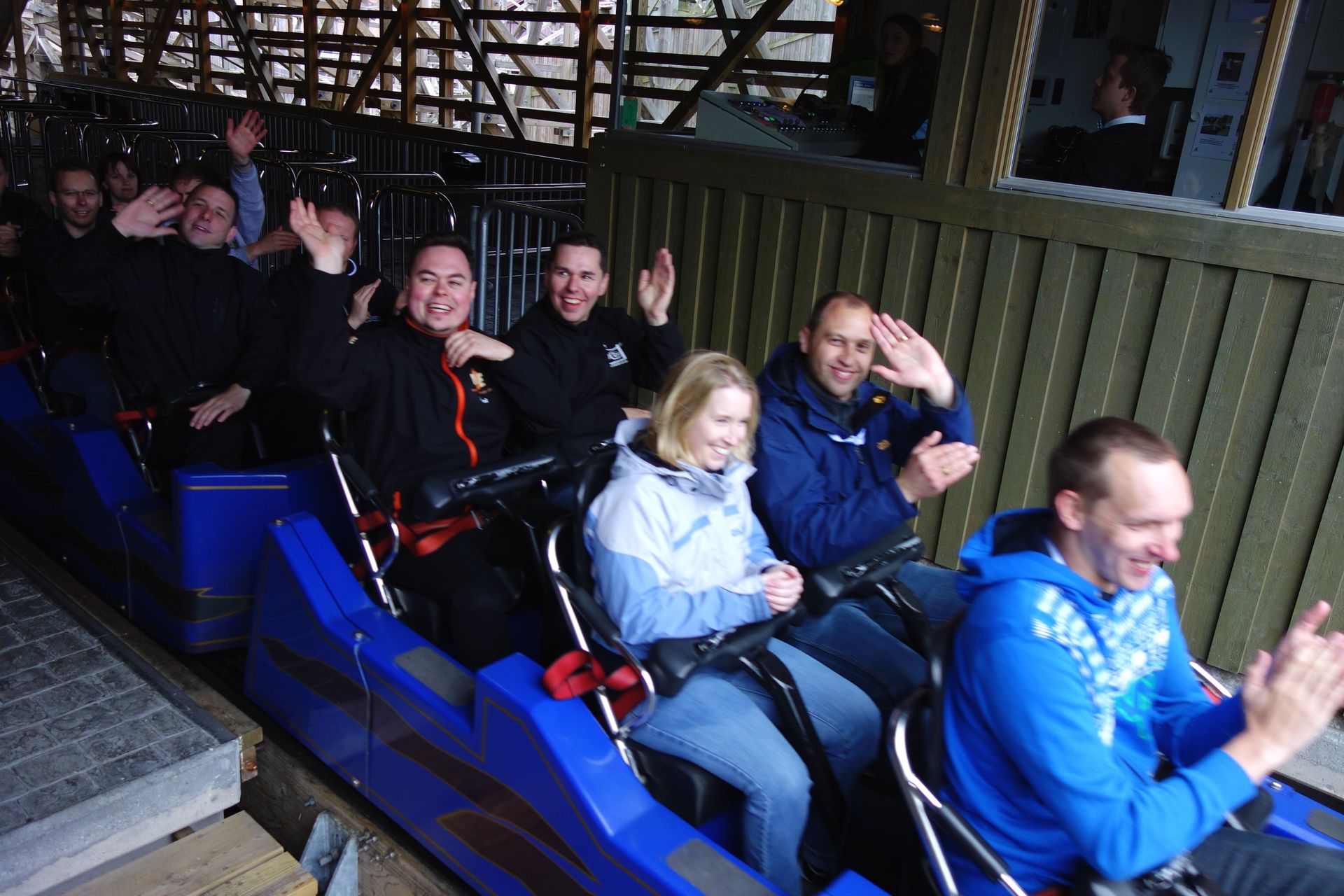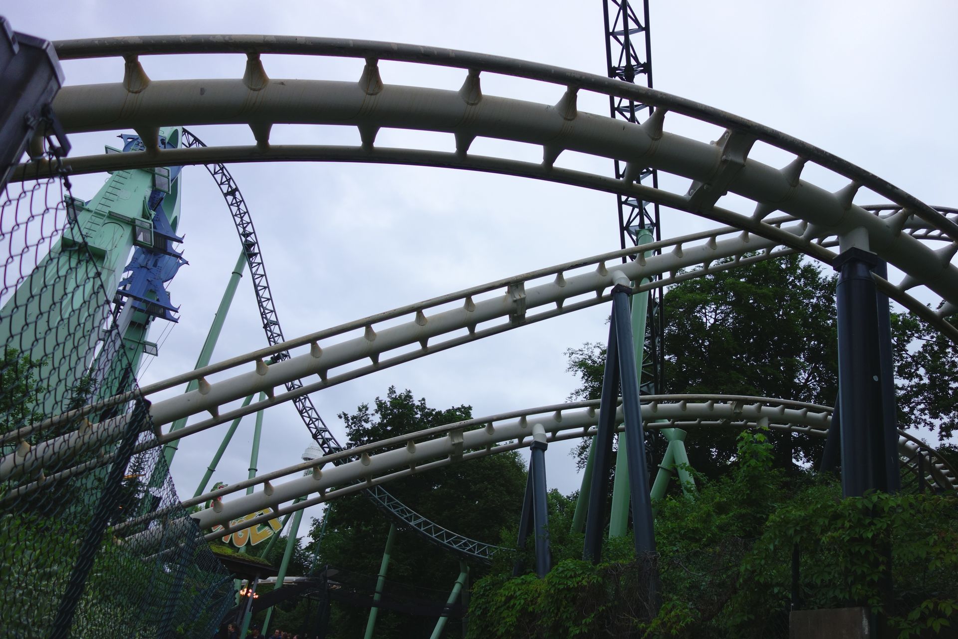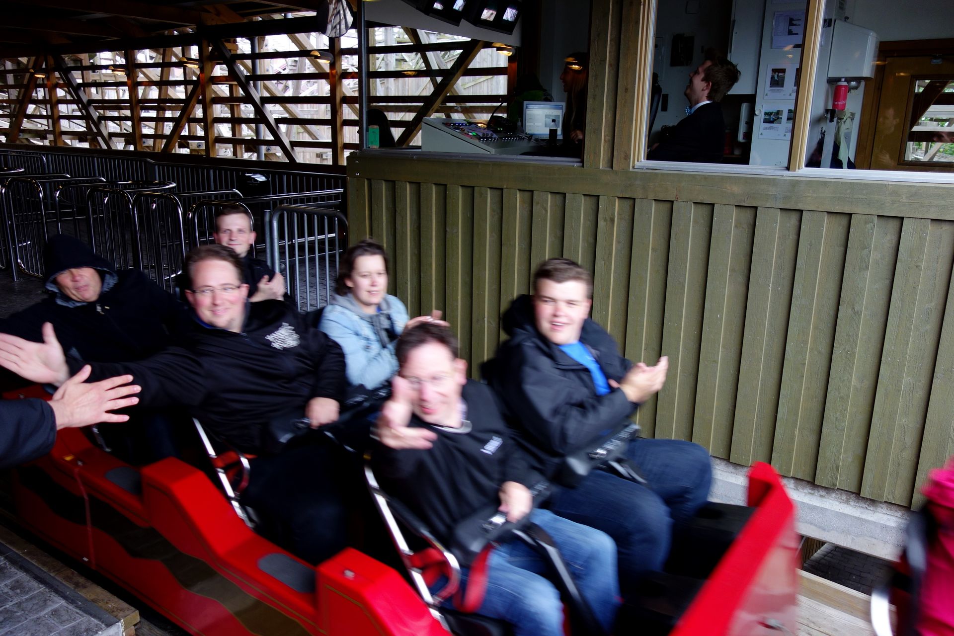 Die ERT dauerte wie gesagt eine knappe Stunde, wobei das kühle Wetter tatsächlich anstrengender war als die Bahn an sich. Nach den beiden ersten Tourtagen waren wir alle doch irgendwie auf höhere Temperaturen eingestellt. Dennoch war es ein super Tageseinstieg, den einige von uns eigentlich direkt auf dem benachbarten Mini-Launcher Kanonen fortsetzen wollten. Doch nach den beobachteten Testfahrten hatte man wohl Probleme festgestellt und eine zeitnahe Öffnung verschoben. Unsere kampferprobte Truppe wanderte stattdessen also zunächst zur ältesten Achterbahn des Parks, wo wir erstmals Bekanntschaft mit dem normalen Publikum schlossen...