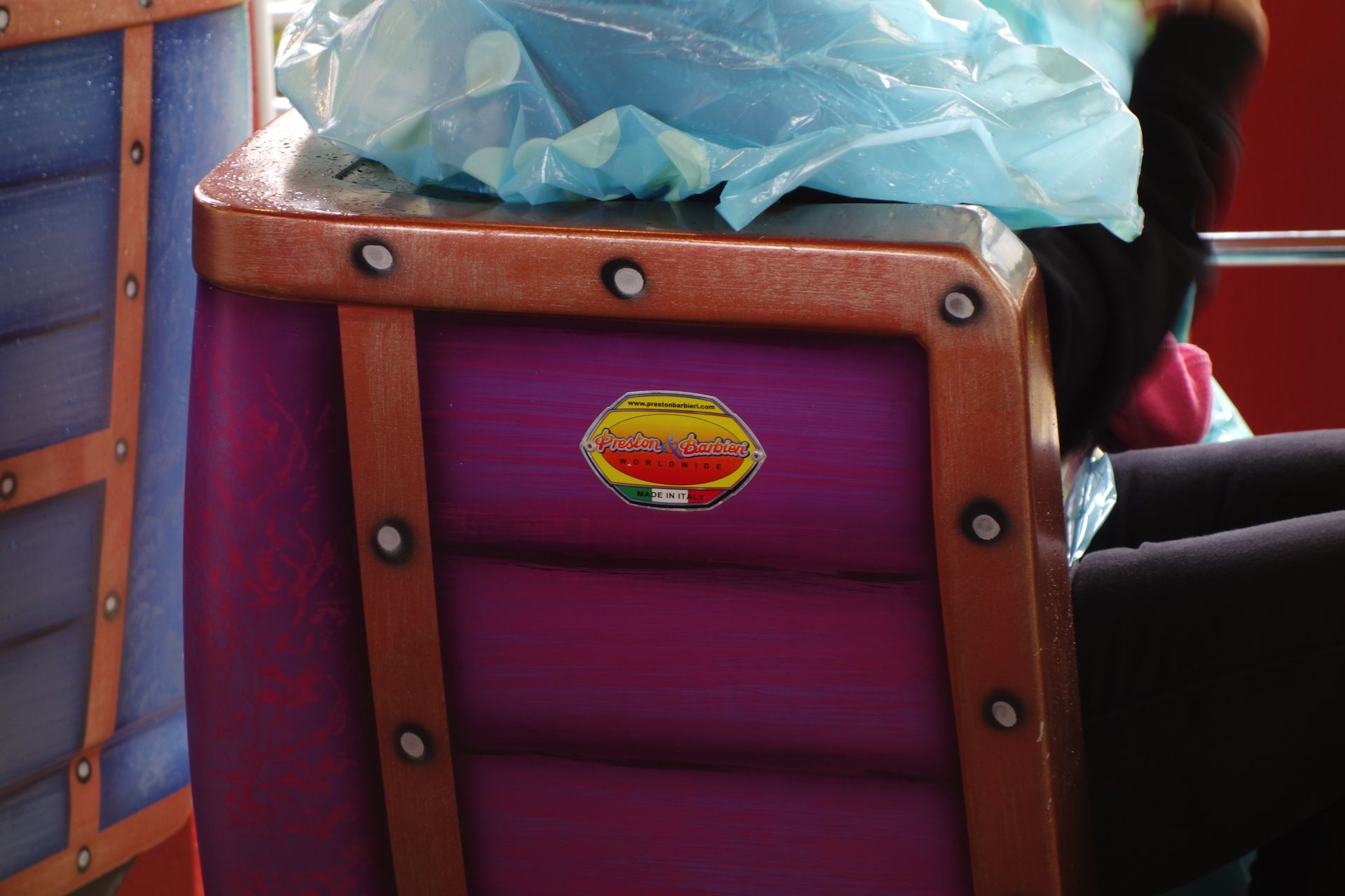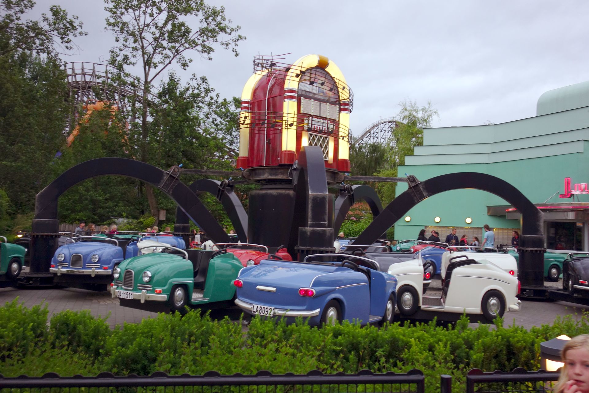 Die drehwurmfreudige Warteschlange verlangte uns noch immer etwa eine halbe Stunde Geduld ab, bis wir die eigentlich zu Genüge von baugleichen Anlagen bekannte Fahrt absolvieren konnten. Aber wir hatten Glück, denn kurz hinter uns war der Wartebereich wohl geschlossen worden. Genau wie wohl bei allen Attraktionen im Kinderland, die erhoffte Fahrt auf der Oldtimerbahn zum Führerschein Ausdrucken fiel damit leider ins Wasser. Aber den nahen Polypen im Jukebox-Design nahmen wir noch mit. Immer mit passender Rock&Roll-Musik zur Fahrt. Die Fahrt selbst gehörte meiner Erinnerung nach aber leider zu den schwächeren der Tour.