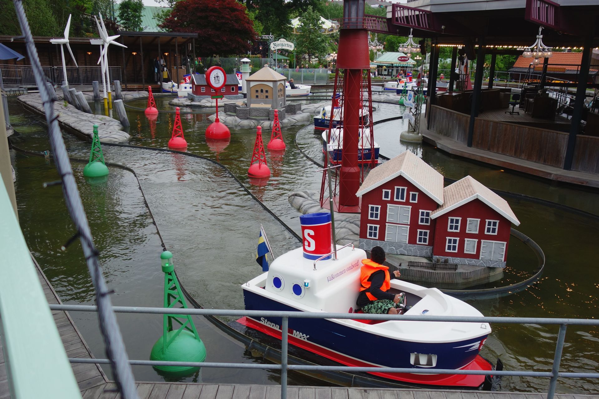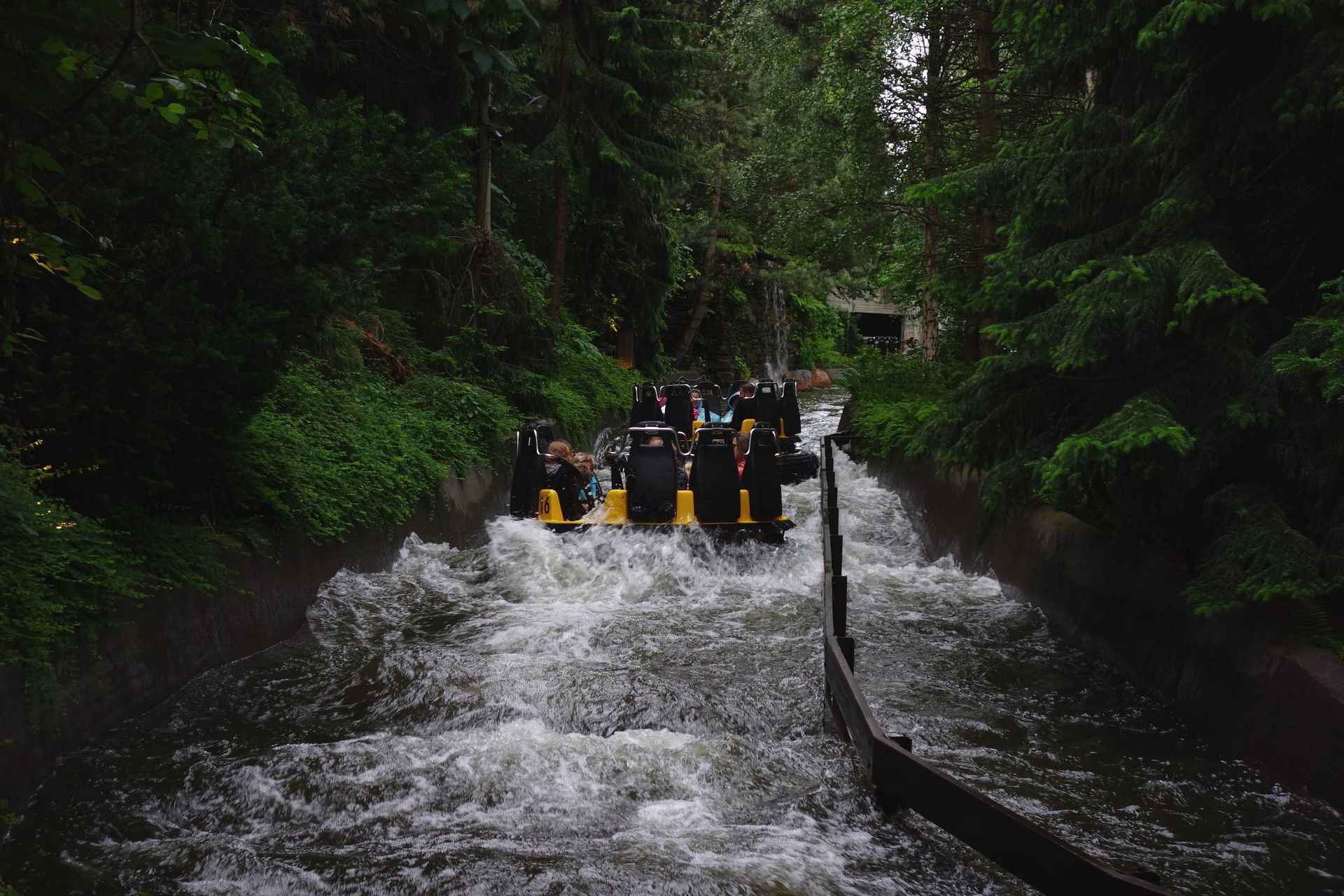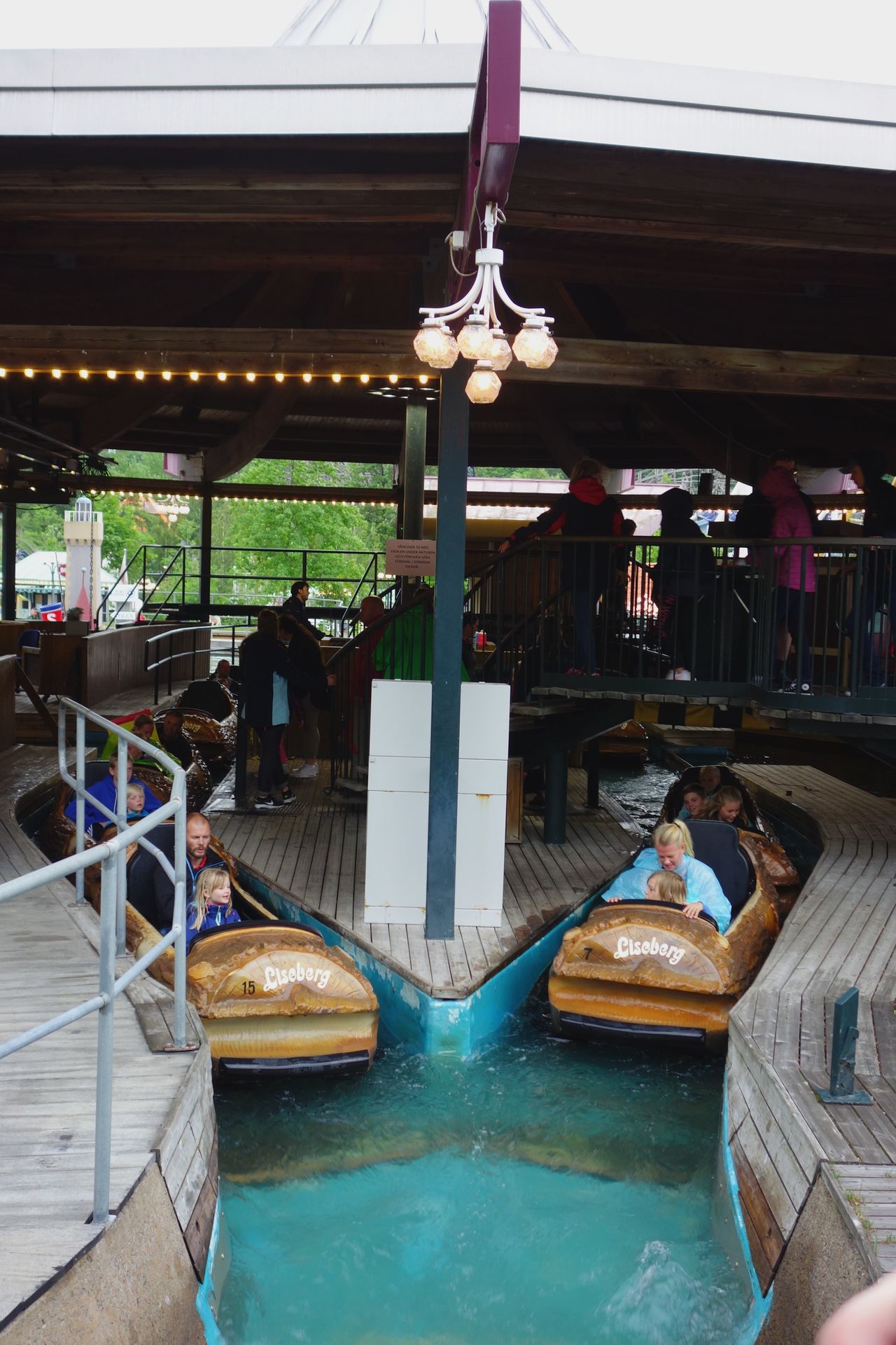 Die Zahl der Fahrwilligen war jedoch etwas größer als beim Rafting, trotz der widrigen Witterungsverhältnisse. Wir bekamen hier dennoch zu zweit ein Boot für uns allein und erklommen so schon bald den recht langen Lifthill den Liseberg hinauf. Dort folgt eine kurze Wende und dann schippert man ein wenig am Hang entlang mit herrlicher Aussicht auf den unteren Parkteil. Noch dazu hatten wir Glück, die Lisebergbanan donnerte hier genau über uns hinweg. Fast zum Greifen nah. Schließlich schwenkt die Fahrrinne wieder Richtung Berg und es folgt ein zweiter Lifthill. An dessen Spitze angelangt führt die Strecke quasi einmal um den in diesem Jahr neu angelegten Bereich Liseberg Gardens, ehe endlich der erste Drop folgt. Etwa 9 Meter geht es in die Tiefe, wo jedoch nach dem Splash nur ein kleiner Dip, ein flotter Knick und eine ganz kurze Gerade folgen. Danach geht es auch schon direkt die verbliebenen 14 Meter hinab, wo man auch gleich wieder in die Station einfährt. Ein wirklich ungewöhnliches Layout für eine solche Wildwasserbahn. Mit insgesamt 23 Metern hätte man also sicherlich den damals höchsten Drop einer Wildwasserbahn (zumindest Europas) haben können. Dafür wäre der Auslauf unten am Berg aber doch deutlich zu kurz gewesen, sodass die Variante mit den zwei Drops kurz hintereinander wohl die bessere Wahl war. Macht jedenfalls einiges her und kommt - wenn man es nicht weiß - ein wenig überraschend.