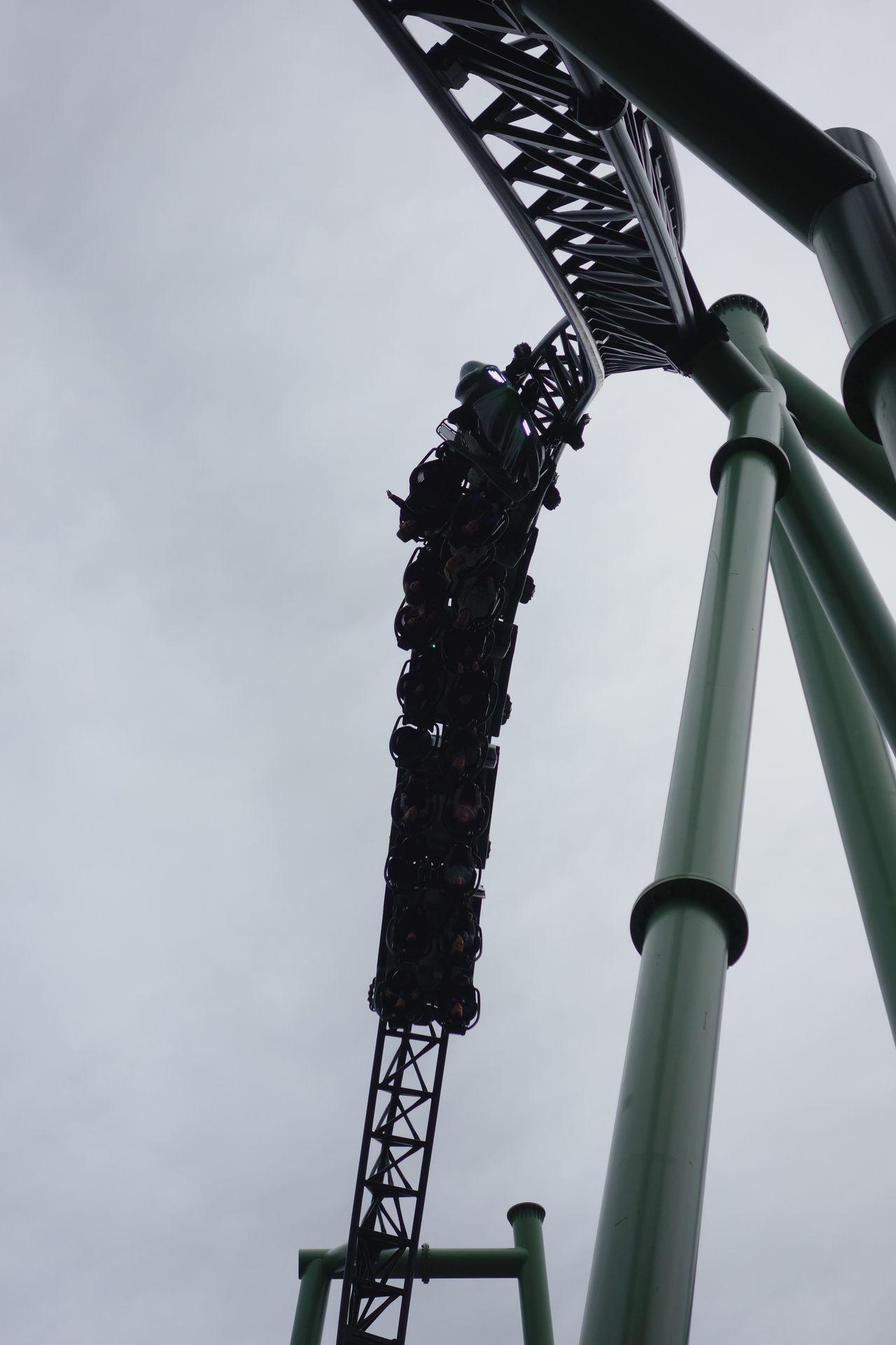 Top Hat erfolgreich überquert hat. Der Launch selbst ist wie von den Hydraulik-Launchern gewohnt schön knackig, endet aber gefühlt bereits dort, wo Schwesterbahnen erst richtig durchziehen. Es bedarf halt wirklich nur eines kurzen Rucks, bis die Höchstgeschwindigkeit von 75 km/h erreicht ist. Nach den beiden Aushängeschildern Kingda ka und Top Thrill Dragtser fühlt sich dieser Abschuss irgendwie total komisch an. Eben unvollendet. Aber er reicht aus, um den Zug über die komplette Strecke zu schicken.