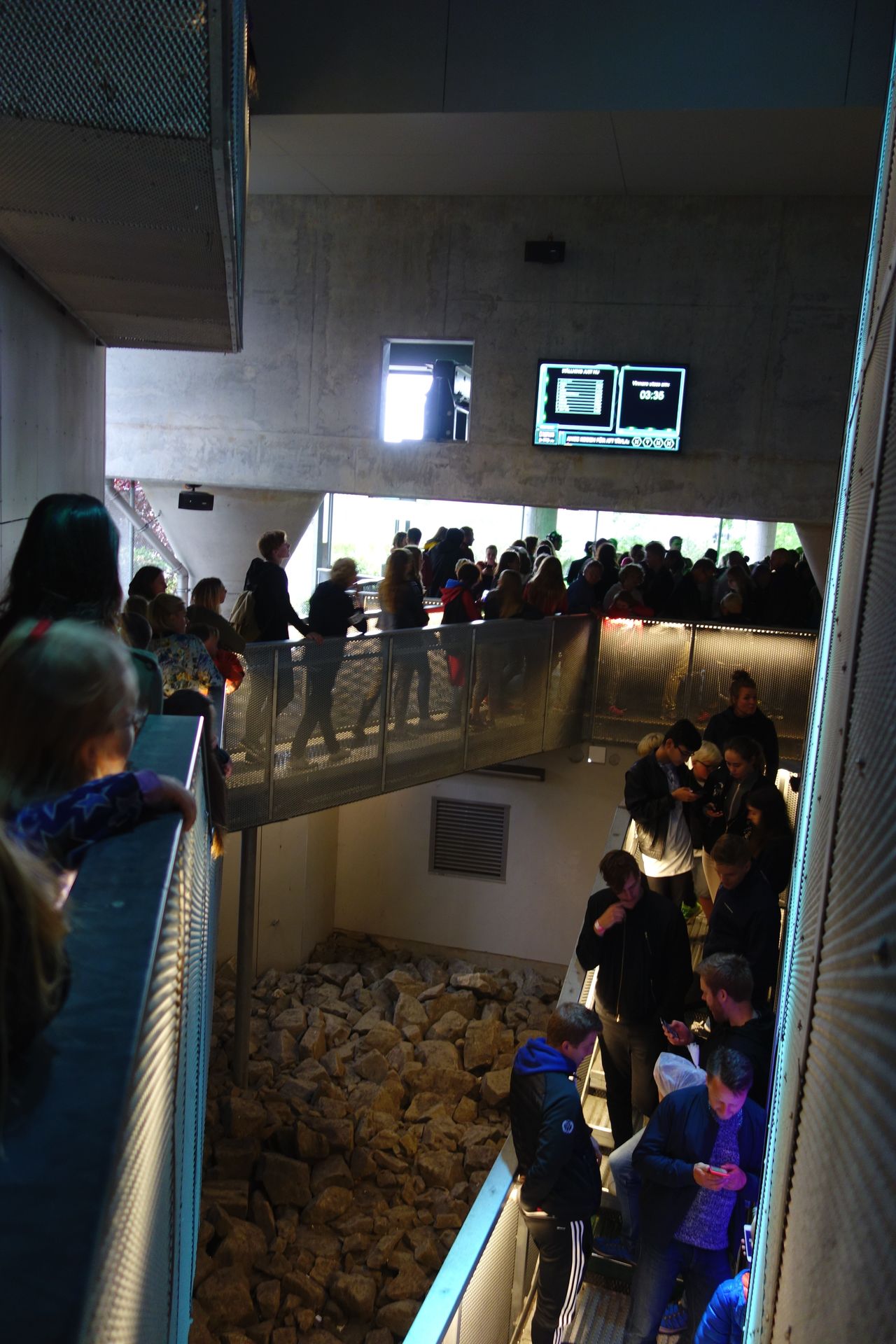 Nur unter dem Verschiebegleis und später unter der Station werden die Besucher auf größeren Flächen im Zick-Zack zusammengepfercht.