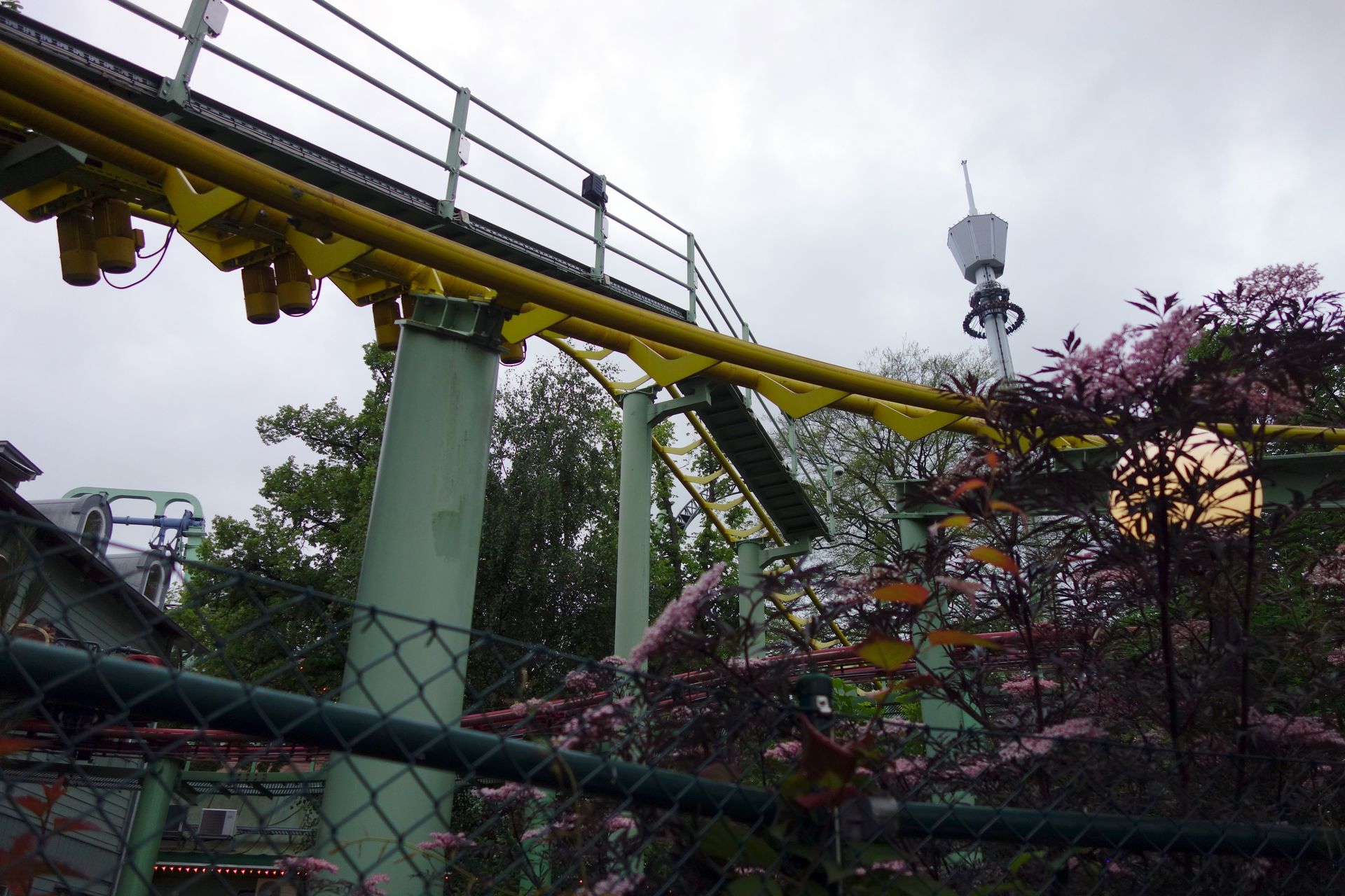 Wieder oben angekommen kann man in der Kurve über Lisebergbanan unter der Wildwasserbahn hindurch etwas Luft holen.