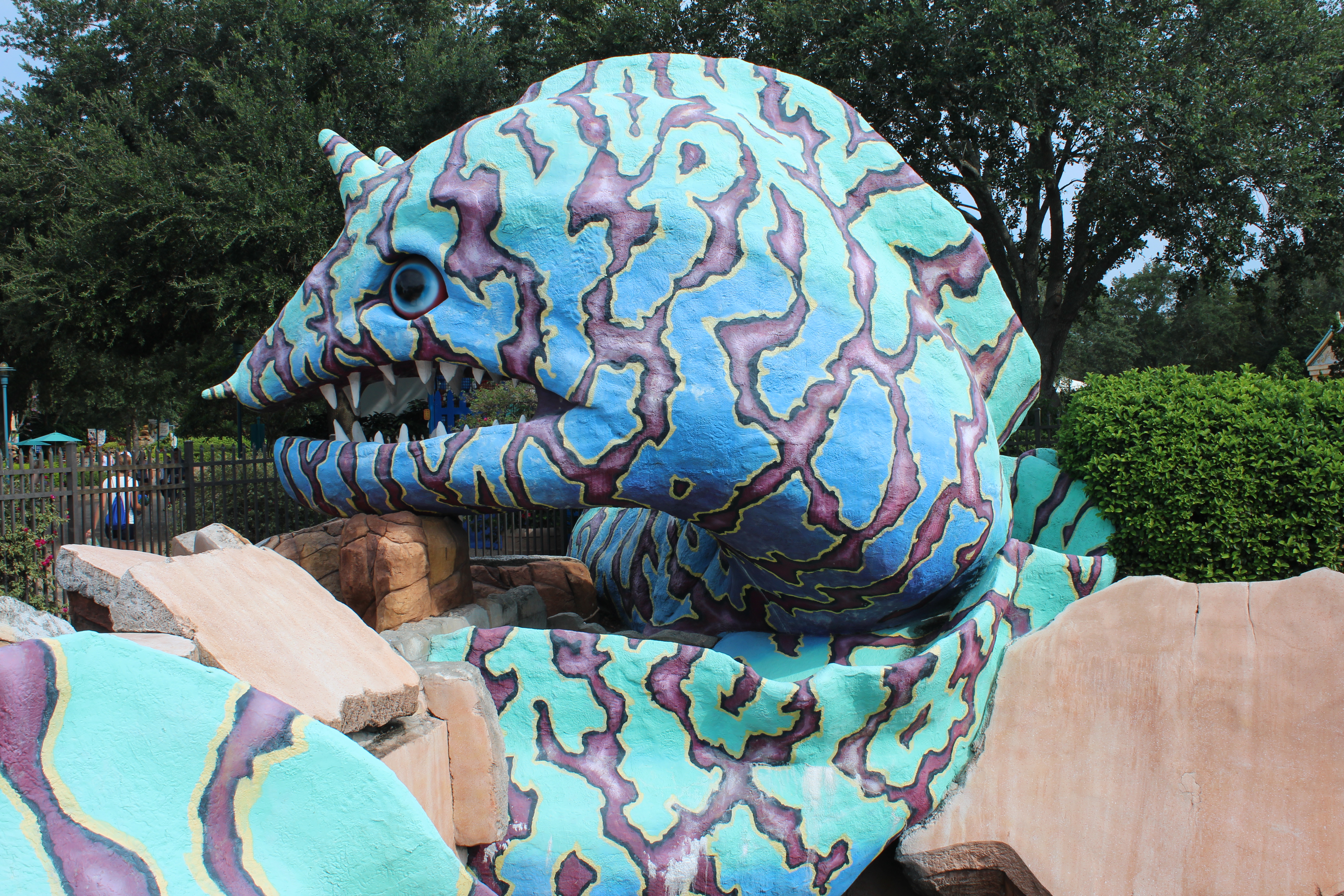 Flying Coaster. Im Vergleich zu „Kraken“ oder auch „Mako“, die beide über einen recht tristen Wartebereich verfügen, ist der Wartebereich von „Manta“ mit Mosaiken und diversen Aquarien doch recht aufwendig gestaltet. Die Wartezeit von rund 30 Minuten war entsprechend kurzweilig. Auch die Fahrt selber hat mir ausnehmend gut gefallen, wobei mir zugegebenermaßen die Vergleichsmöglichkeiten fehlen. Speziell der erste Drop – kopfüber aus etwa 43 Metern in die Tiefe – und der sich anschließende Pretzel
