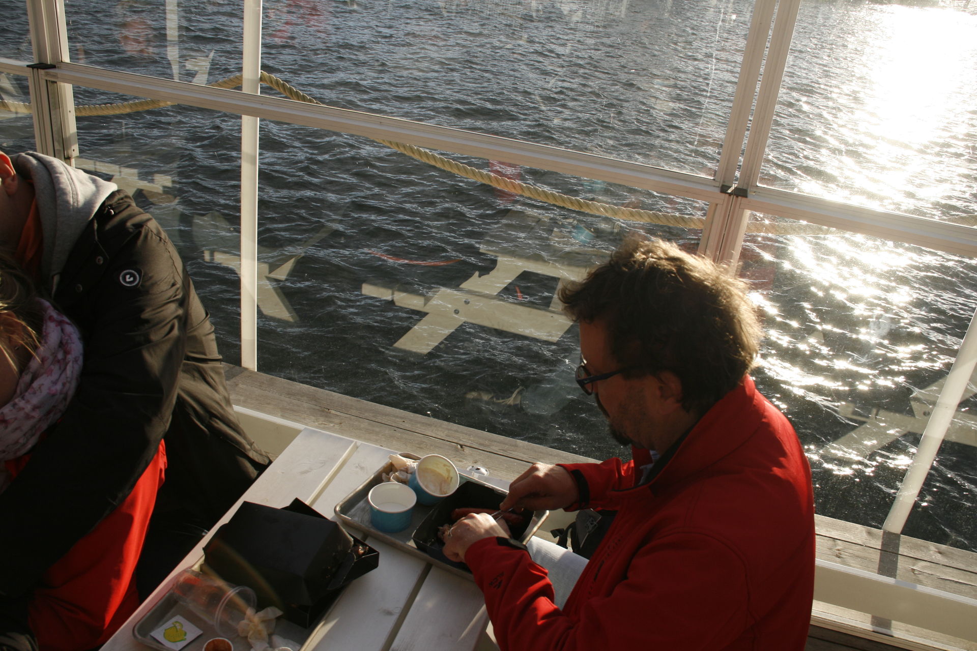 Essen am Barbeque. Die Spare Ribs - sagt Rainer - waren mies. Ich hatte so eine gemischtes Päckchen mit zwei Sides, das war essbar. Dennoch preislich nicht so richtig angemessen. Da war das Gyros Mittags bei Kvasten deutlich besser.