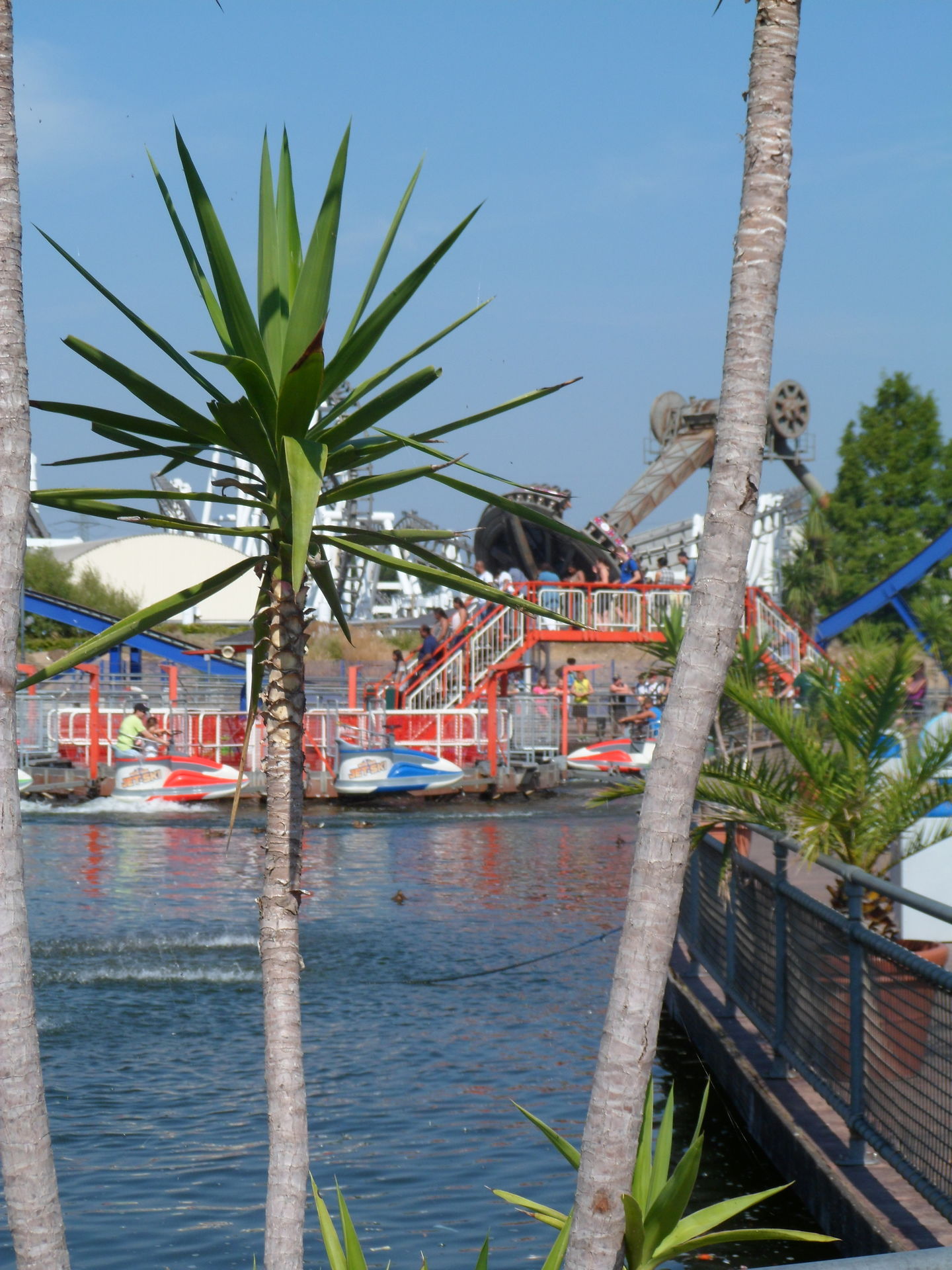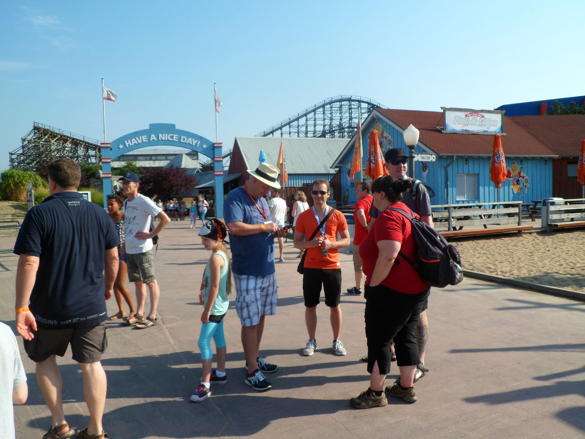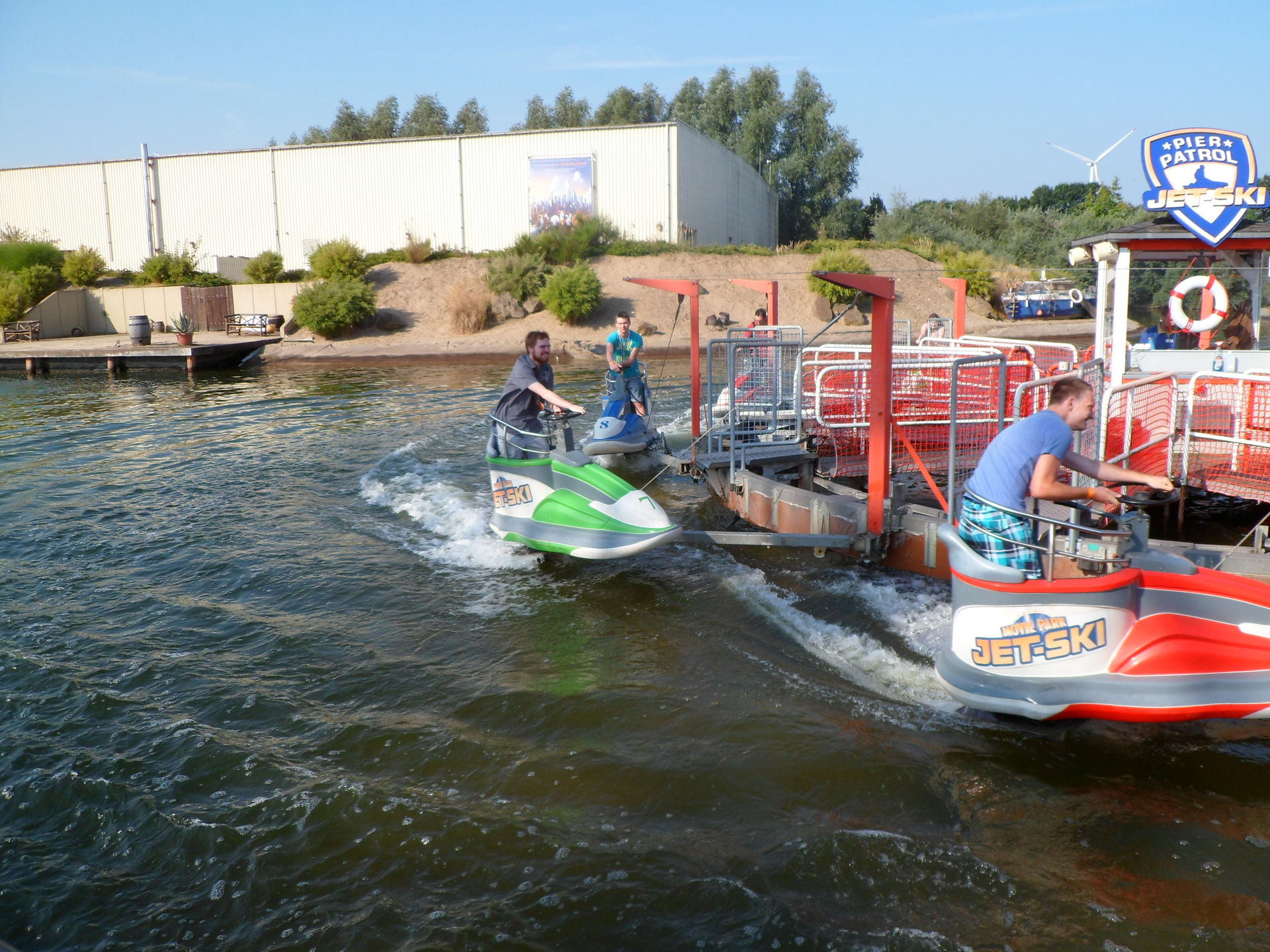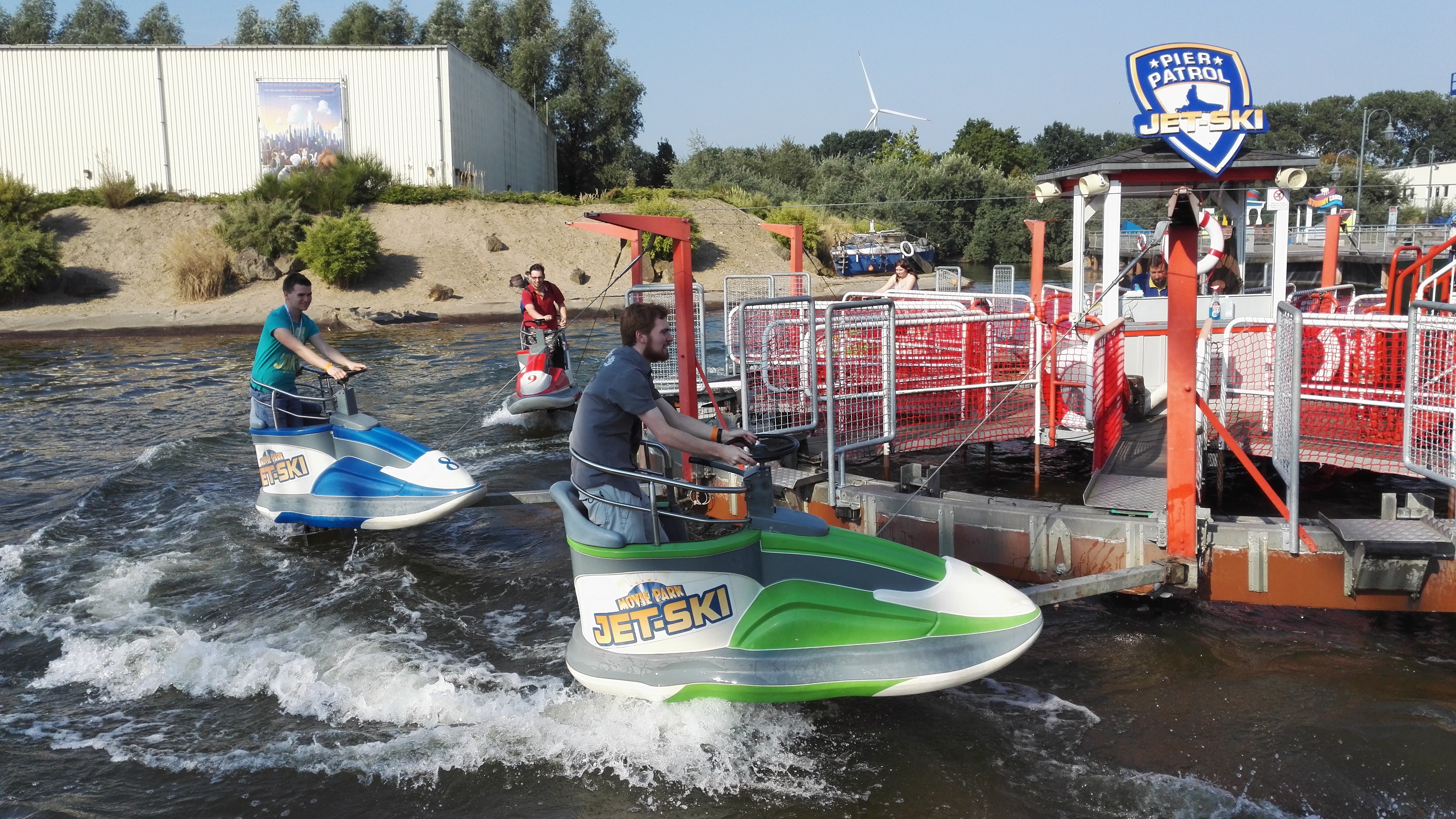 Mit Kaffee, Kakao, gefüllter Brezel und herrlichem Cone Cake mit Schokoladenfüllung gestärkt sollte der Tag mit einer Fahrt auf Bandit beginnen. Aber Bandit sollte erst um 11 Uhr eröffnen, so dass wir zum Pier gingen und feststellten, dass das Jet-Ski Karussell auf Mitfahrer wartete. So entschieden wir uns spontan für eine Rundfahrt auf dem See und wurden vom Ride-op freundlich begrüßt und eingewiesen. Weil nach dem spaßigen Ritt über die Wellen noch immer niemand in der Warteschlange stand, durften wir uns noch über eine zweite Runde freuen. Daumen hoch für meinen Mitarbeiter des Tages.