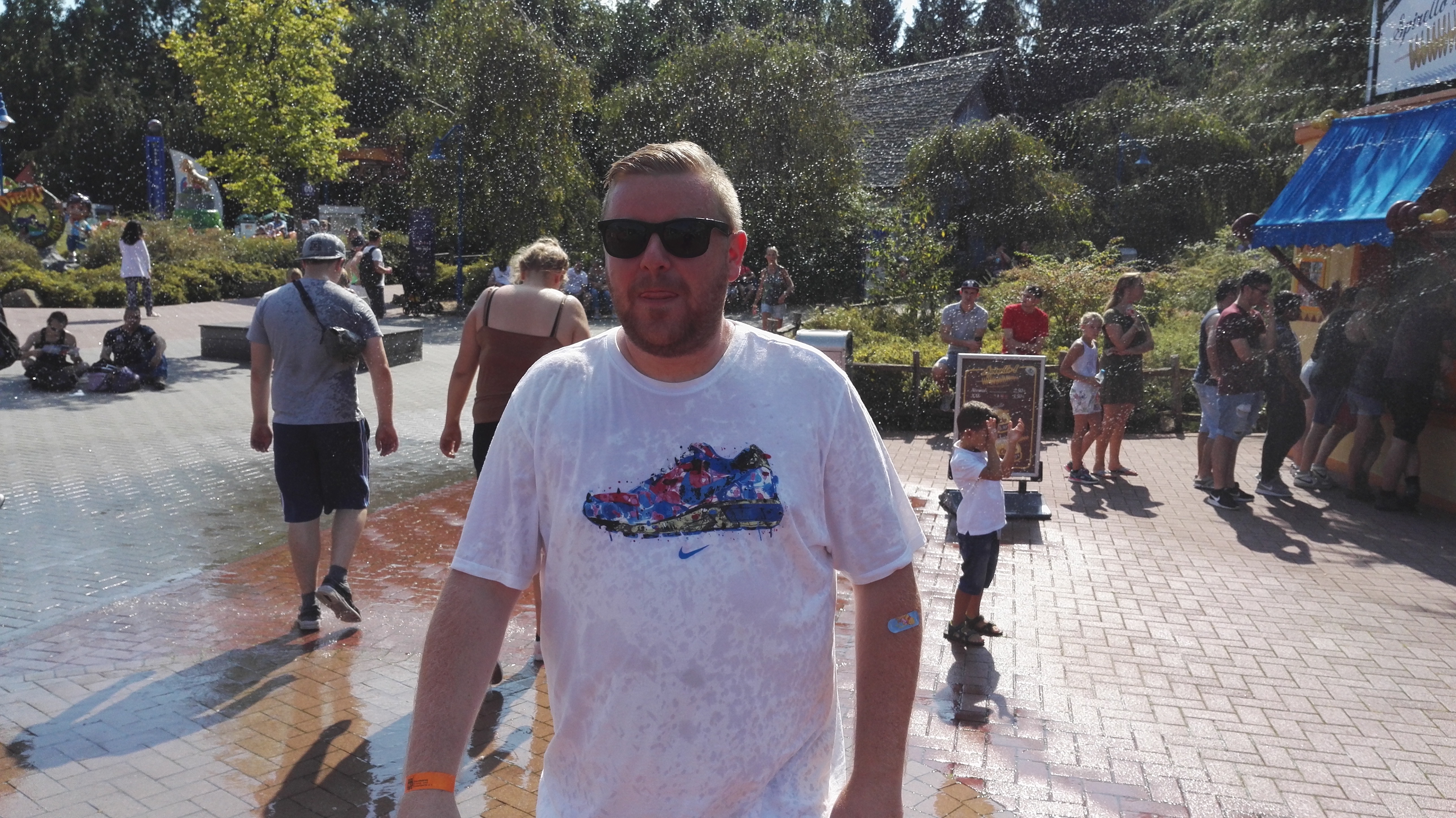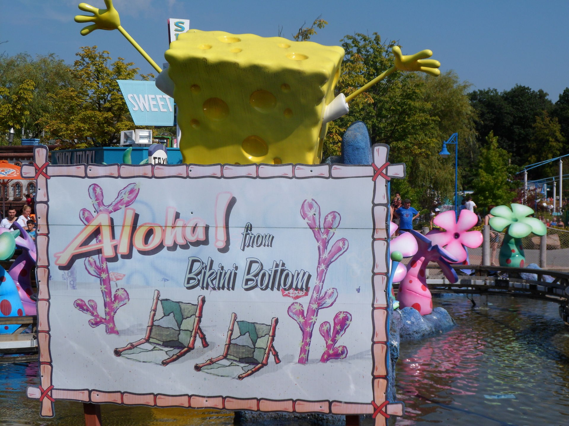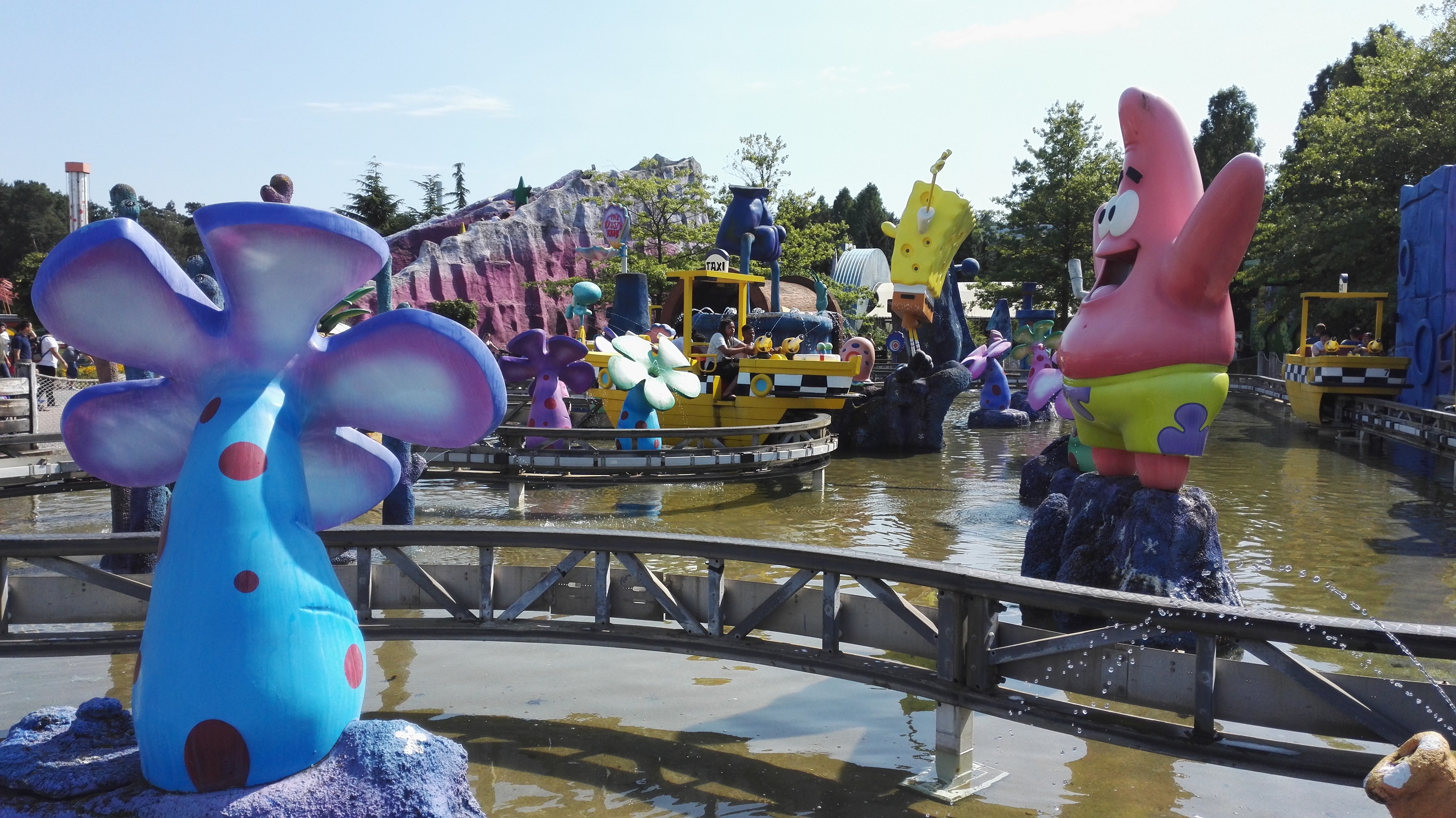 Die Temperaturen legten die Idee nahe, eine Wasserattraktion zu besuchen doch sollte es noch eine Weile dauern, bis mich der erste Wassertropfen traf. Das RED Sydrom (rumstehen, essen, diskutieren) verlangsamte das Vorhaben und es gab Umwege über das Café (Ben&Jerrys Caramel Chew Chew für mich), das Restaurant (Pommes für die meisten) und den Swirl Stand (Swirl für TK, Twin und Tejay) wurde der Plan einer Fahrt auf dem Alien Encounter noch auf dem Weg dorthin verworfen, nachdem uns Berichte über 90 minütige Wartezeiten erreichten. Nach kurzer Abkühlung an den undichten Regenrinnen der Behausung auf der Stuntshow-Kreuzung folgten wir dem Weg ins Nickland um dort eine Abkühlung zu finden. Dora wollte sich offenbar bei der Hitze nicht zu sehr anstrengen und ließ nur wenige Boote fahren, so dass auch dort Wartezeiten jenseits unserer Toleranzgrenze entstanden sind. Mister Y River sollte gerüchteweise ebenfalls lange auf sich warten lassen, so dass uns Spongebob als Alternative sehr attraktiv erschien. Der Plan per OMS die Onrider zu einer amtlichen Durchnässung aufzufordern wurde kurzerhand verworfen, so dass wir dies letztendlich an einem Rechteckregner nachgeholt haben, den man an einem Laternenmast befestigt hatte.