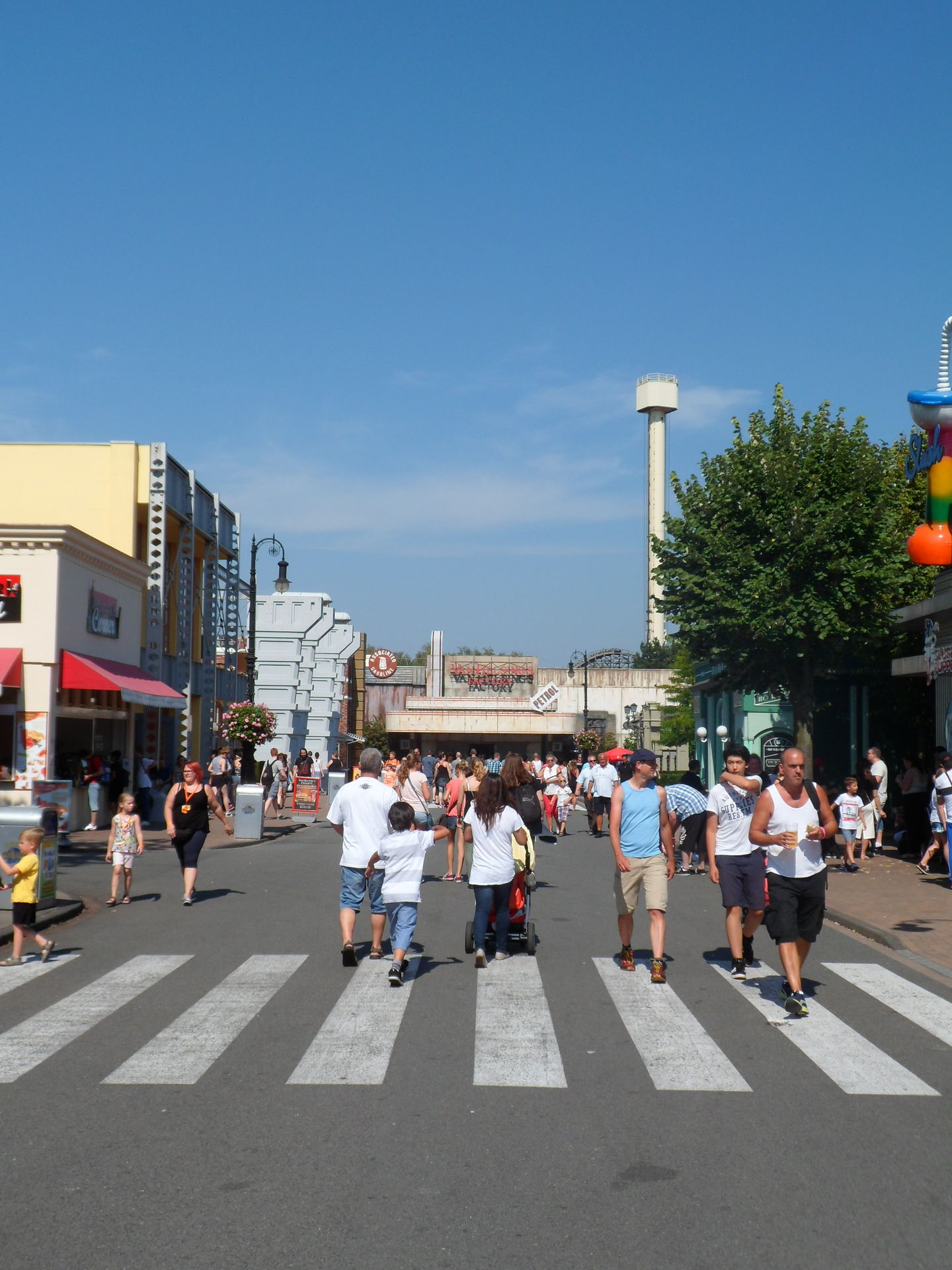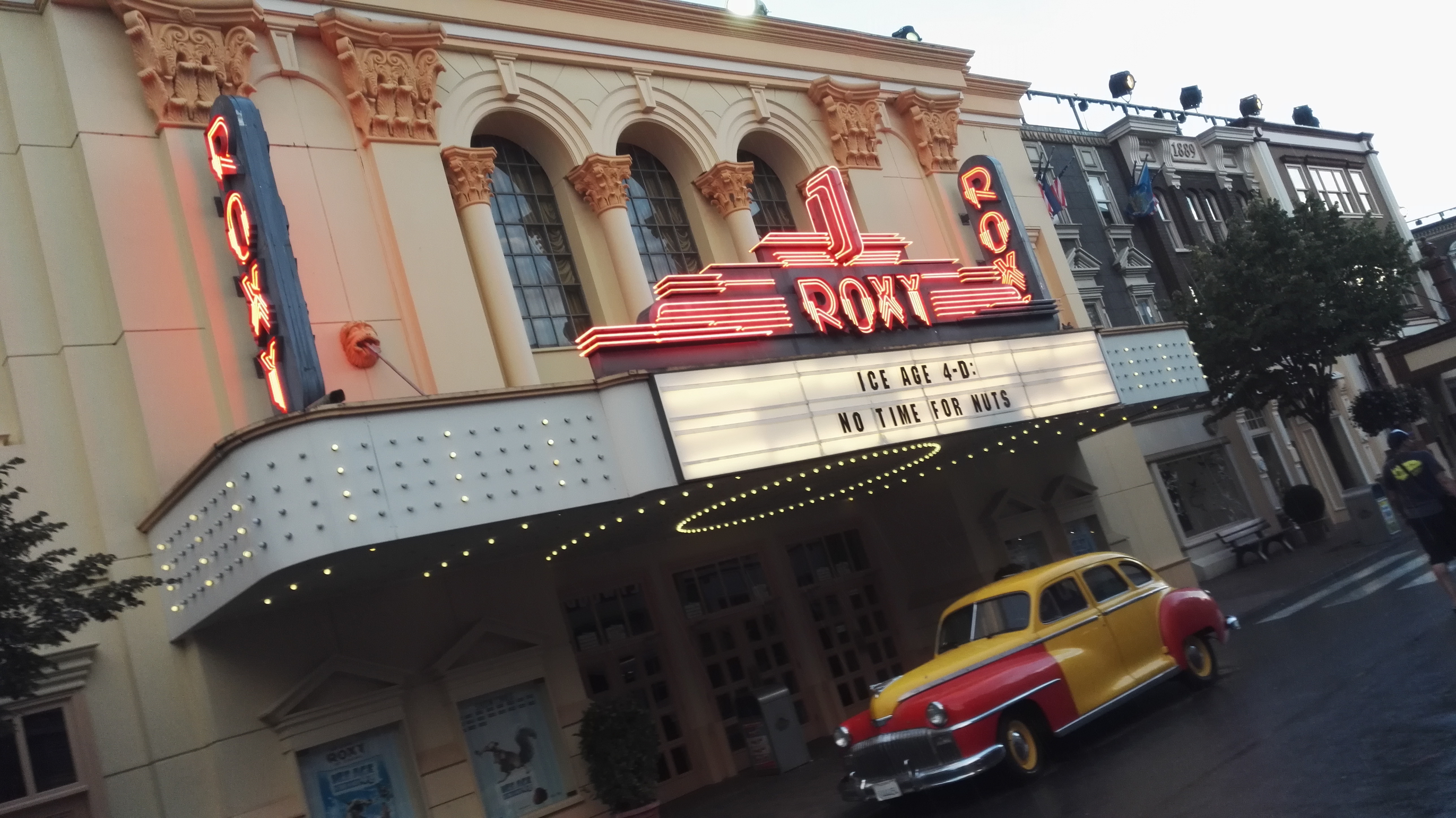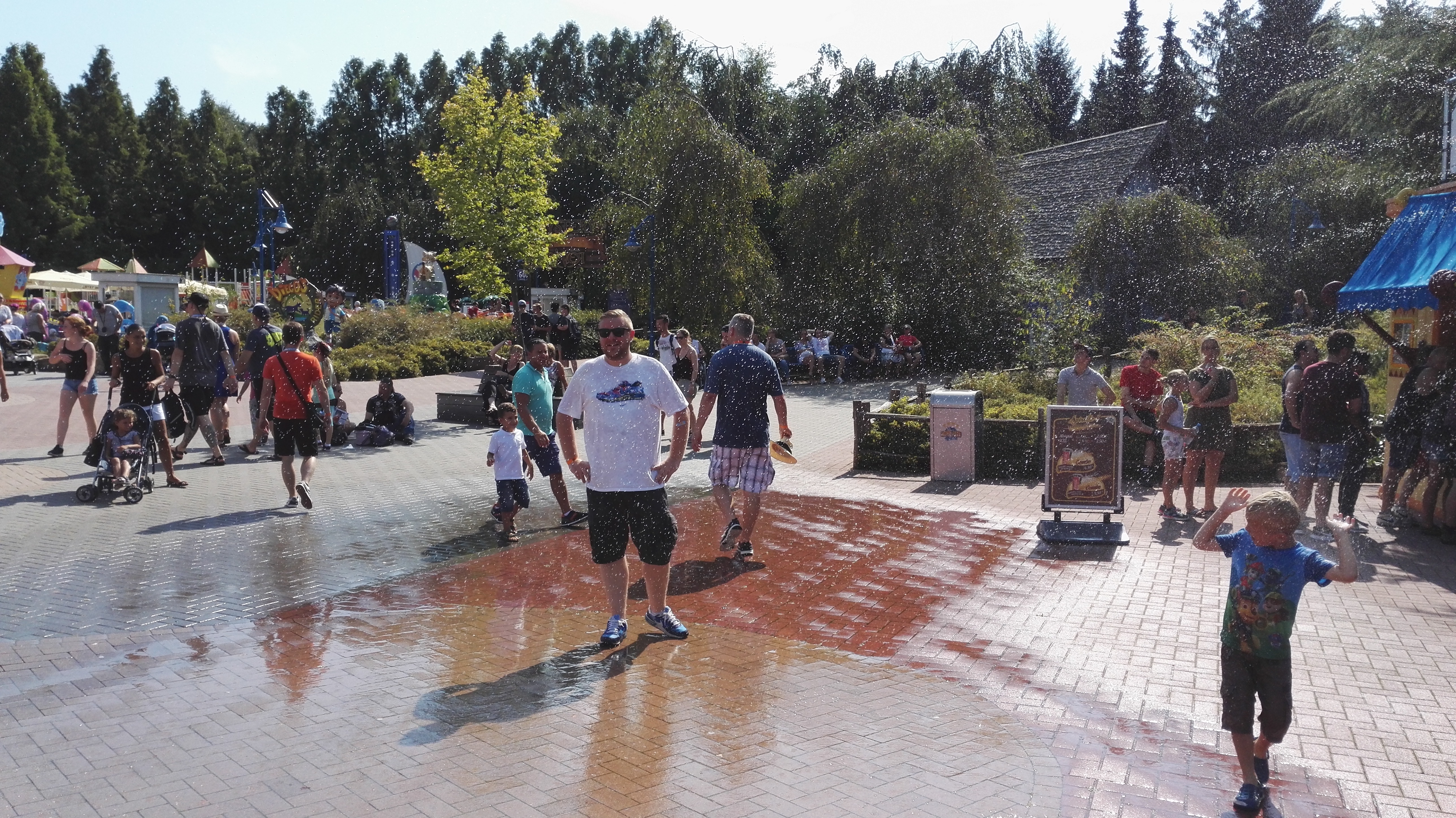 Die Temperaturen legten die Idee nahe, eine Wasserattraktion zu besuchen doch sollte es noch eine Weile dauern, bis mich der erste Wassertropfen traf. Das RED Sydrom (rumstehen, essen, diskutieren) verlangsamte das Vorhaben und es gab Umwege über das Café (Ben&Jerrys Caramel Chew Chew für mich), das Restaurant (Pommes für die meisten) und den Swirl Stand (Swirl für TK, Twin und Tejay) wurde der Plan einer Fahrt auf dem Alien Encounter noch auf dem Weg dorthin verworfen, nachdem uns Berichte über 90 minütige Wartezeiten erreichten. Nach kurzer Abkühlung an den undichten Regenrinnen der Behausung auf der Stuntshow-Kreuzung folgten wir dem Weg ins Nickland um dort eine Abkühlung zu finden. Dora wollte sich offenbar bei der Hitze nicht zu sehr anstrengen und ließ nur wenige Boote fahren, so dass auch dort Wartezeiten jenseits unserer Toleranzgrenze entstanden sind. Mister Y River sollte gerüchteweise ebenfalls lange auf sich warten lassen, so dass uns Spongebob als Alternative sehr attraktiv erschien. Der Plan per OMS die Onrider zu einer amtlichen Durchnässung aufzufordern wurde kurzerhand verworfen, so dass wir dies letztendlich an einem Rechteckregner nachgeholt haben, den man an einem Laternenmast befestigt hatte.