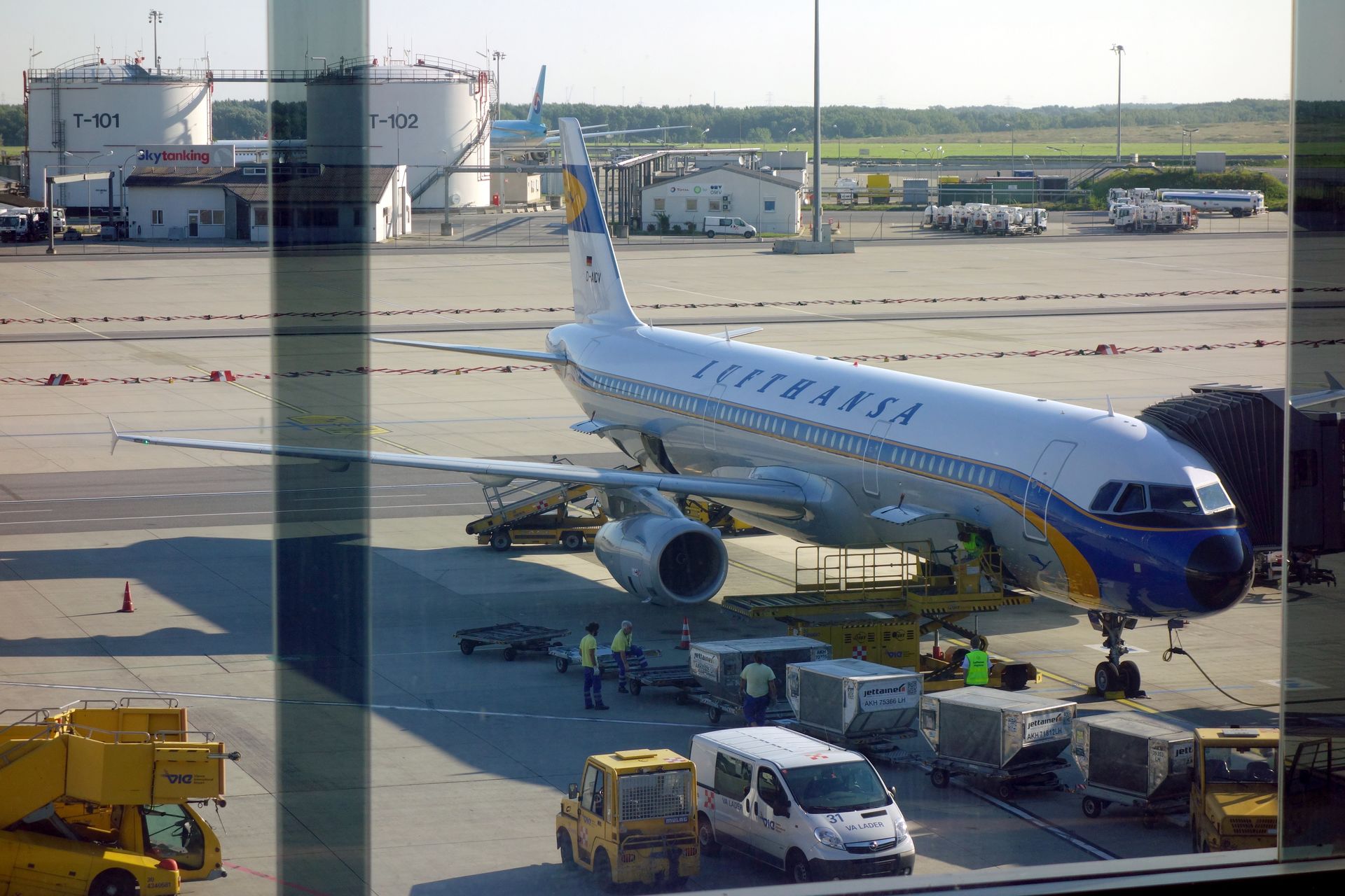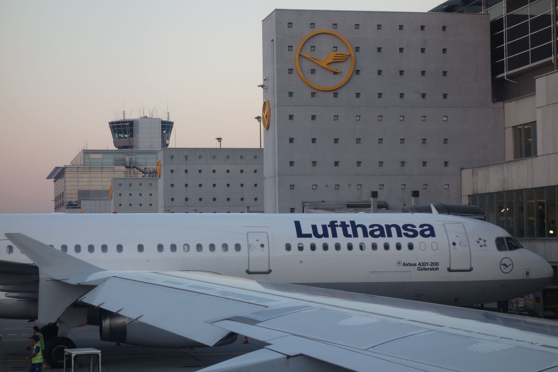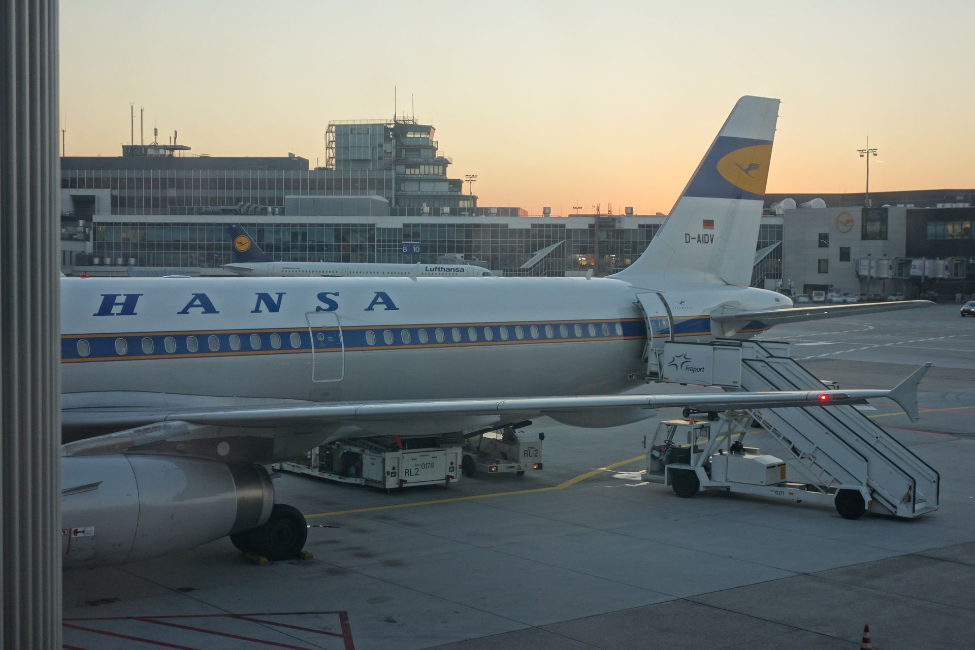 Gebucht hatte ich die mit knapp 110¤ günstigste Flugkombi der Lufthansa, mit dem ersten Flug am Samstag nach Wien und am Dienstag Nachmittag wieder zurück. Übernachten sollten wir bei Alex können, sodass wir uns die Hotelkosten sparen konnten. Und so wartete ich morgens um kurz vor vier auf Nicolas, damit wir gemeinsam aufbrechen konnten. Parken durfte ich bei den Kollegen am Stellwerk in Groß-Gerau - Dornberg, von wo aus die S-Bahn uns zum Flughafen Frankfurt brachte. Zu dieser frühen Stunde war es dort noch recht leer, sodass wir ohne Wartezeit durch die Sicherheitskontrolle zum Gate kamen, wo unser Flieger bereits parat stand. Mit einer hübschen Sonderlackierung.