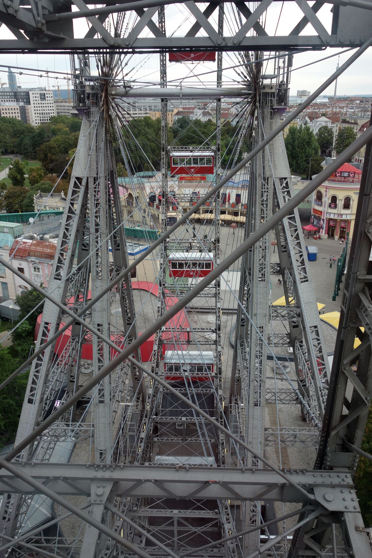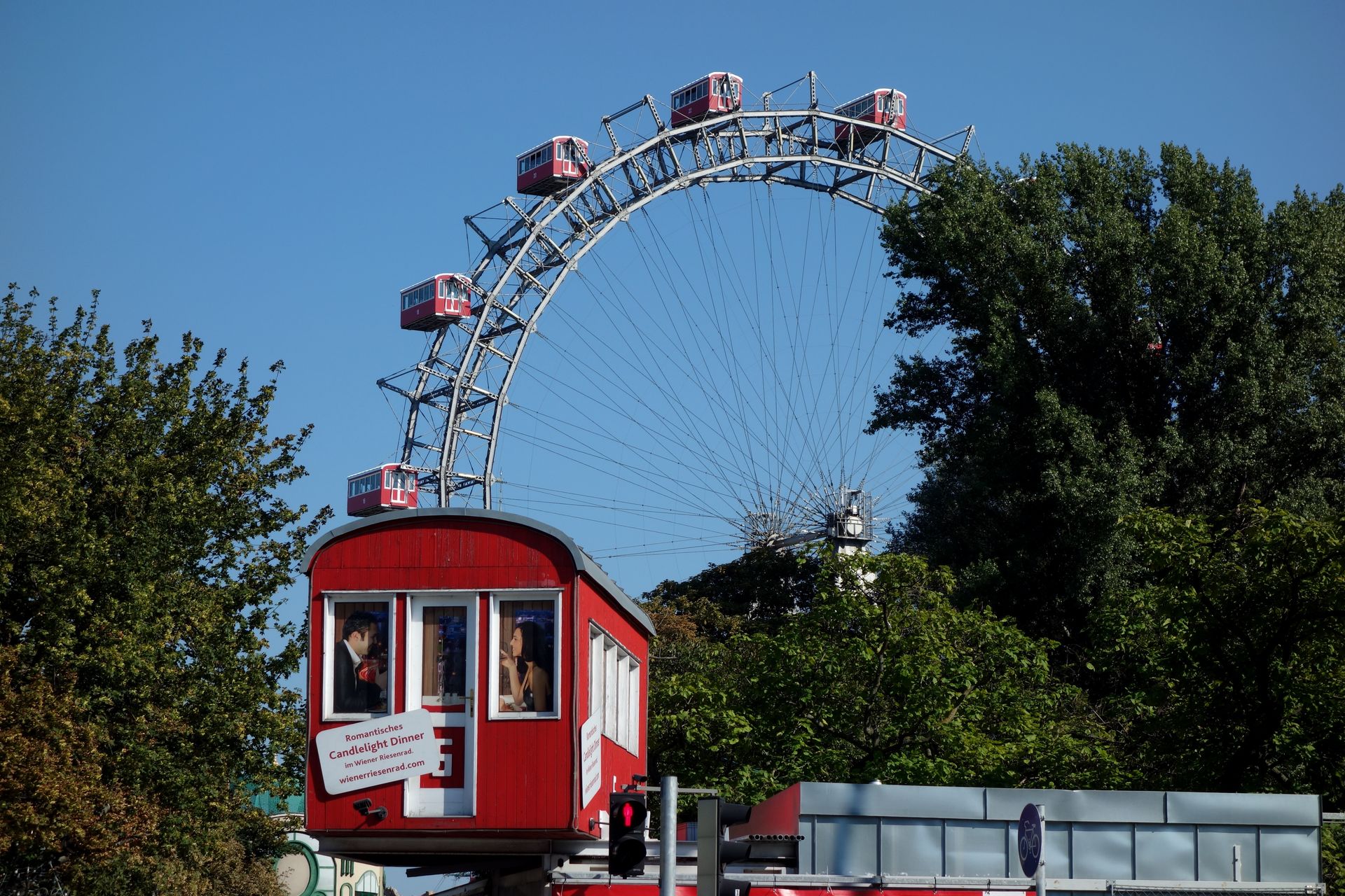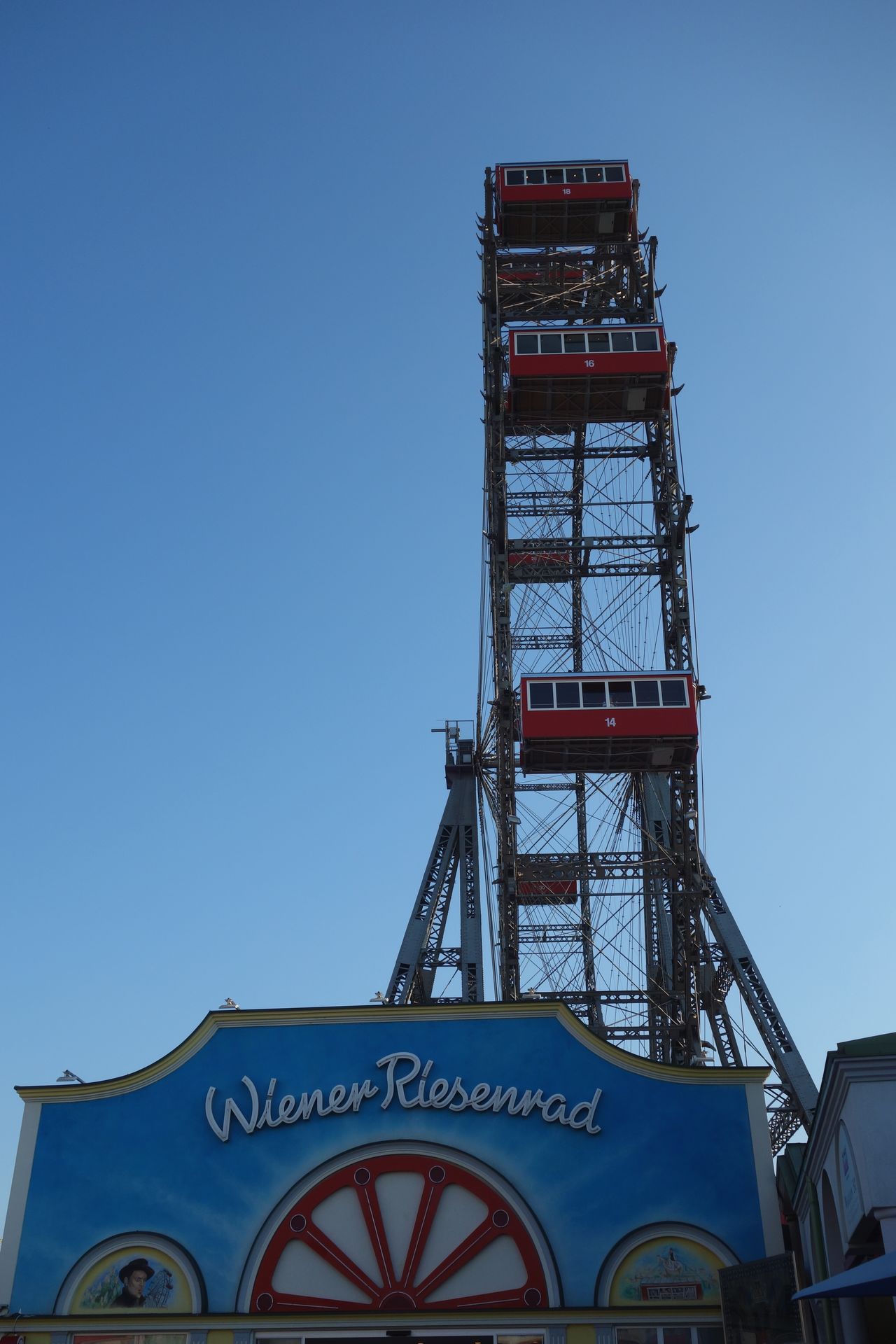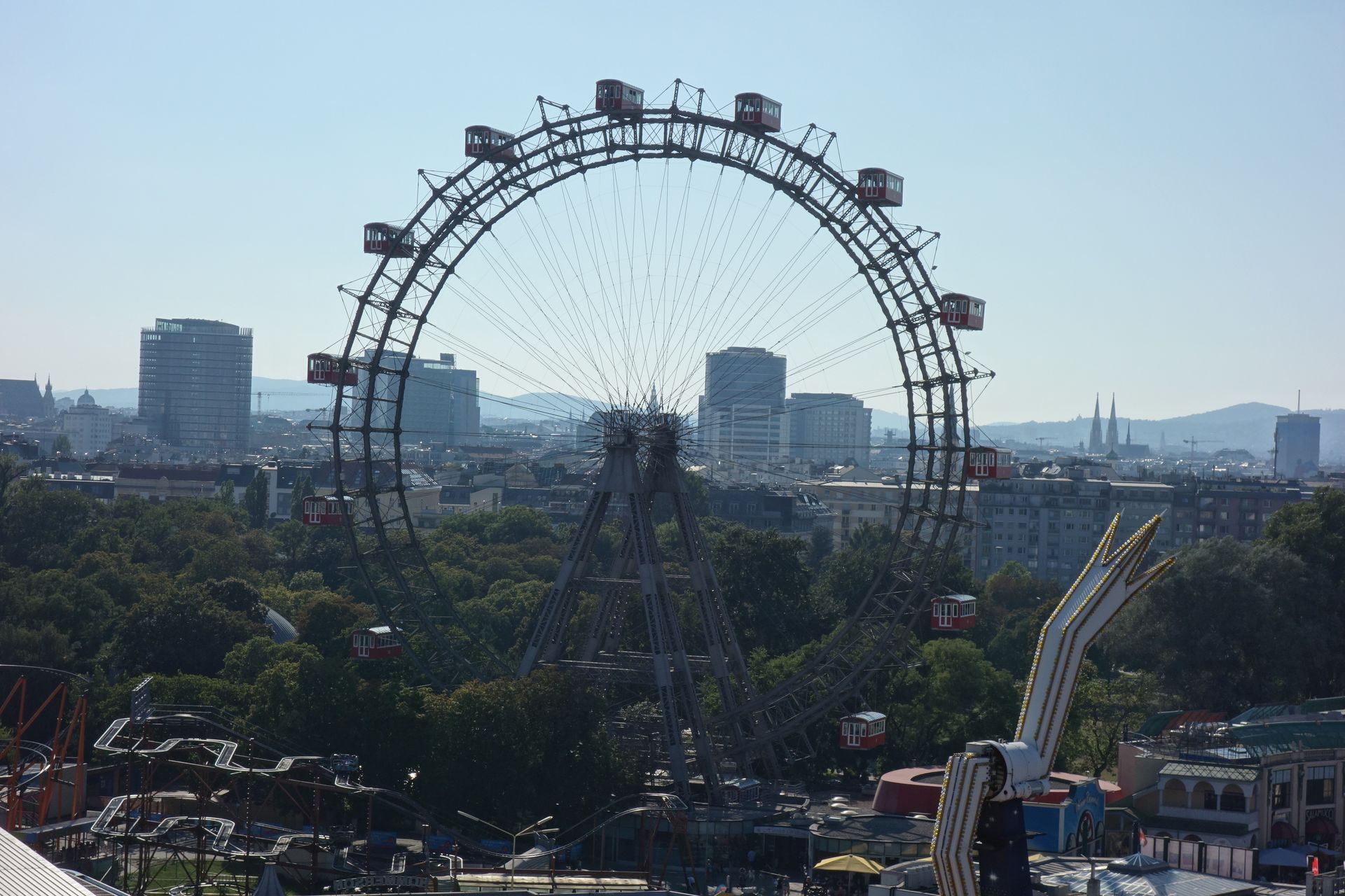 Das 1897 zur Feier des 50. Thronjubiläums von Kaiser Franz Joseph I eröffnete Riesenrad brannte nach Bombenangriffen nämlich komplett aus. Beim Wiederaufbau wurden dann nur noch 15 statt der einst 30 Gondeln aufgehängt. Laut Christian, weil der Wiener gerne nur halbe Sachen macht (der Stephansdom hat schließlich statt zwei großen Türmen auch nur einen großen und einen halben). Offiziell ging man davon aus, dass die Stabilität des Rades durch die Brandschäden gelitten habe. Außerdem verbaute man aus Kostengründen nur noch 4 Fenster pro Gondelseite statt 6. Zur Saison 2016 wurden aber wieder nagelneue Gondeln nach den Originalplänen montiert.