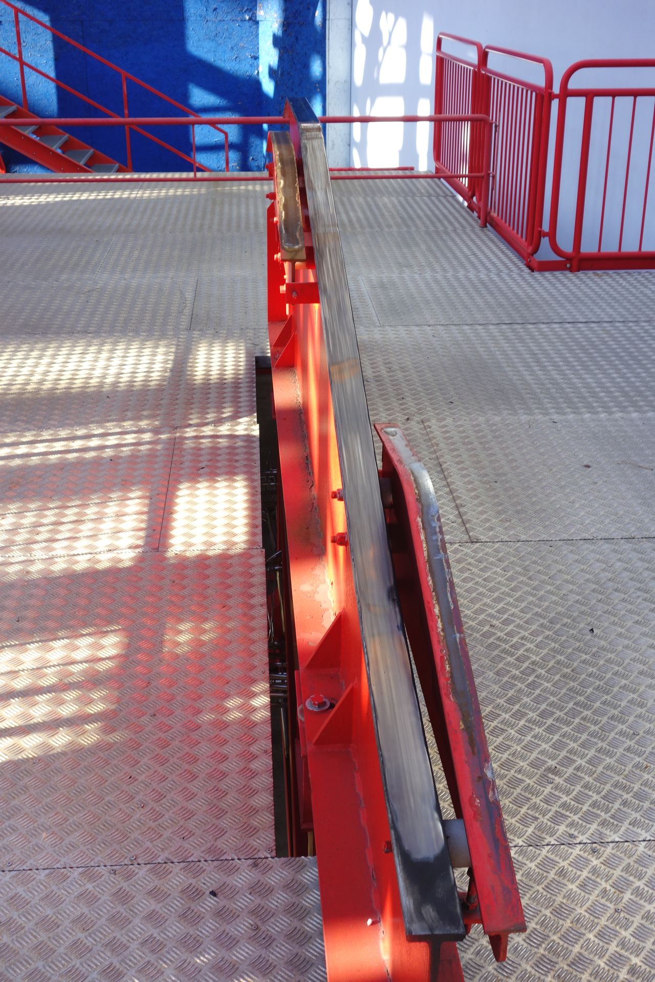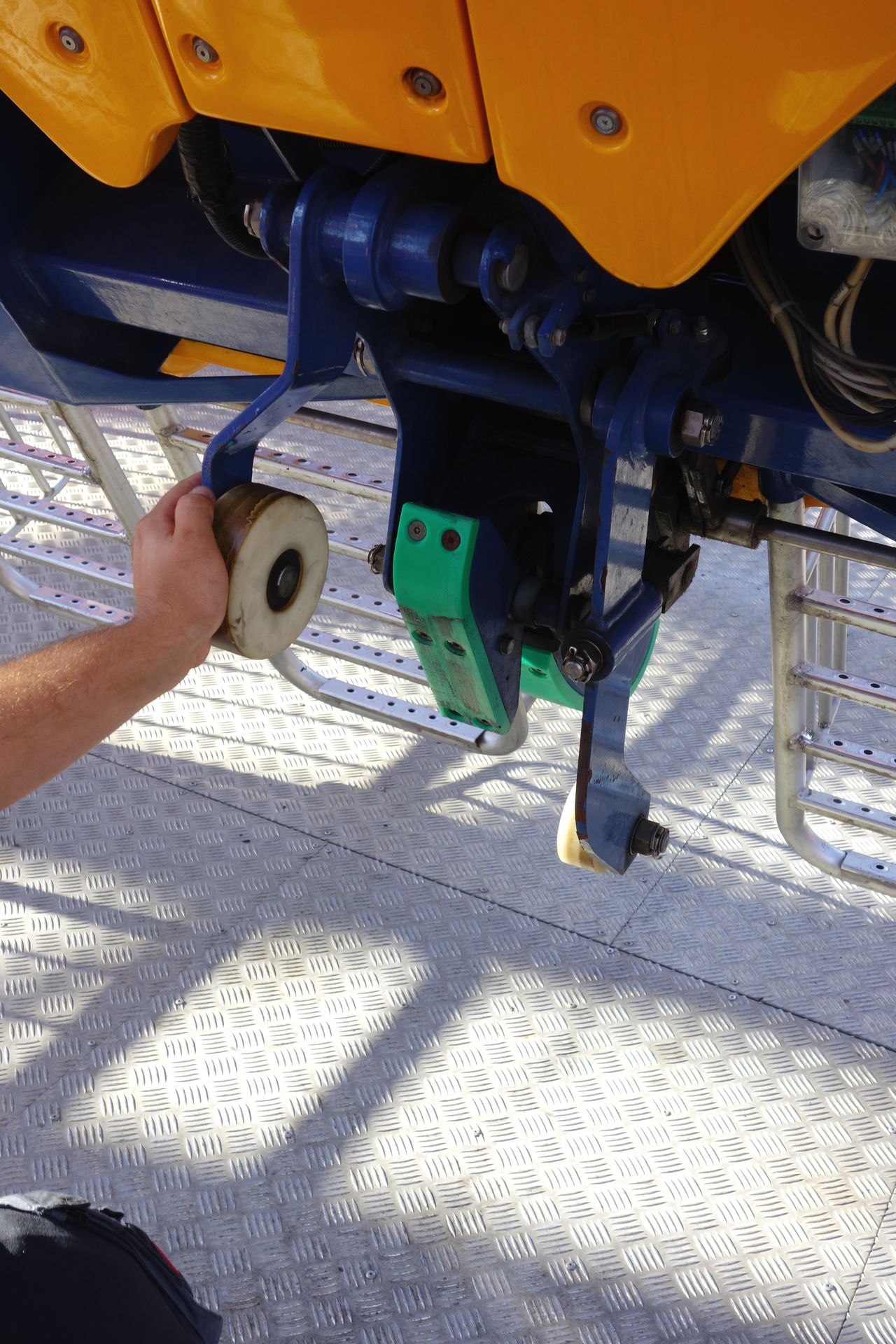 Das Umklappen funktioniert rein mechanisch. Eine Metallschiene drückt den Wagen hoch, eine zweite sichert ihn über den Hebel links mit einem Bolzen.
