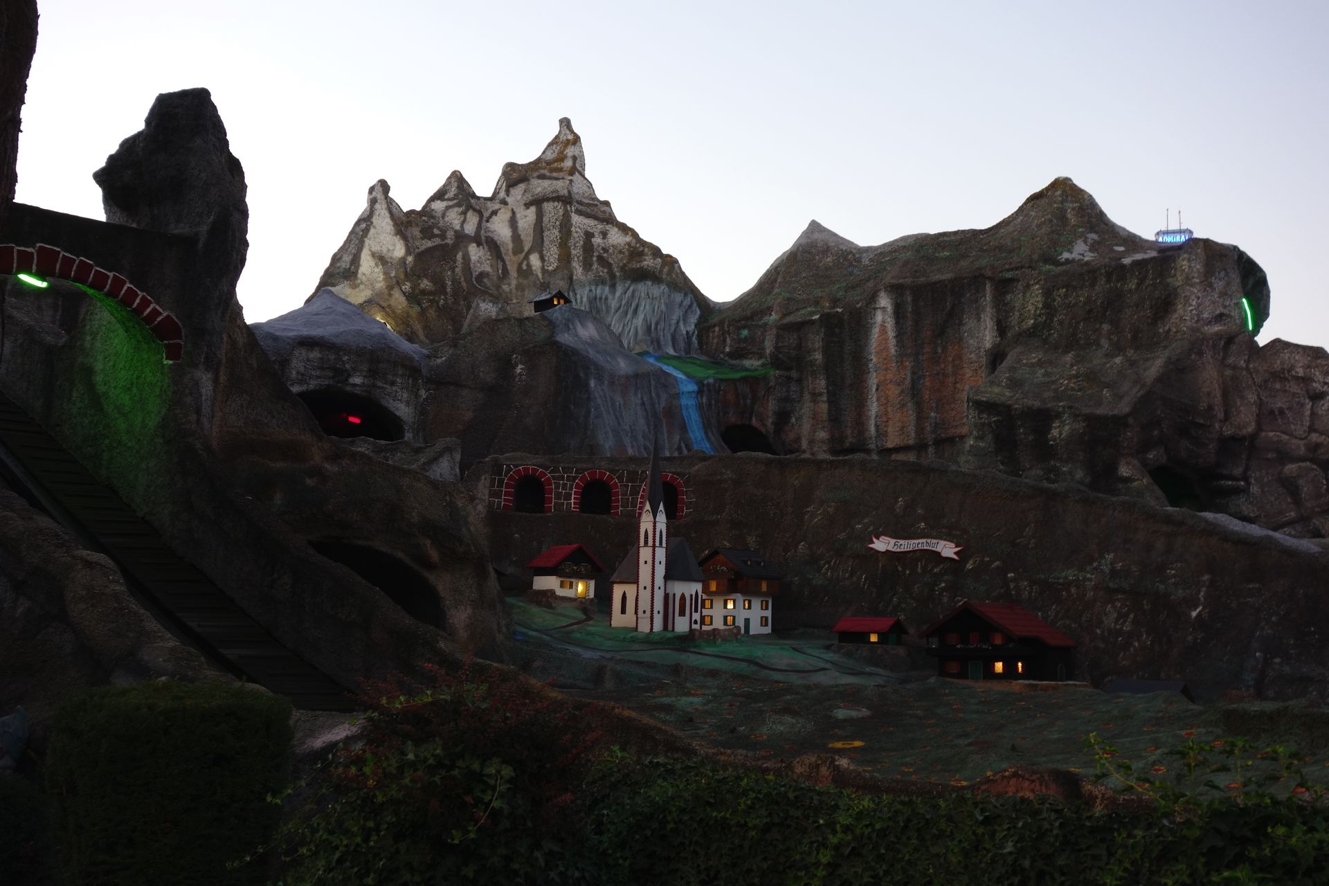 Wobei das Layout an sich weitestgehend identisch ist. Der Unterschied liegt im Spirallift, der hier auf Kundenwunsch auf die andere Ecke gesetzt wurde. Mit dem übrigen Layout einfach über Geraden verbunden. Das erhöht nicht nur die Fahrzeit bei relativ geringem Aufwand, die nicht mitfahrenden Besucher können ihre Freunde auch wunderbar bei der Fahrt zum Lift entlang des Weges beobachten und fotografieren. Wie man später noch sehen wird, geht das auch ganz gut - wenn man nachts keine zu lange Belichtungszeit eingestellt hat...
