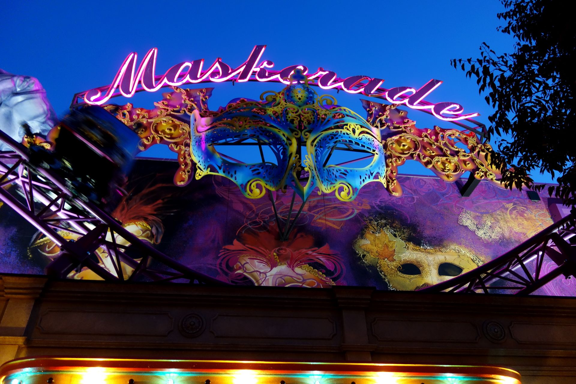 Mit einer Höhe von 10 Metern und einer Streckenlänge von 236 Metern gehört die im vergangenen Jahr eröffnete Maskerade eher zu den kleineren Achterbahnen. Nach einem kurzen Darkride-Part vorbei an spiegel- und maskenverzierten Wänden bringt ein Aufzug den Wagen nach oben. An der Hallenwand entlang geht es mit einer Kurve hinab und ebenso wieder hinauf. Es folgt der kleine Schlenker nach Draußen, bevor nach einer