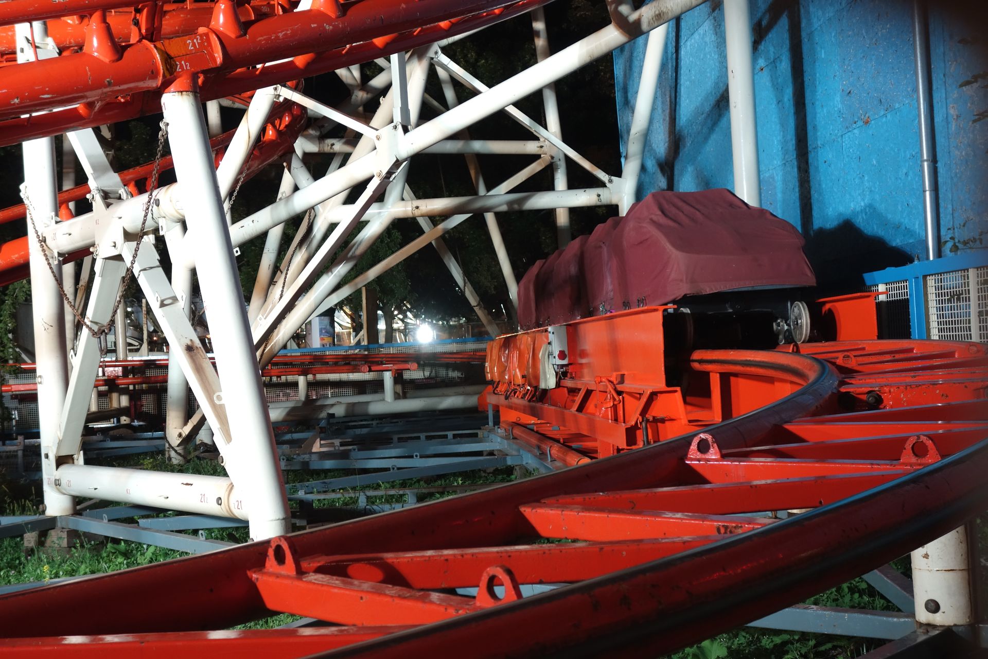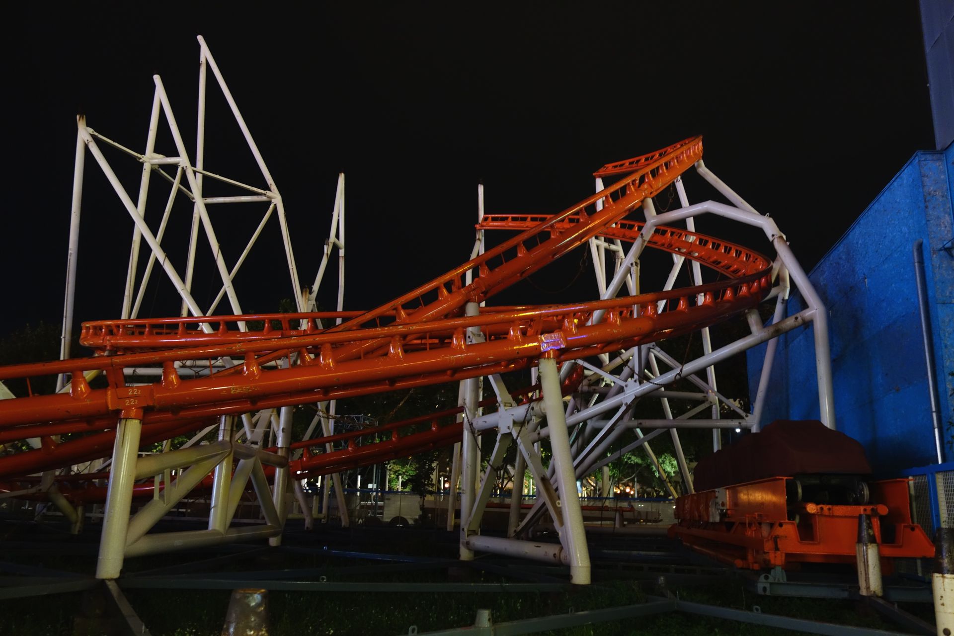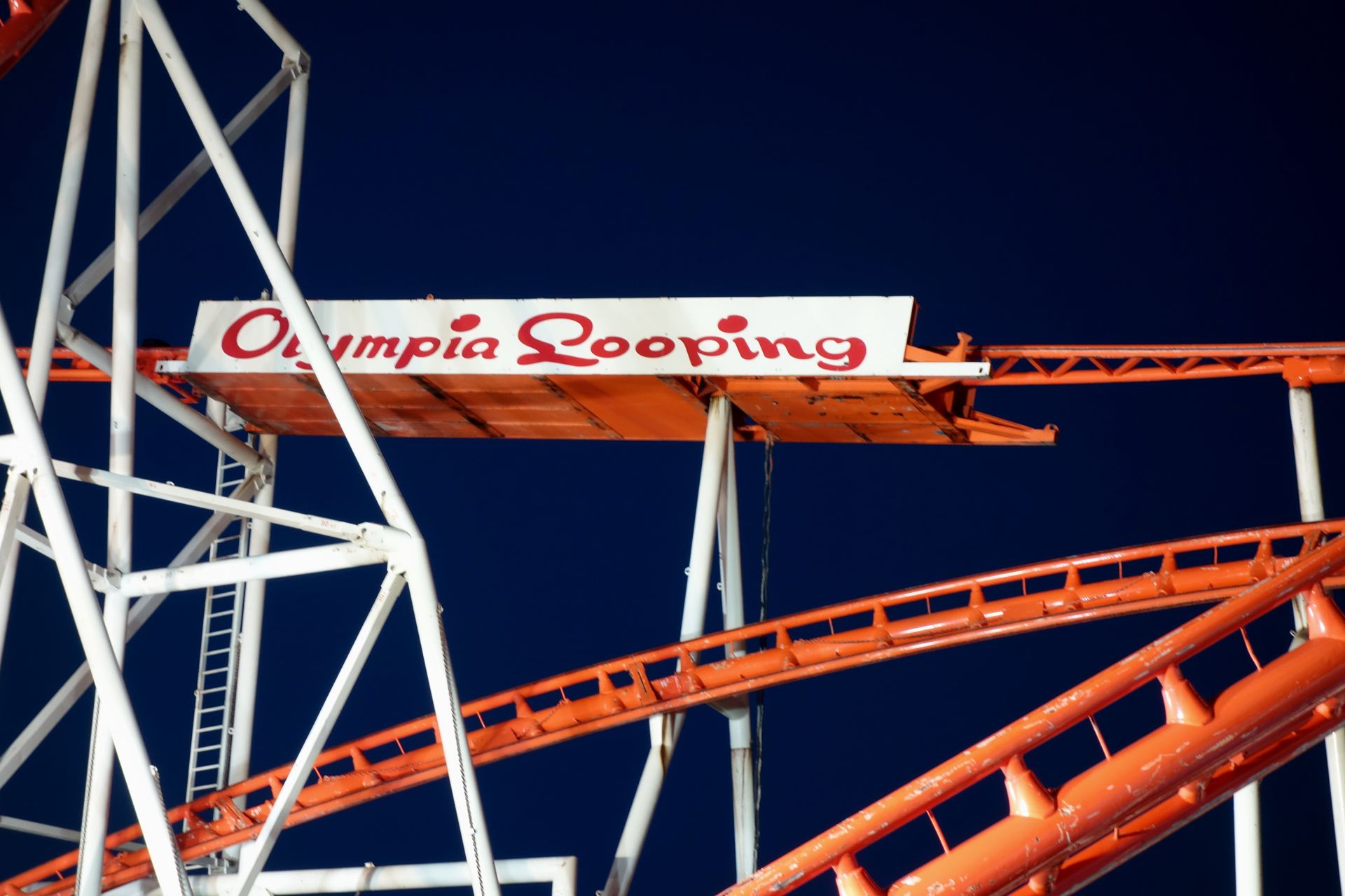 Der Olympia Looping. Sonntags Abends sollte der Abbau beginnen, die für den Betrieb unnötige Deko war bereits demontiert worden.