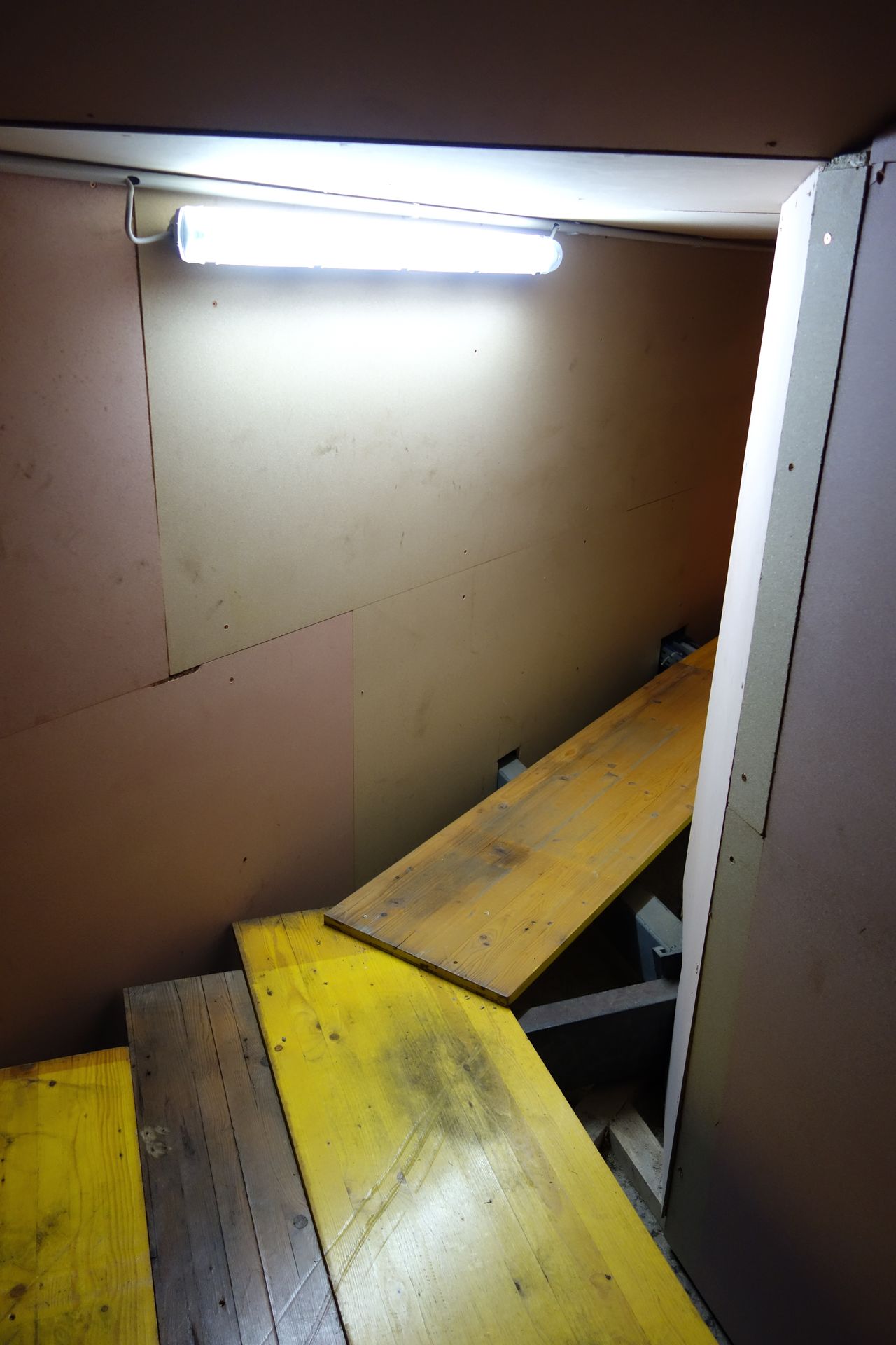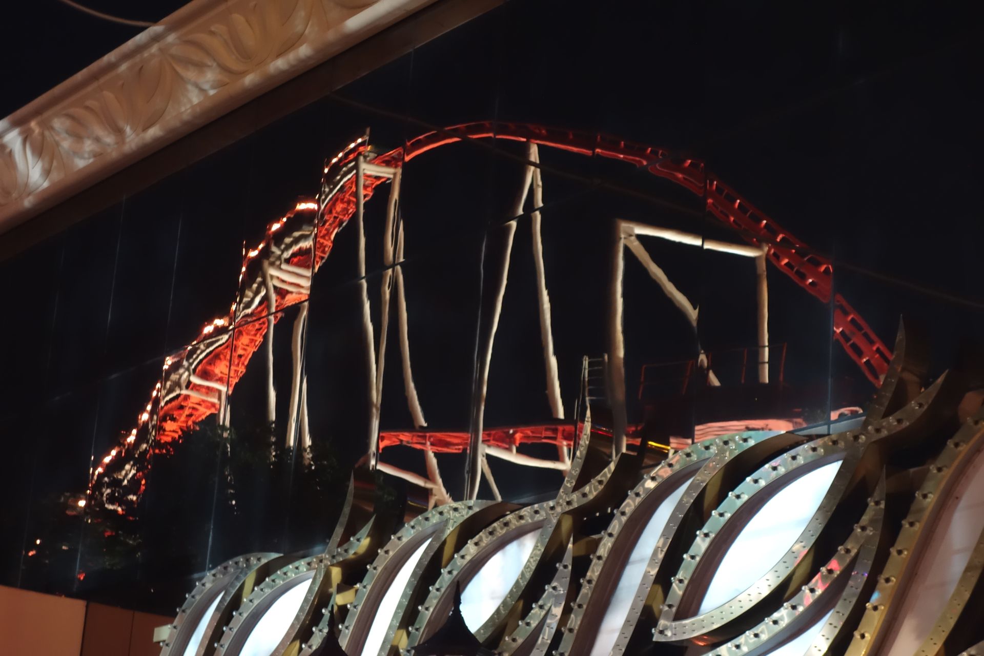 Den Tagesabschluss feierten wir wieder am Insider, wo Alex einfach mal das Steuerpult übernahm, während wir eine Runde nach der anderen drehten. Bis Christian den Weg zu uns fand und Nicolas und mich jeweils einzeln in den Backstagebereich der Bahn führte. In der Werkstatt gab es nicht so wahnsinnig viel zu sehen, erst recht nicht, als das Licht einfach ausging. Eine Sicherung schien zu spinnen. Der größere Teil des Abstellgleises befindet sich übrigens in der Haupthalle, von der Werkstatt mit einem einfachen Vorhang abgeschirmt. Weiter ging es in den Technikraum, wo quasi zwei Steuerungsanlagen zu bewundern waren. Die alte soll nämlich durch eine neue ersetzt werden. Auch die neuen Sensoren lagen schon in einem Regal bereit und warteten auf ihren Einbau. Besonders interessant fand ich aber ein Tableau, welches wohl eigentlich am Steuerstand zu sein habe. Das wäre aber scheinbar zu teuer gewesen, weshalb man einfach eine Kamera davorgehängt hat, die ein Livebild zum Ride-Op überträgt. Man muss sich nur zu helfen wissen.
