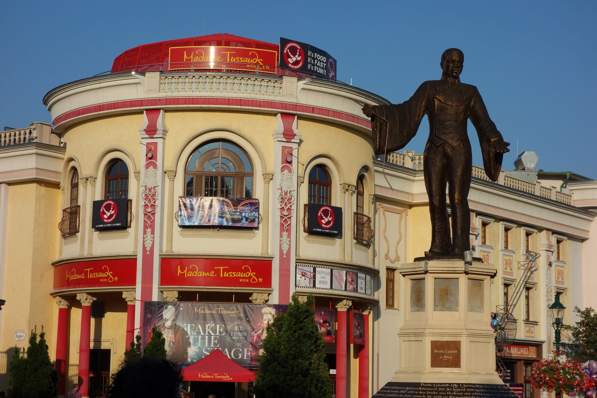 Den Eingangsplatz dominieren ein Madame Tussauds und eine Bronzestatue der Prater-Legende Basilio Calafati.