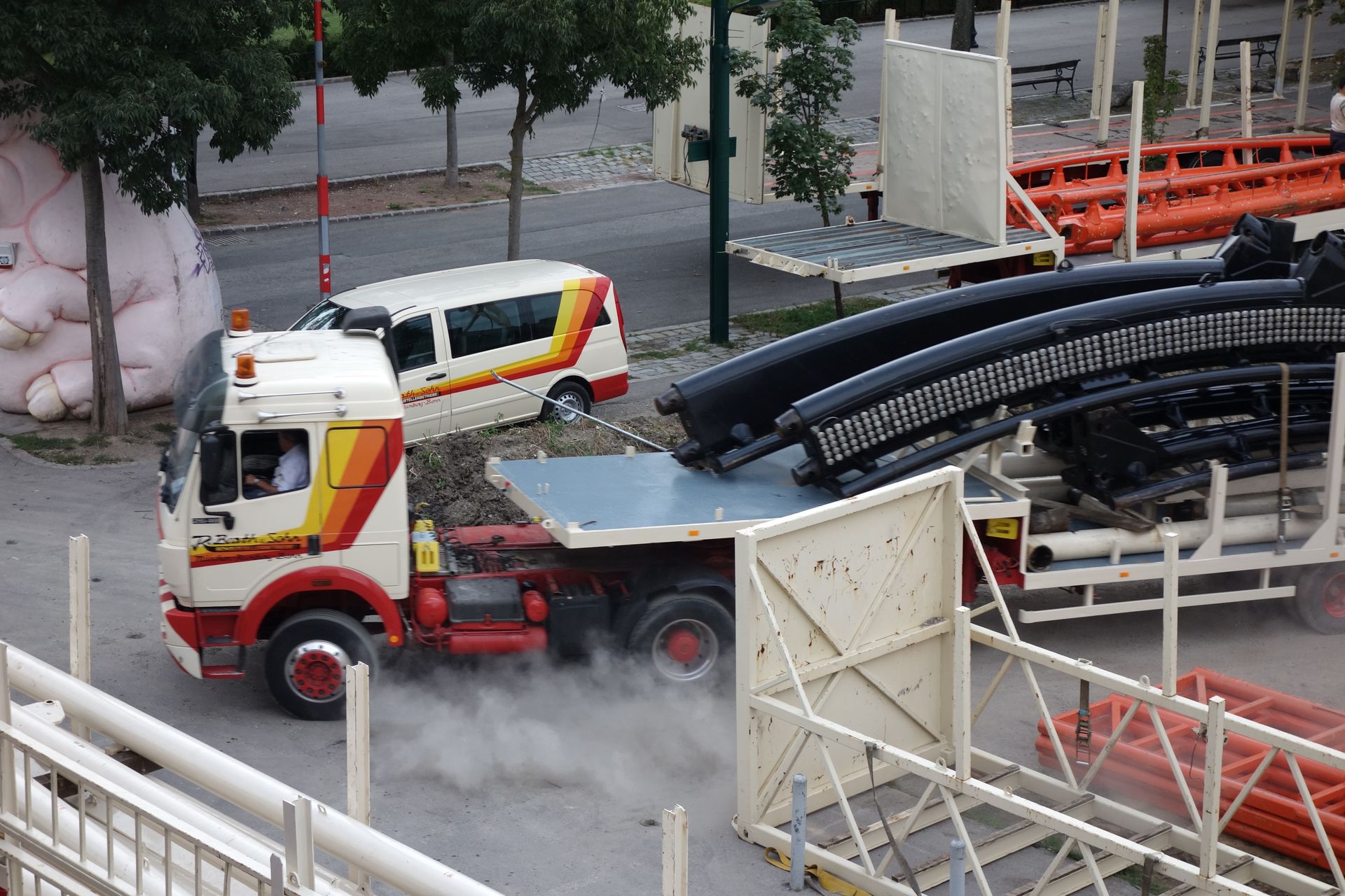 Gleich nach der letzten Fahrt wurde die Kasse zusammengepackt und zwei Mitarbeiter kletterten auf die Bahn.