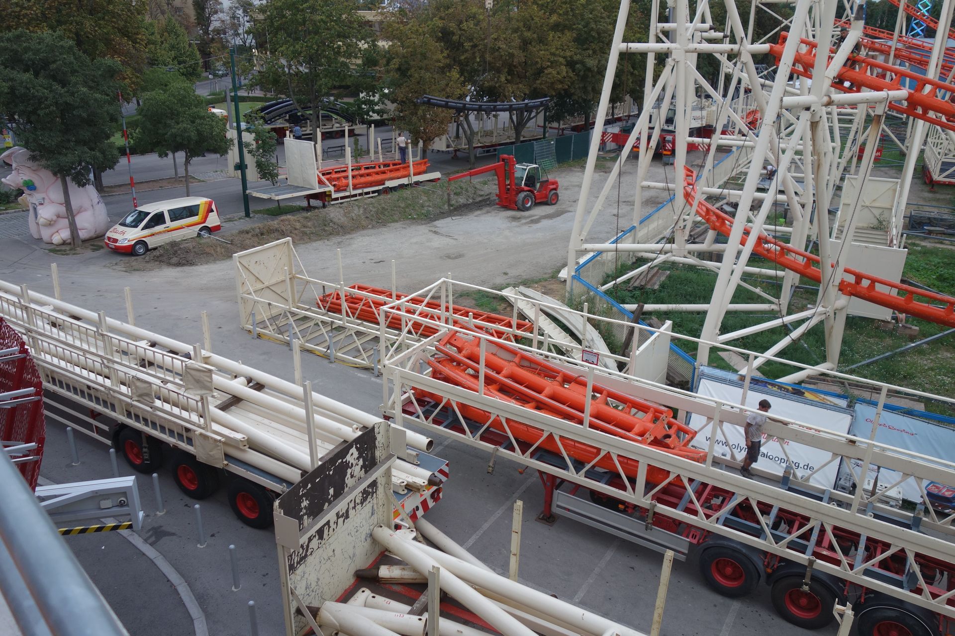 Looping um auf die letzte Fahrt des Pratergastspiels zu warten. Die Mitarbeiter standen mit ihren Handschuhen schon bereit, um direkt mit dem Abbau anfangen zu können. Die ersten Zäune an der Warteschlange waren schon abgenommen worden und die Lücken wurden vom Personal abgesichert. Auch die Kasse wurde langsam aber sicher zusammengeklappt. Als dann endlich die letzte Fahrt ausgerufen wurde, schlüpften wir durch das letzte verbliebene Tor und ließen unsere Ehrenkarten abnicken. Eingesammelt wurden sie nun nicht mehr, wir konnten sie also als Souvenir mitnehmen. Nicolas und ich wollten nach der Fahrt ganz hinten nun lieber einmal vorne sitzen, auch wenn die erste Reihe leider schon belegt war. In der zweiten wurde aber noch was frei. Die Schulterhalter waren schon von meinem Hintermann (einer der Mitarbeiter?) hinunterschoben worden, eine weitere Bügelkontrolle gab es bei mir nicht. Das war also schonmal deutlich angenehmer als Tags zuvor. Ich muss allerdings gestehen, dass es vorne doch den ein oder anderen Hakler in den Kurven gibt, der hinten nicht so auffällt. Schlimm sind die aber keineswegs. Leider war wohl nach uns noch ein ganzer Schwung Fahrwilliger gekommen, den man nicht wegschicken wollte. Und so hatten wir dann doch nur die vorletzte Fahrt im Prater bekommen. Aber hey, zwei Fahrten für lau auf dem Olympia