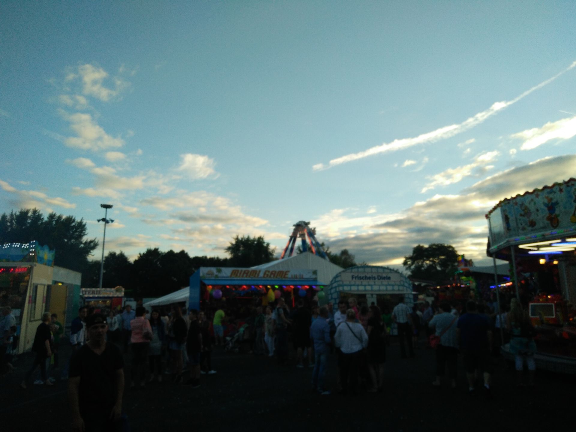 Auf dem kleinen Platz gab es außerdem eine Geisterbahn, eine Schaukel, einen kleinen Skyflyer (das dürfte das anfangs erwähnte Geblinkte gewesen sein), ein Funhouse und einen Break Dance mit hochfahrbaren Kreuzen. Der sah interessant aus und hatte einiges an Licht + Feuer zu bieten wirkte bei der von außen besehenen Fahrt aber eher langweilig. Daher nicht gefahren.