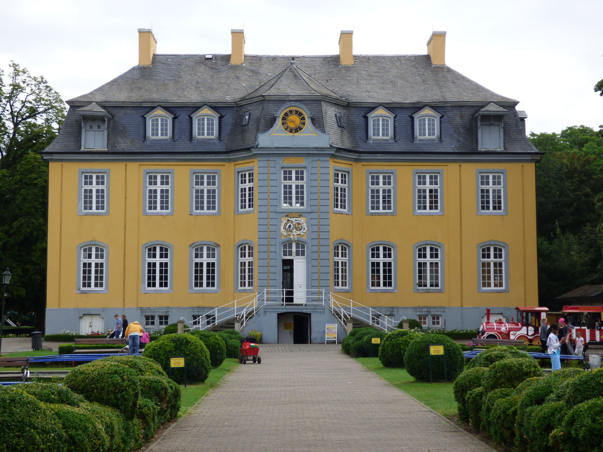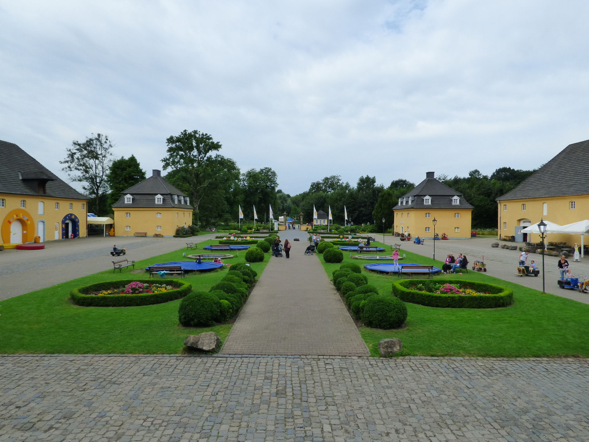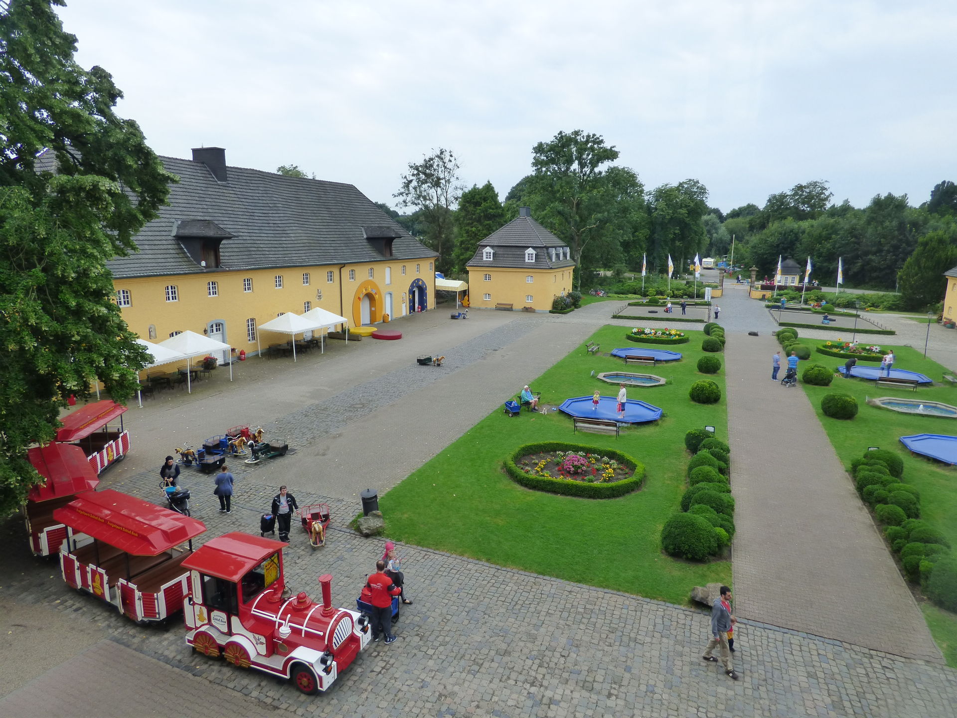 Wir hatten gerade die Brücke hinter der Achterbahn überquert, um in den anderen Parkteil zurückzukehren, da brach das große Unwetter über Bottrop aus. Es schüttete wie aus Eimer, der Himmel wurde immer dunkler, teilweise schwarz und die Wassermassen ergossen sich über Schloss Beck.