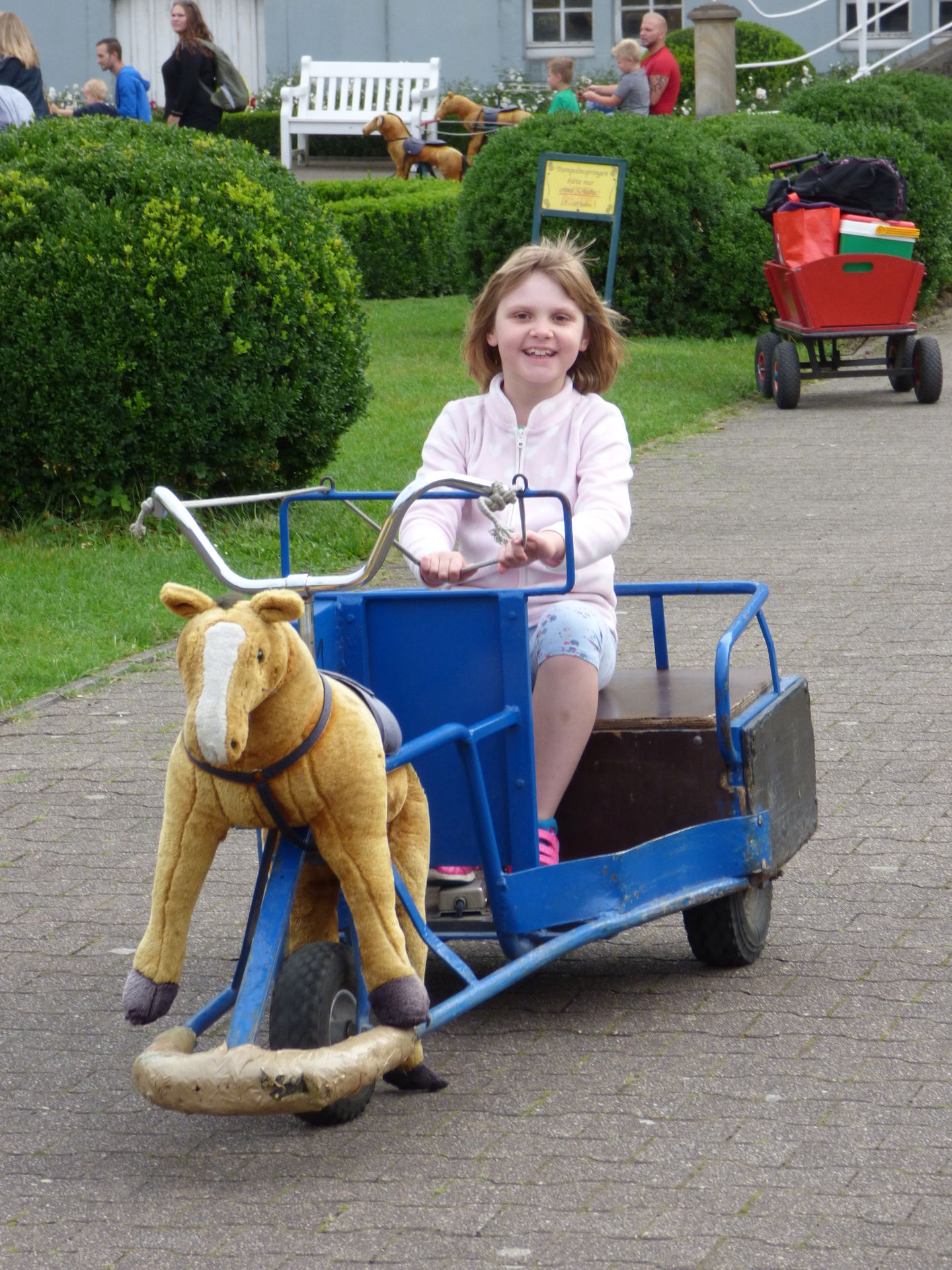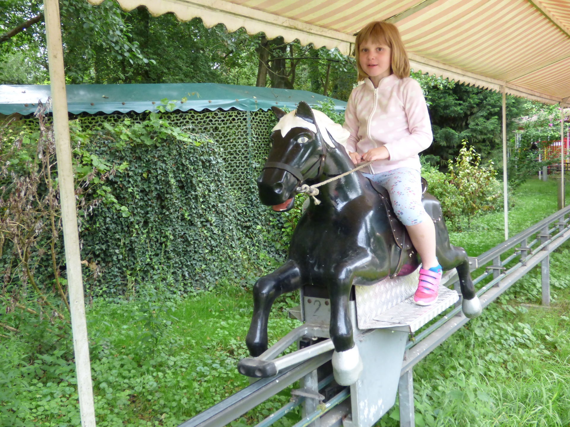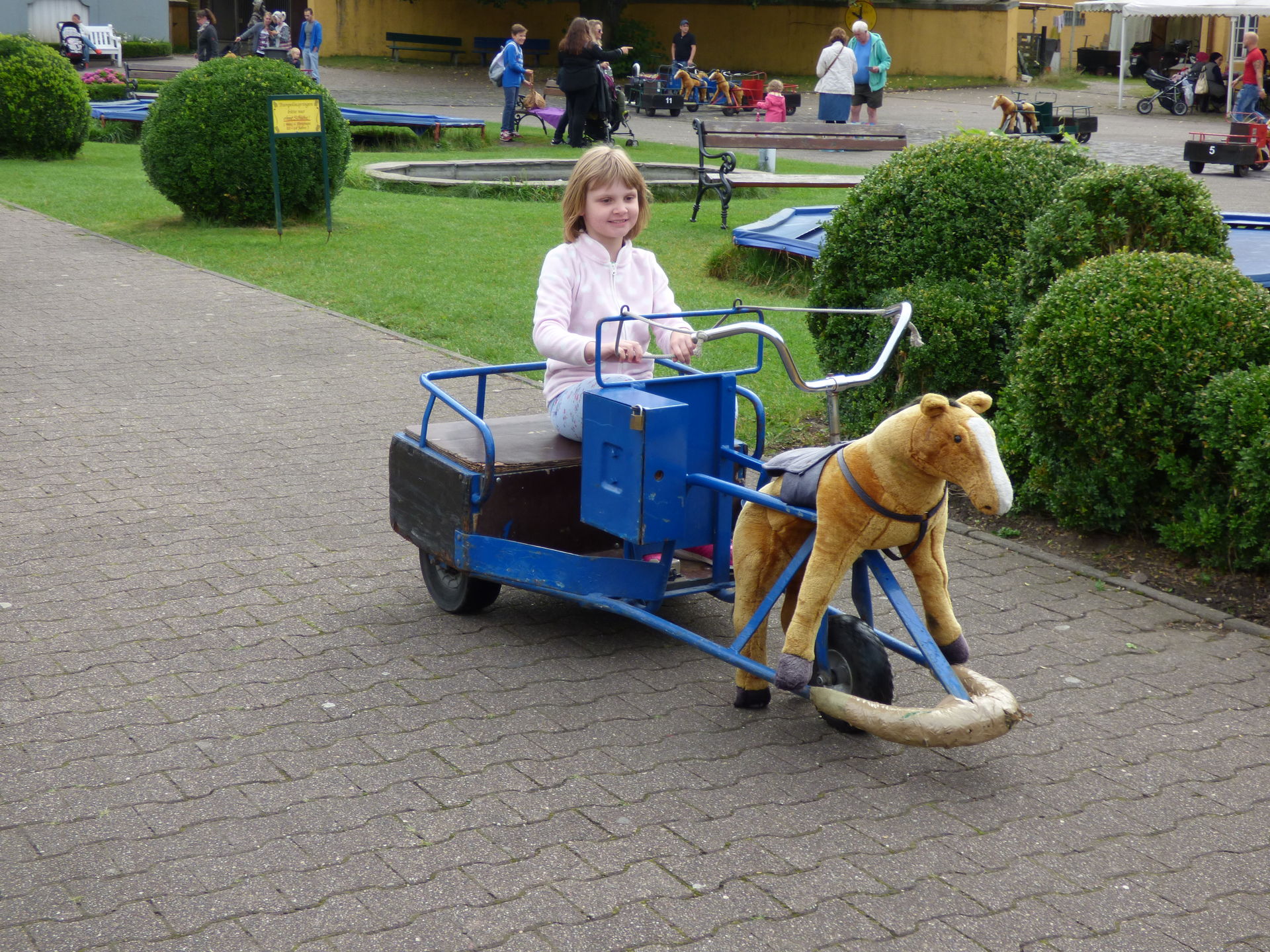 Wir beginnen aber natürlich von vorne und somit stürzte sich Mia erstmal auf die elektronischen Pferdewagen, die es immer noch gibt. Da habe ich schon als kleines Kind drin gesessen und sämtliche onrider haben sich da auch schon reingequetscht. Anschließend wurden die Trampoline getestet.