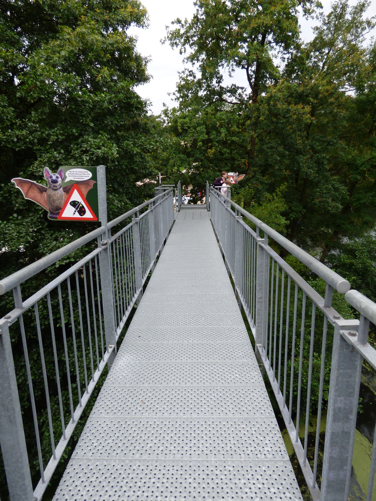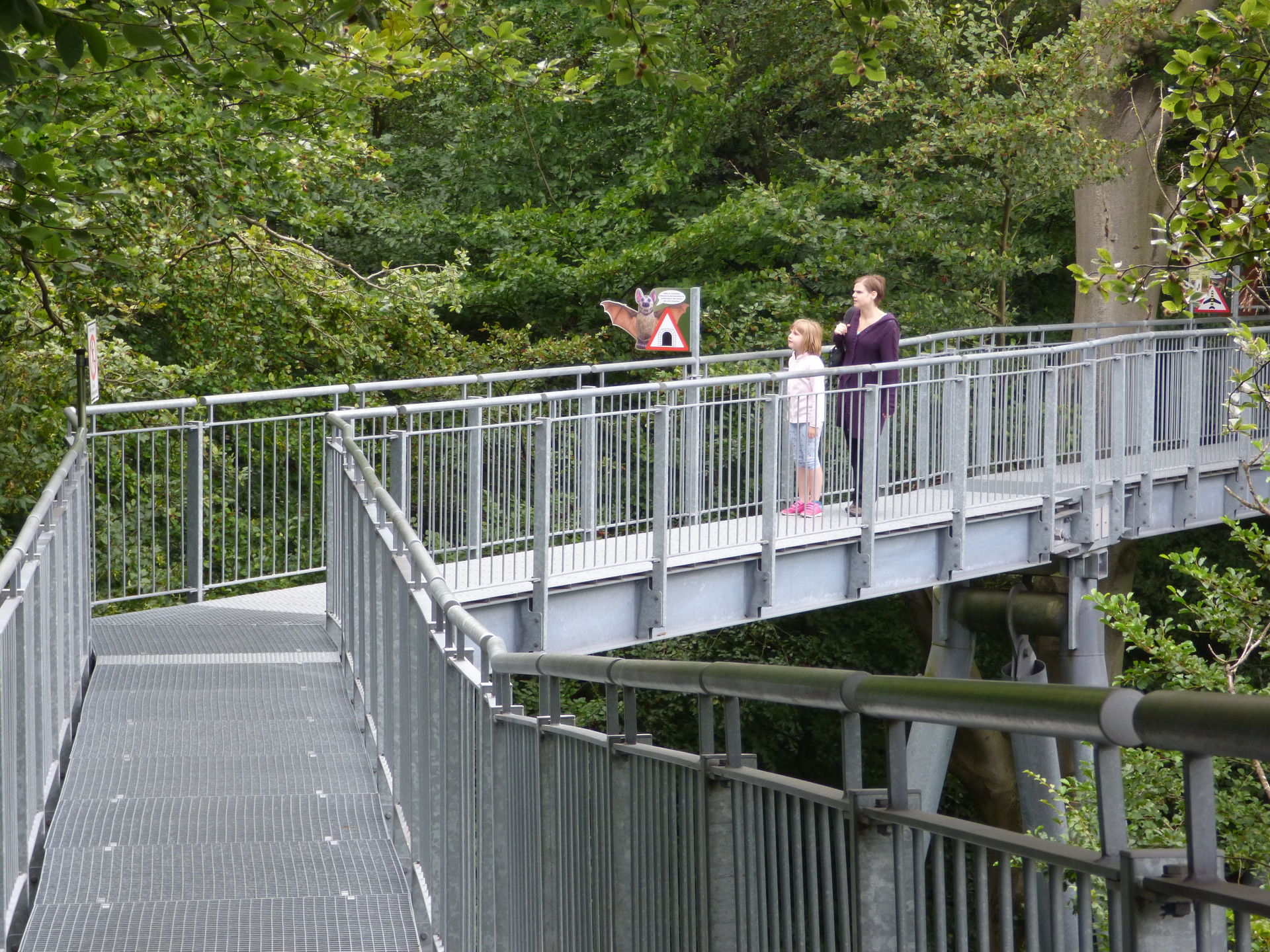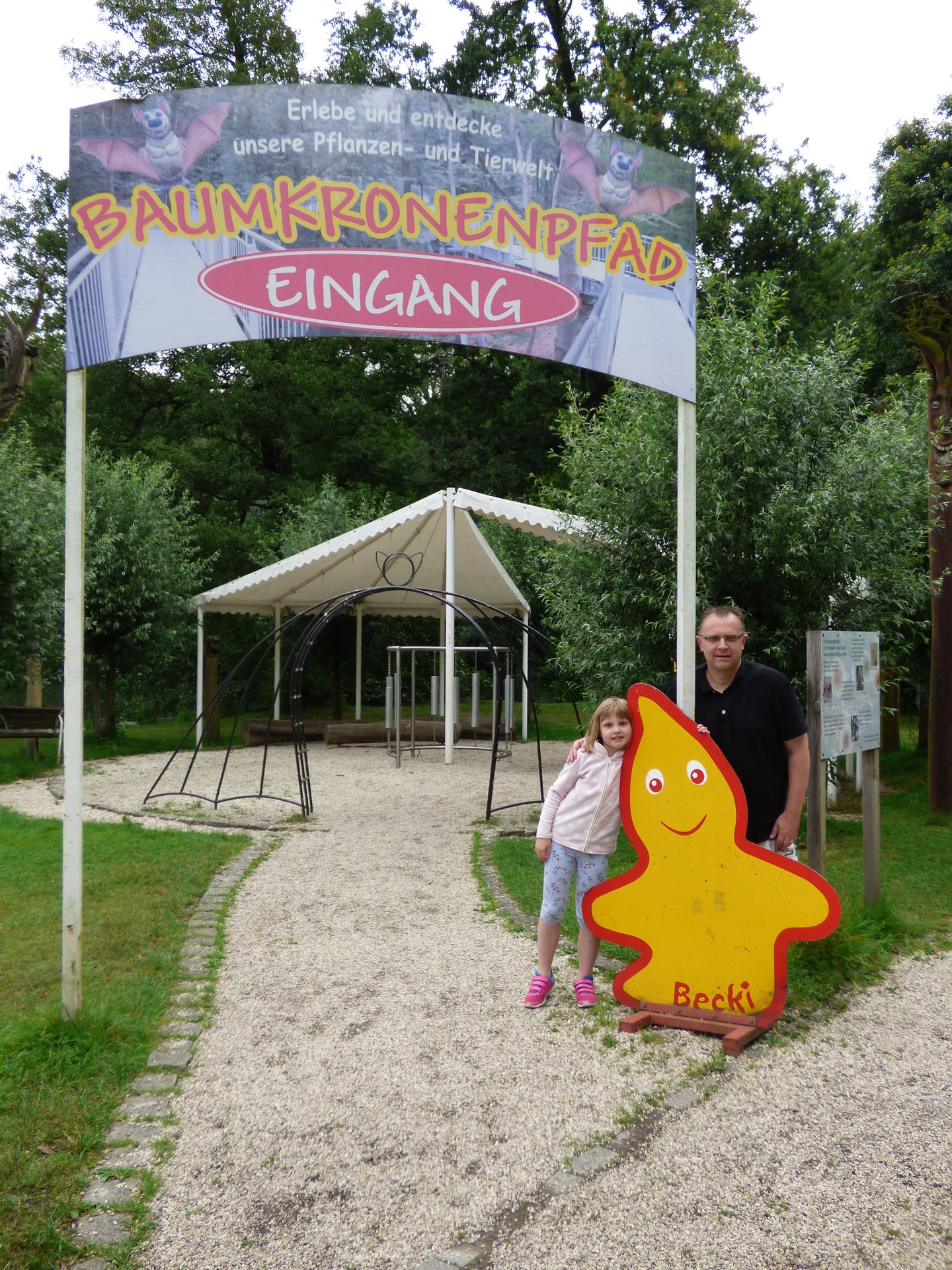 Und damit der Weg durch die Bäume für die Kiddies nicht zu langweilig ist, gibt es mehrere Stationen, an denen man was erleben kann, alles in Verbund mit den Tieren und der Natur, man muss riechen, man kann Geräusche machen, unterwegs muss man Fledermäuse in den Bäumen suchen, Fragen beantworten und und und.