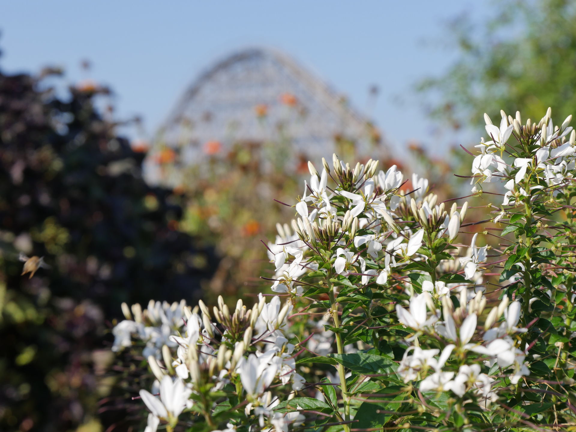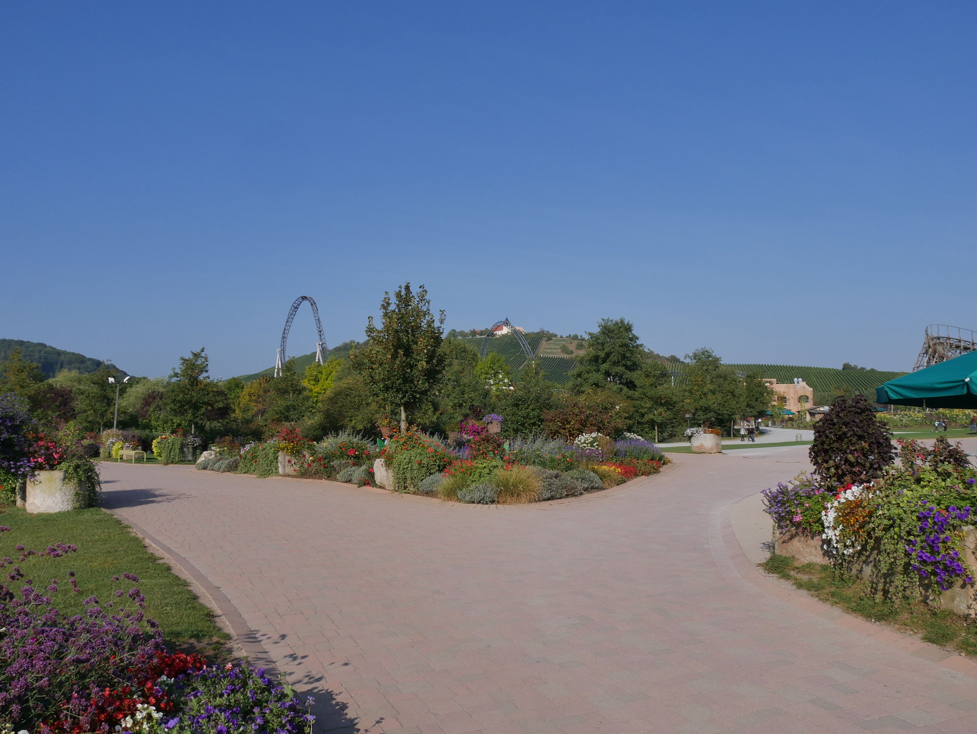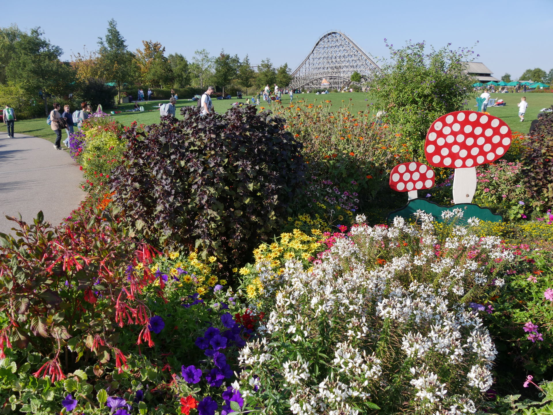 Nach der Begrüßung ging es auf die erste Runde durch den Park. Um die Attraktionen sind viele schöne Grünanlagen und Blumenbeete angelegt...