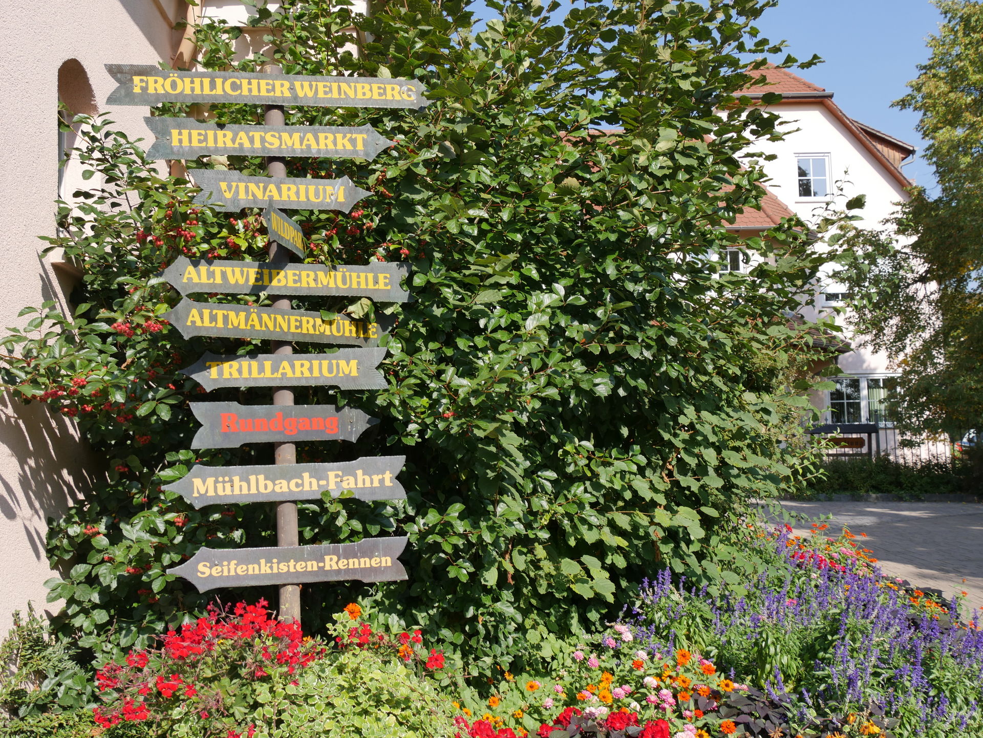 Zur Backstageführung um 11 Uhr ging es nun zurück vor das Gasthaus zur Altweibermühle.